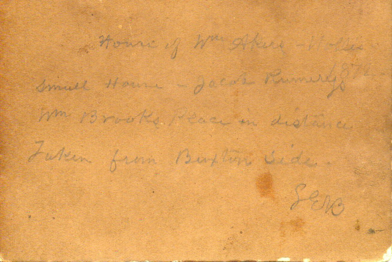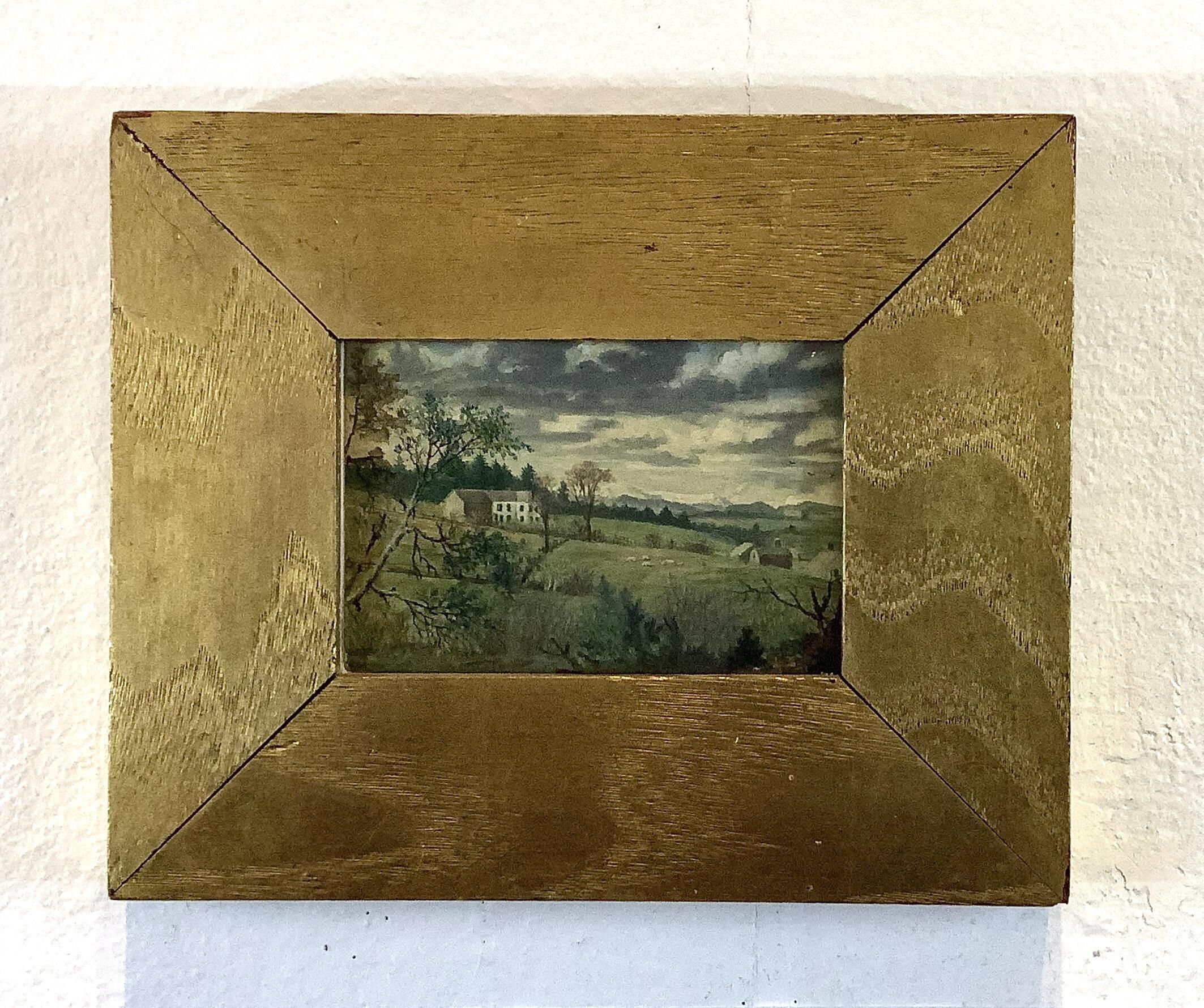 Oil on board landscape of rolling hills with mountains in the background. To the left William Akers house on the hill in Hollis. The small house to the left is Jacob Rumery's and William Brooks place is in the distance. Sheep graze on the hills. There are large snow-capped mountains in the distance. The view was painted from the Buxton side of the Saco River looking toward Hollis. In a wide gold-painted wooden frame.Made/Created