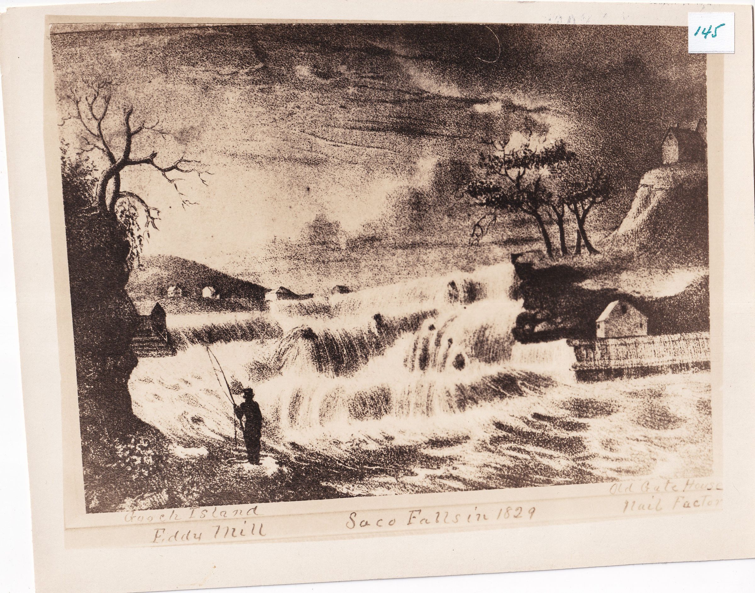 Photograph of a painting or drawing of the Eddy Mill on Gooch Island, the Saco Falls, and the nail factory in 1829.Made/Created