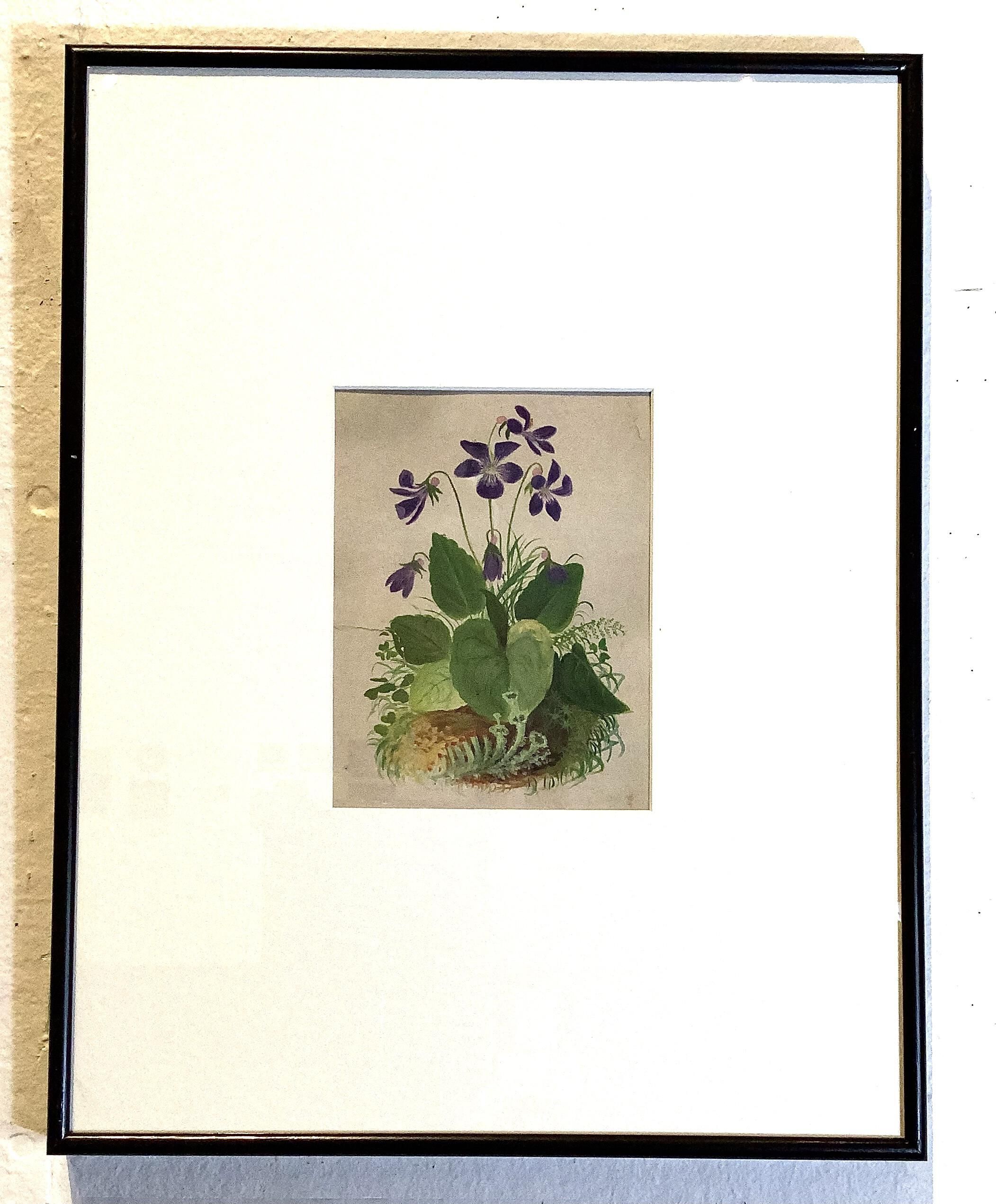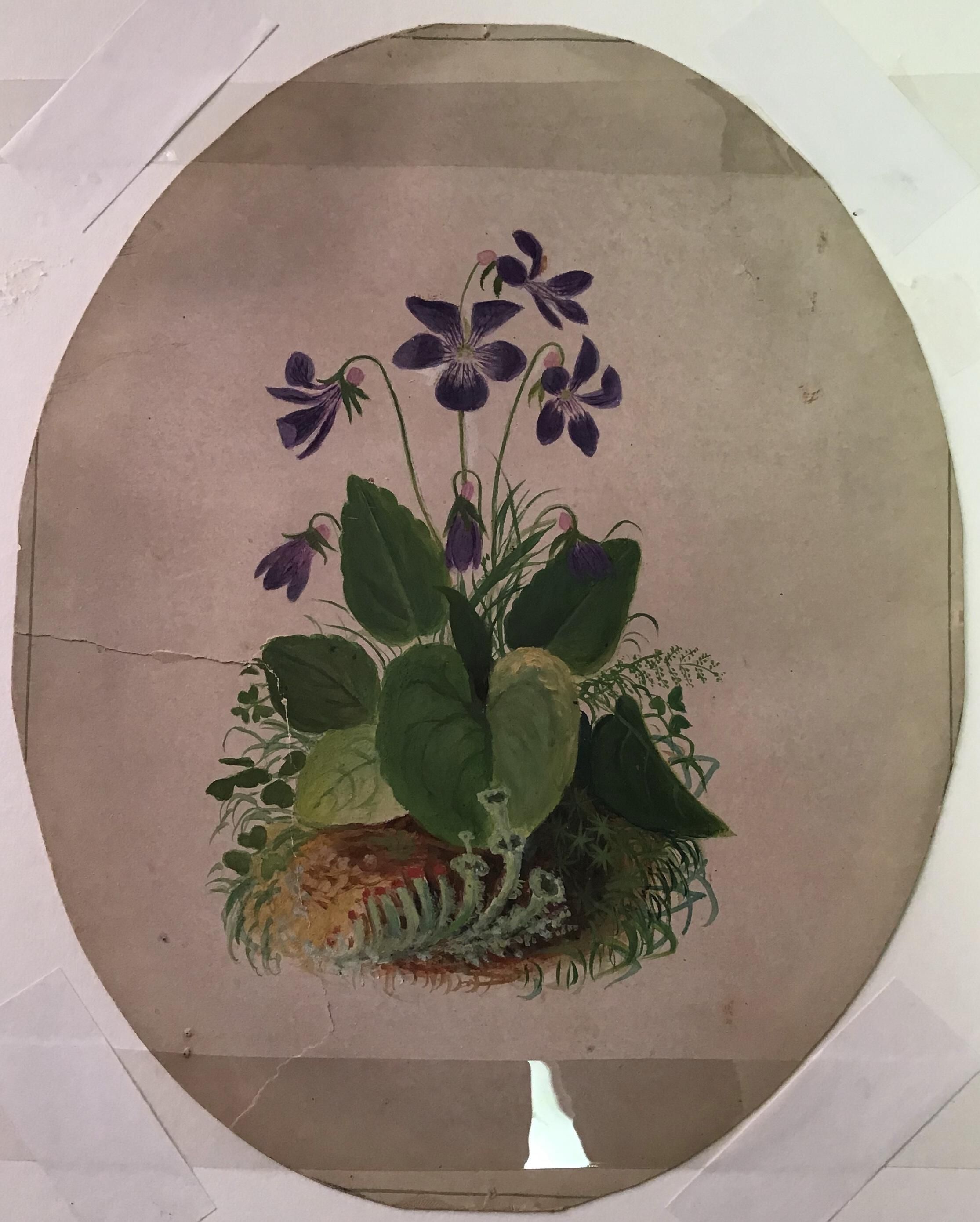 Gouache on board painting of wild violets, originally framed in an oval frame.Made/Created