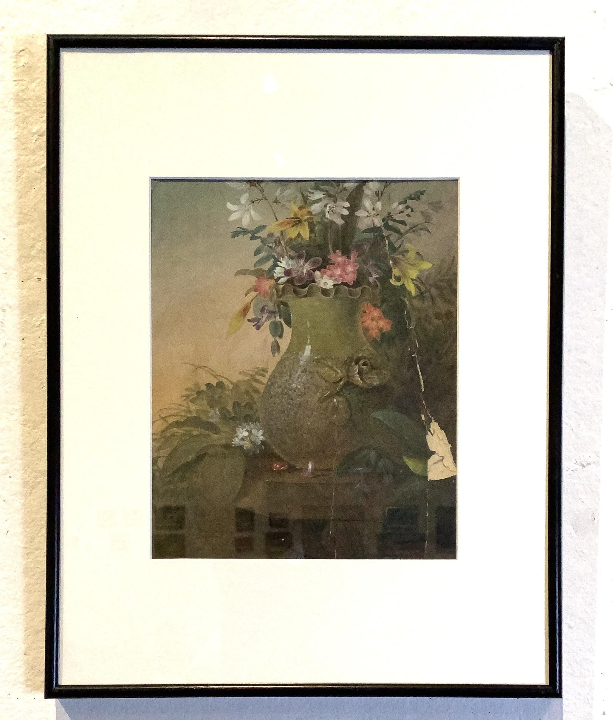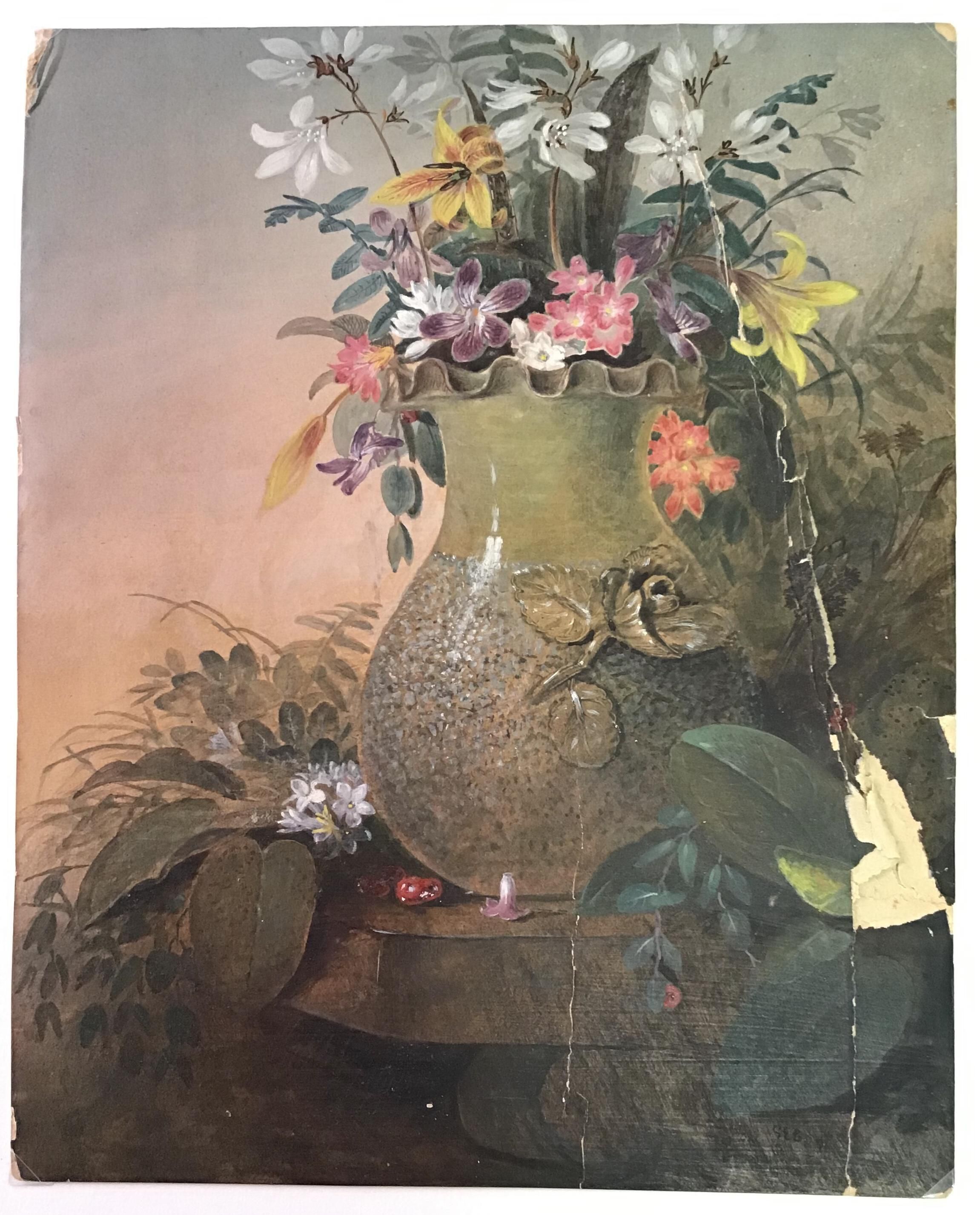 Oil on board painting of flowers in a pea-green sanded majolica vase with fluted rim and applied flower. White, pink, yellow, and purple flowers are in the vase on a stand with vegetation surrounding it. Written in pencil on the reverse: "Mary Woodman".Made/Created