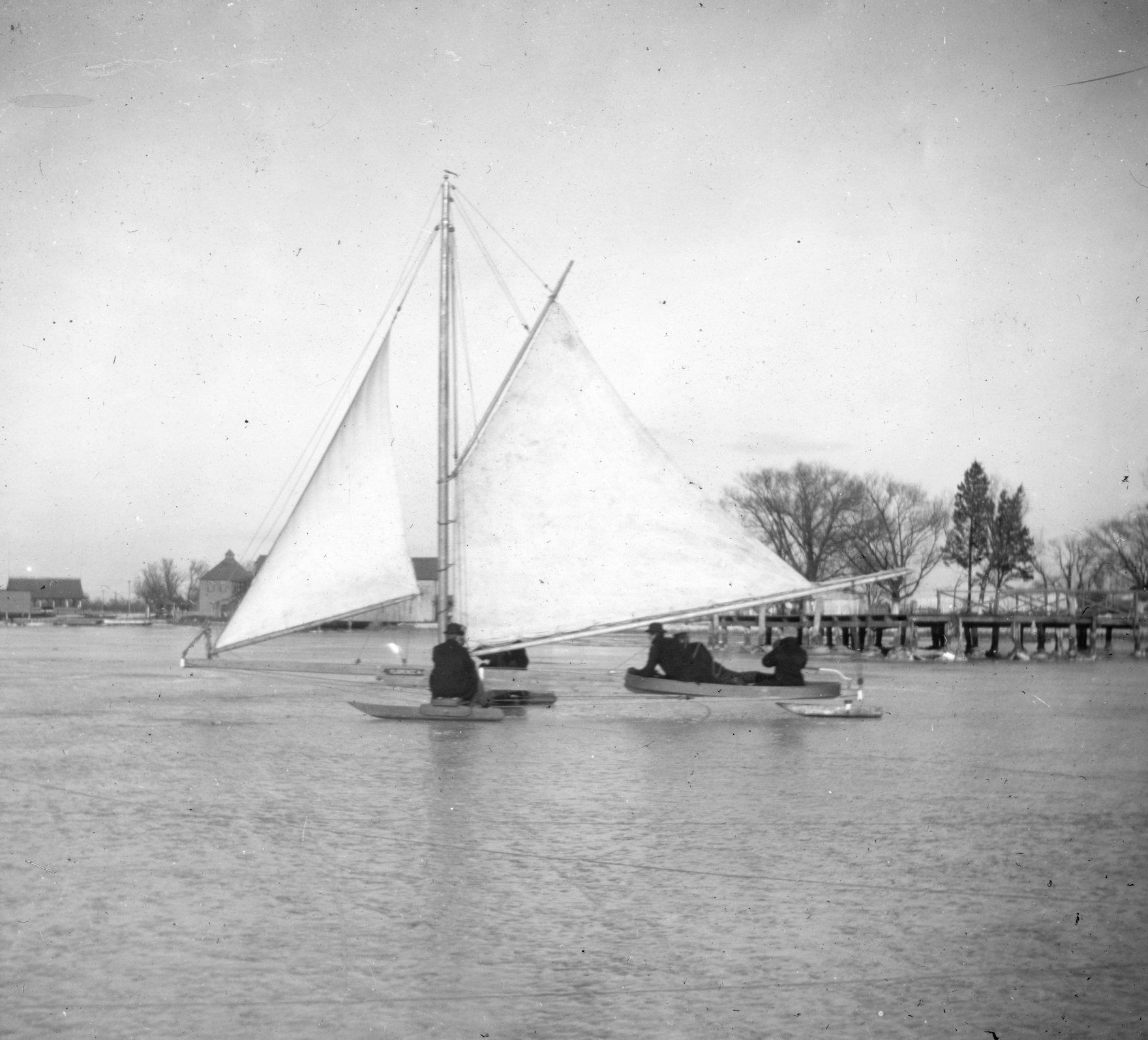 Glass lantern slide of "Ice Boating, Shrewsbury River" as written on the label on the slide. Shrewsbury River is in New Jersey and flows out to the Jersey Shore.