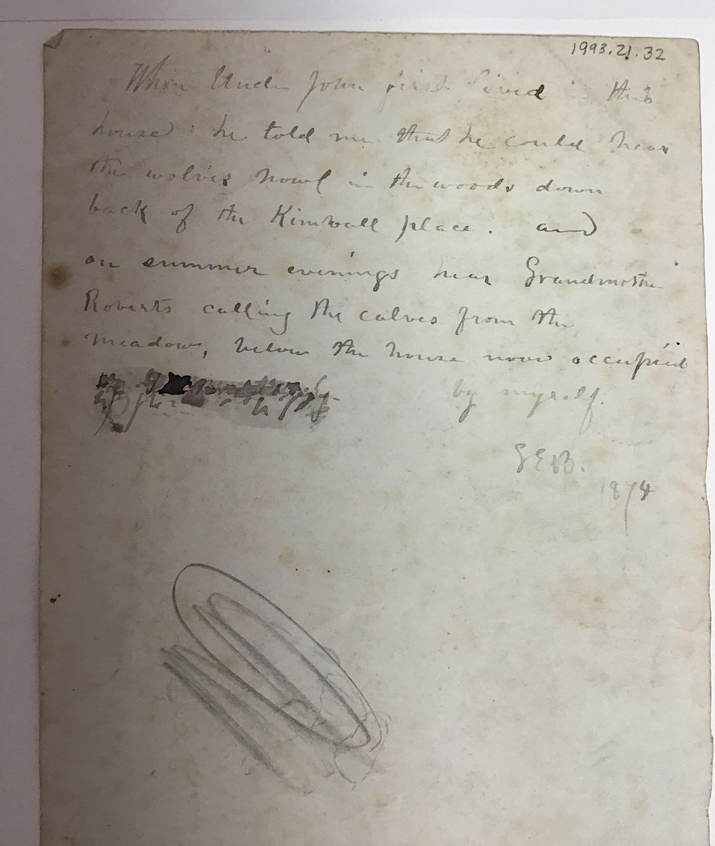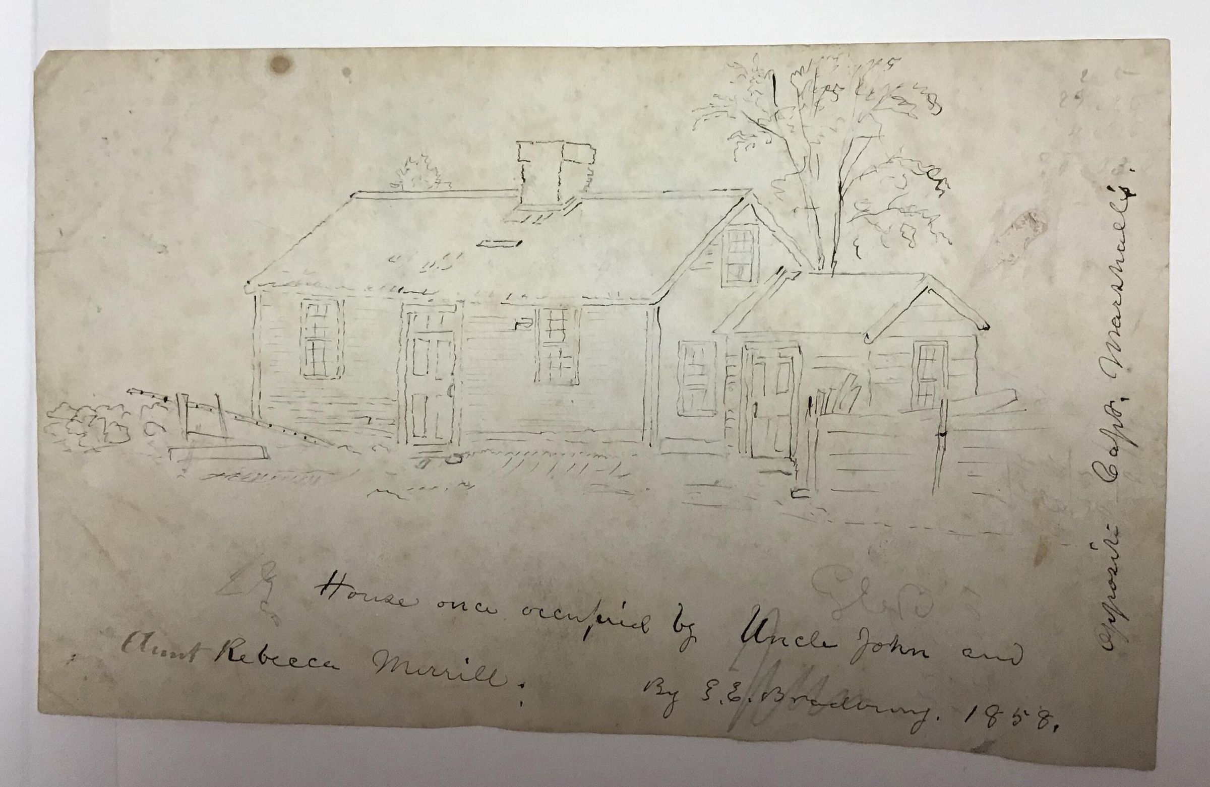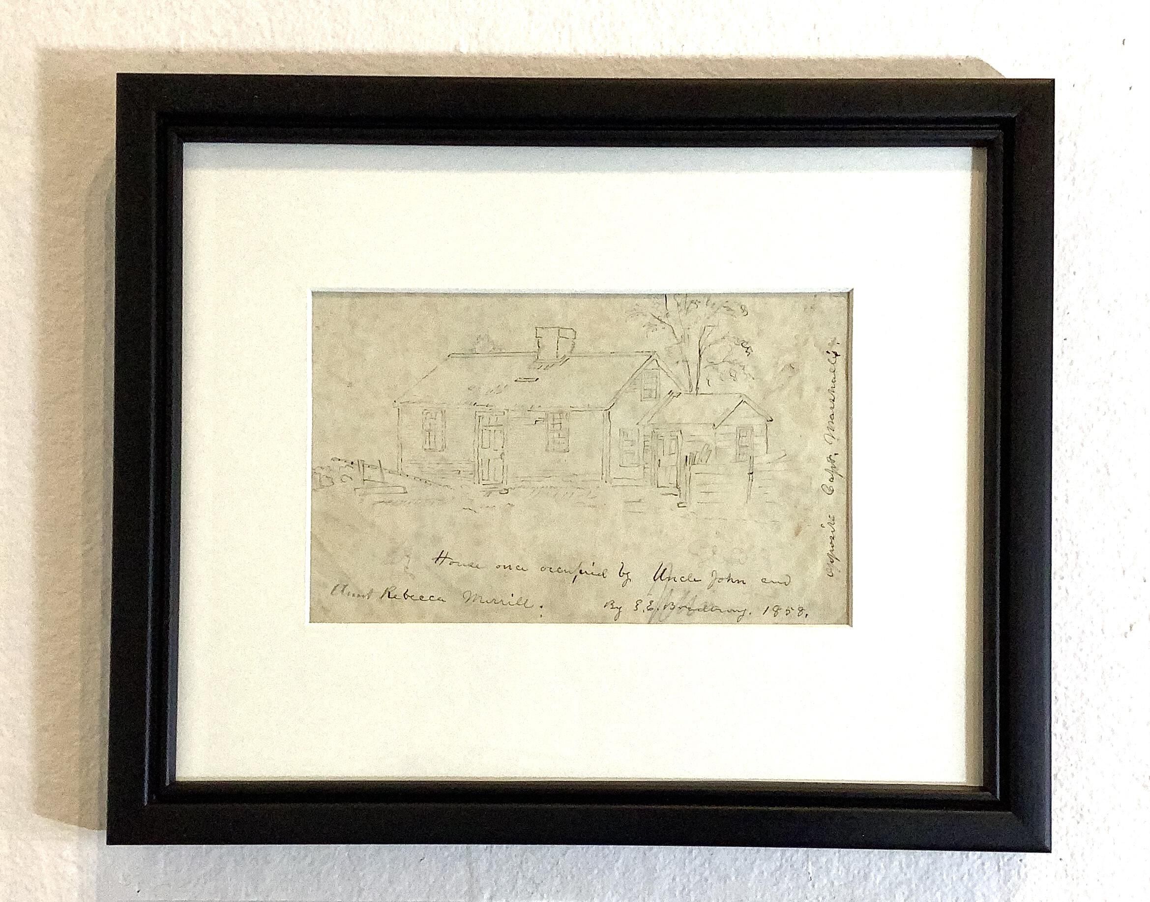 Ink on paper drawing of the house once owned by John and Rebecca Merrill, Bradbury's uncle and aunt. The clapboard story and a half cape house has a center chimney, a window flanking each side of the front door, and an small attached ell on one side. Handwritten in script below the drawing is: "House once occupied by Uncle John and Aunt Rebecca Merrill" Along the right side "opposite Capt. Marshall's" On the reverse is a long inscription; see the notes field.Artwork Details