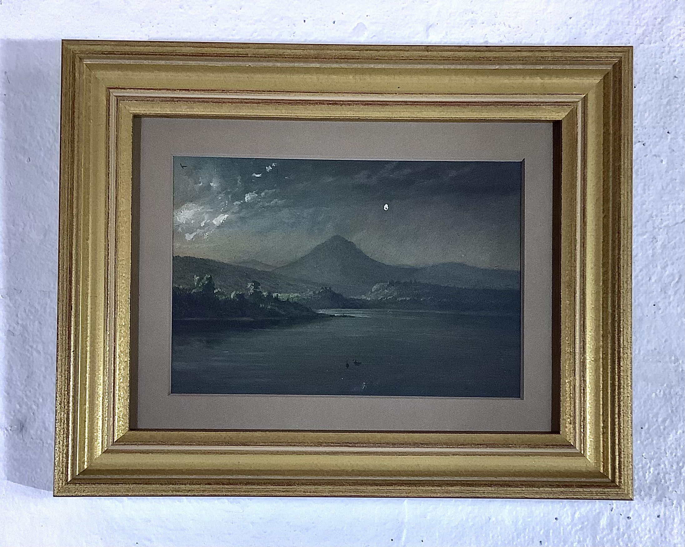 Gouache on board scene of Lovewell's Pond in Fryeburg at dusk with ducks in the pond and mountain in the center background; light in the sky comes from the left. Inscribed on the back in Bradbury's handwriting: "Lovewell's Pond" Rainy Day / '93 / by G.E. Bradbury / Buxton, ME".Made/Created