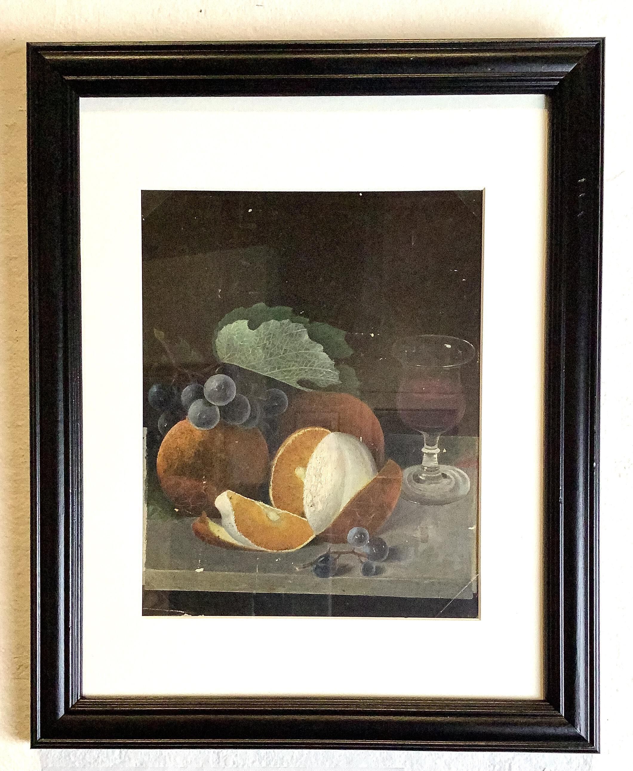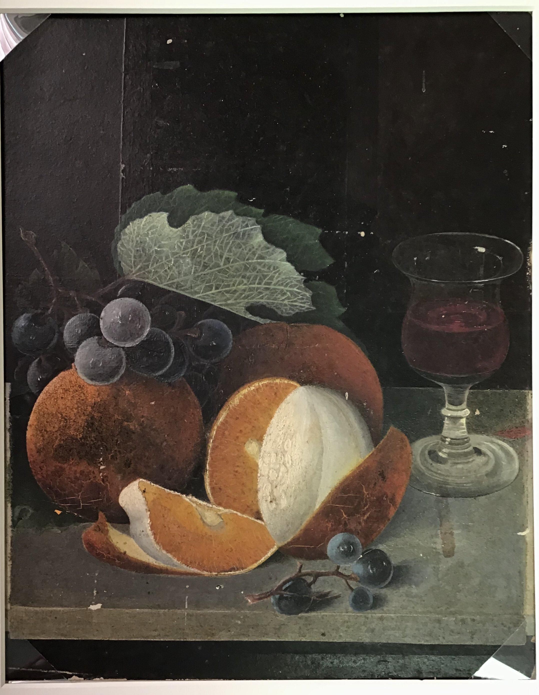Oil on board still life painting of a bunch of grapes and two oranges, one peeled, and a glass of red wine on a table. Dark background. On the reverse: "[obliterated]/Buxton,/ME", possibly Jeannie Bradbury.Artwork Details