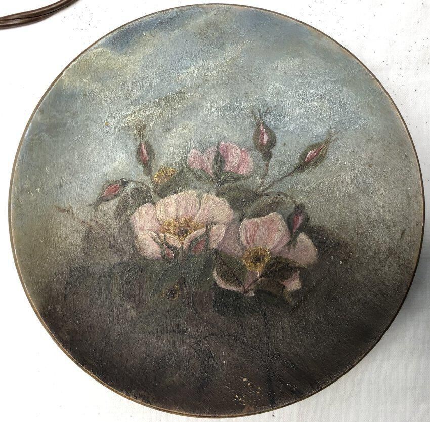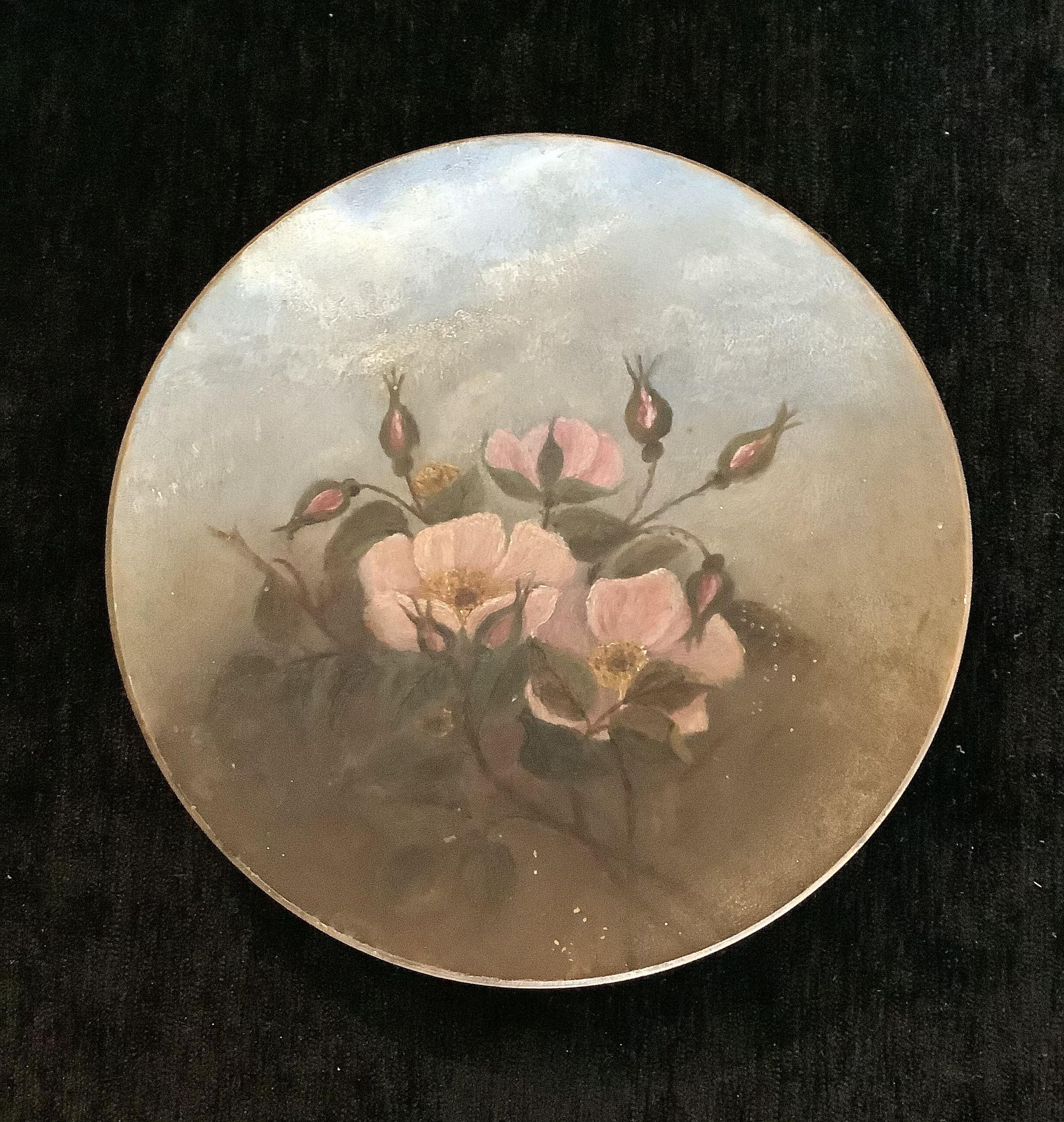 Wild roses, oil on wooden plate, attr. Jeannie BradburyArtwork Details
