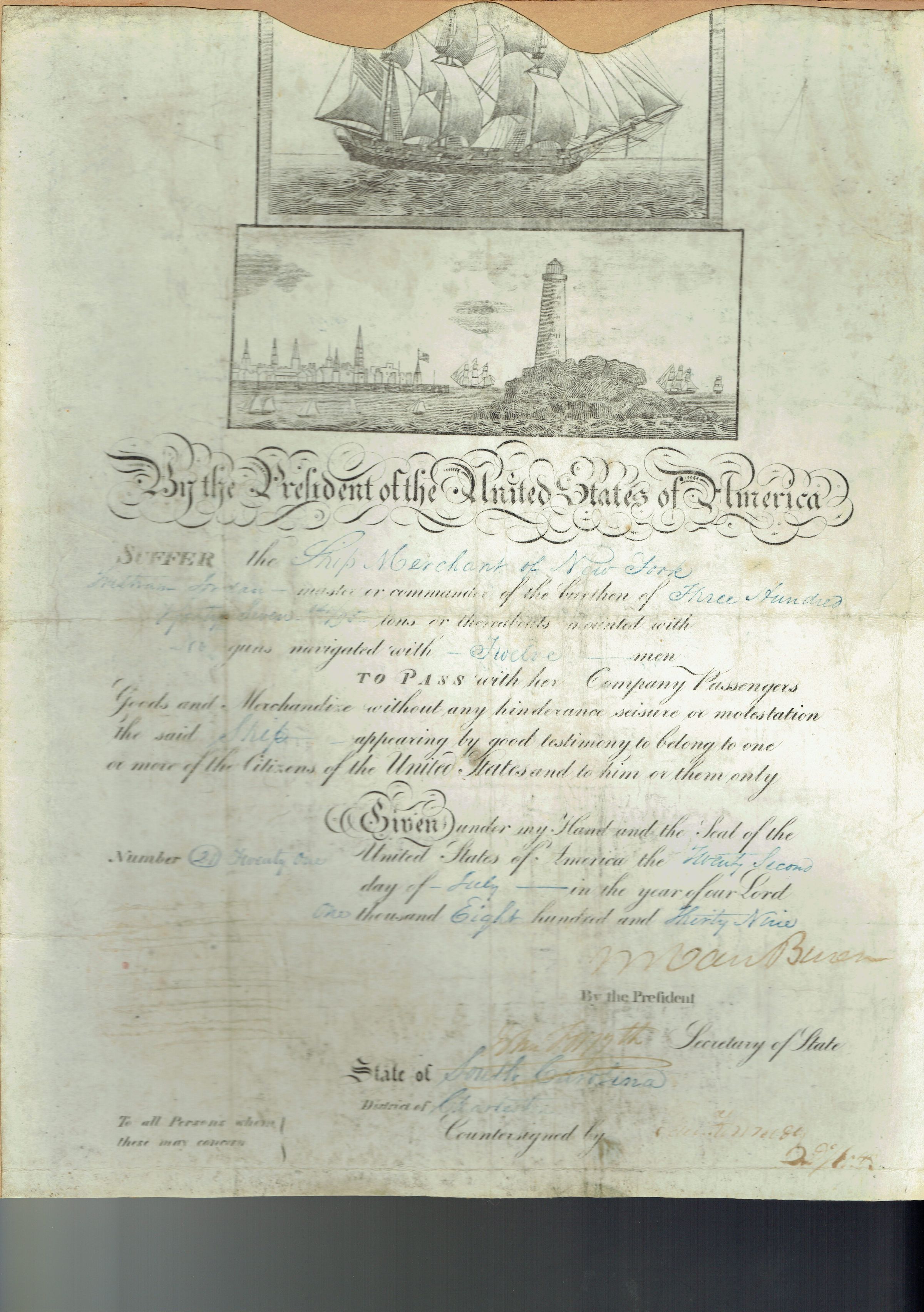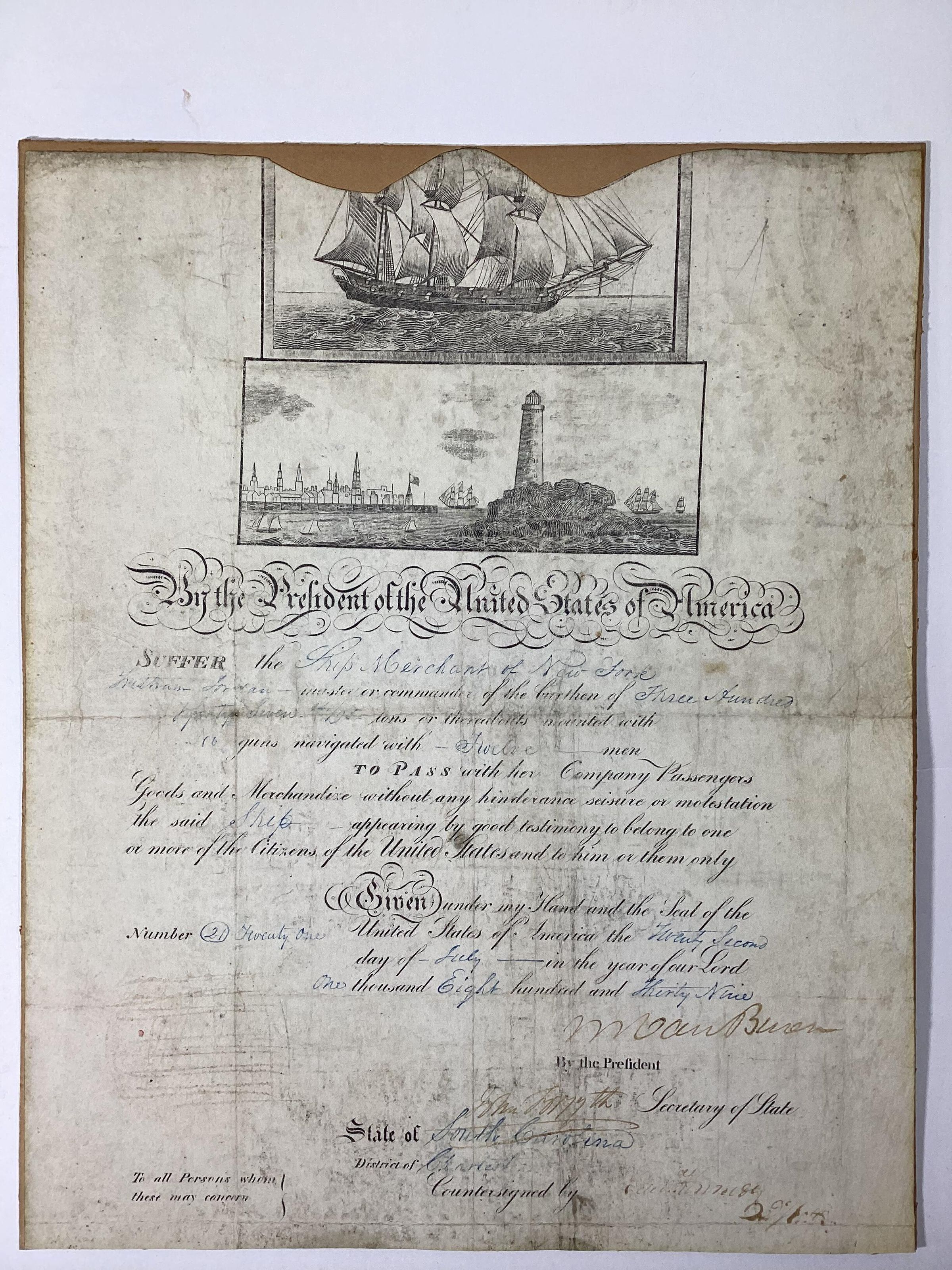 The Mediterranean Passport, more commonly called a ship's passport, was created in 1795 after the United States signed a treaty with Algiers. After the Revolution, the United States was one several countries paying tribute to the Barbary states in order to ensure that their vessels could trade in the Mediterranean without interference. The Passports were issued only to vessels that were completely owned by American citizens and served as evidence of official nationality. The documents were printed by the United States government and signed by the President, Secretary of State, and Customs Collector. The scalloped line at the top of the form served as a method of identification. After the forms were printed, the paper was cut and the top portion sent the American Consuls along the Barbary coast. The Consuls provided copies to the ships of the Barbary states, whose commanders were instructed to let all vessels pass whose passports fit the scalloped tops. Every American vessel sailing in this area had to have a passport as part of its papers. This passport was signed by President Martin Van Buren for the ship Merchant out of New York. The ship's captain was Tristram Jordan of Saco.