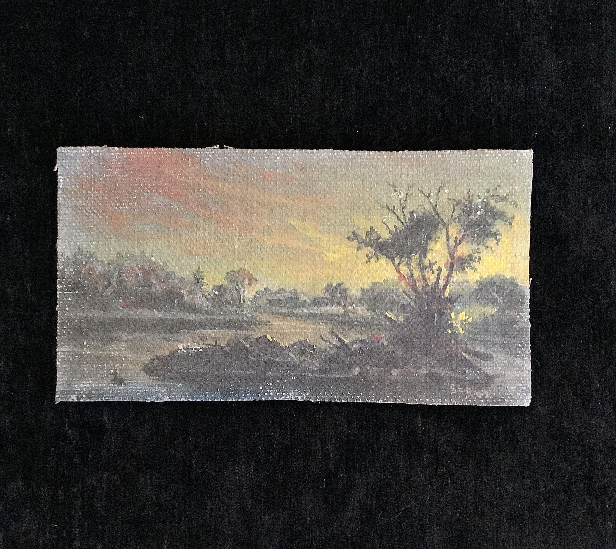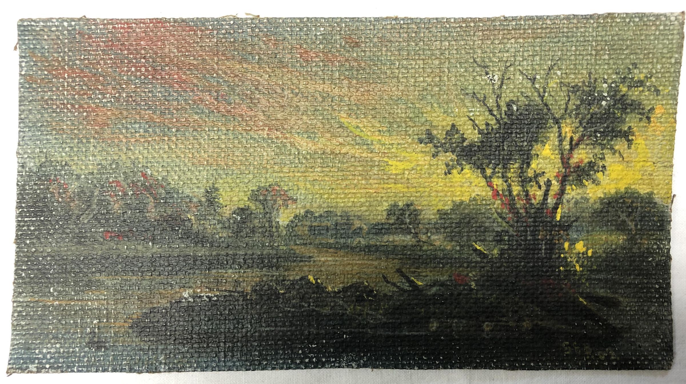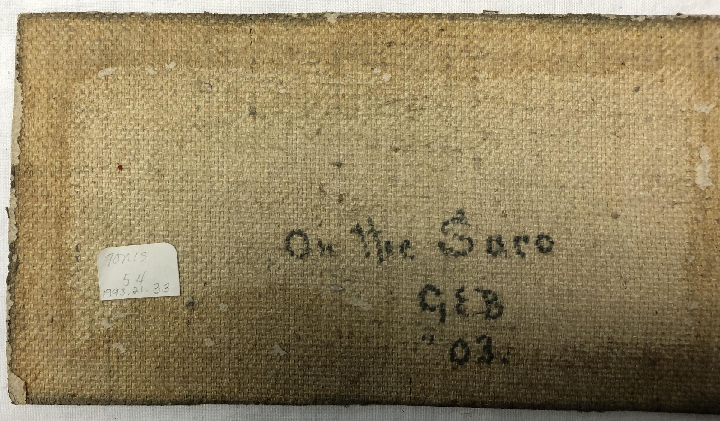 Oil on canvas painting of the Saco River, no frame. A sunset scene on the river with a red and yellow sky and a large tree in the foreground along a rocky bank on the river. A small duck swims in the river to the left. Painted in black in Bradbury's handwriting on the back of the canvas: "On the Saco / GEB / 03"Made/Created