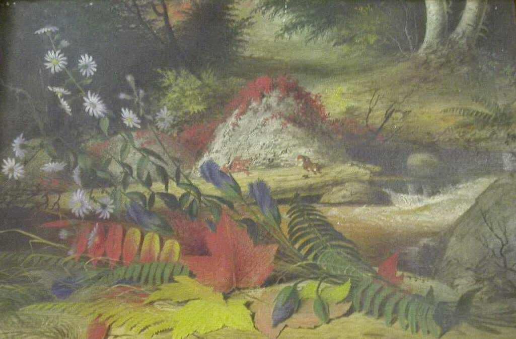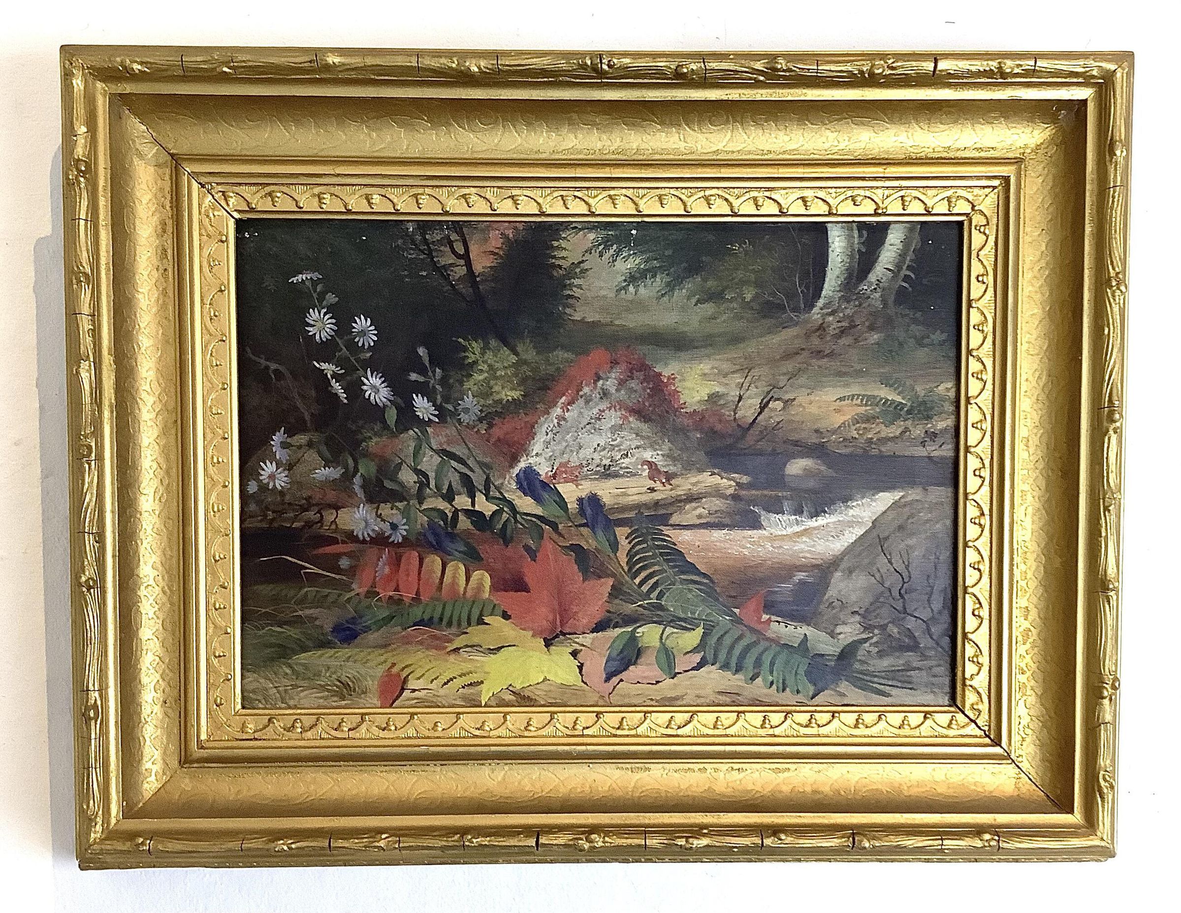 Oil on canvas landscape scene set in the woods. On the ground in the foreground is a spray of fall flowers and leaves, with a stream behind. In the middle ground is a small red squirrel.Made/Created