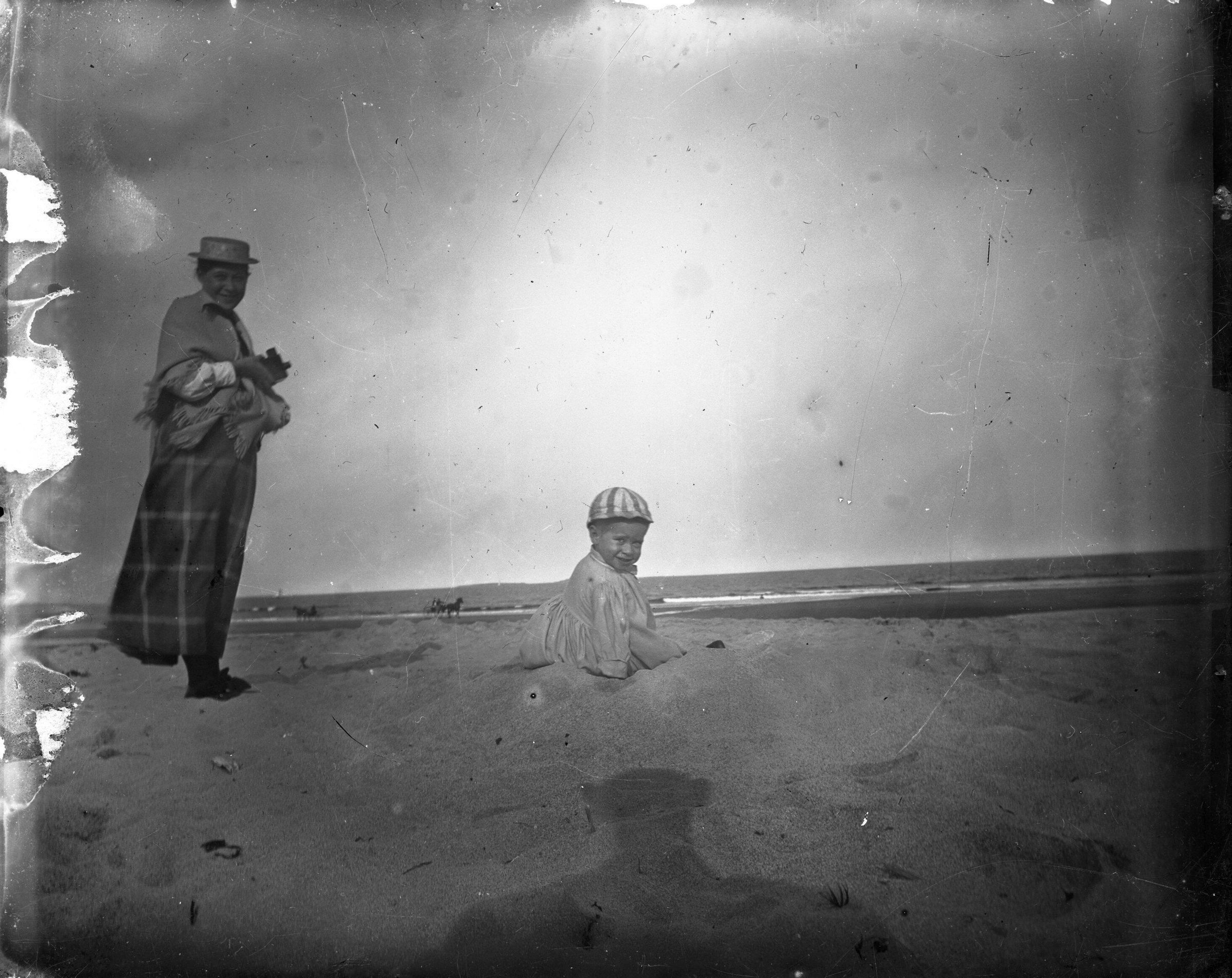 A glass plate negative photo of a toddler and woman on the beach. "Baby Charlie and Auntie Grace on Beach, Ocean Park, ME" is written on the plate sleeve.Made/Created