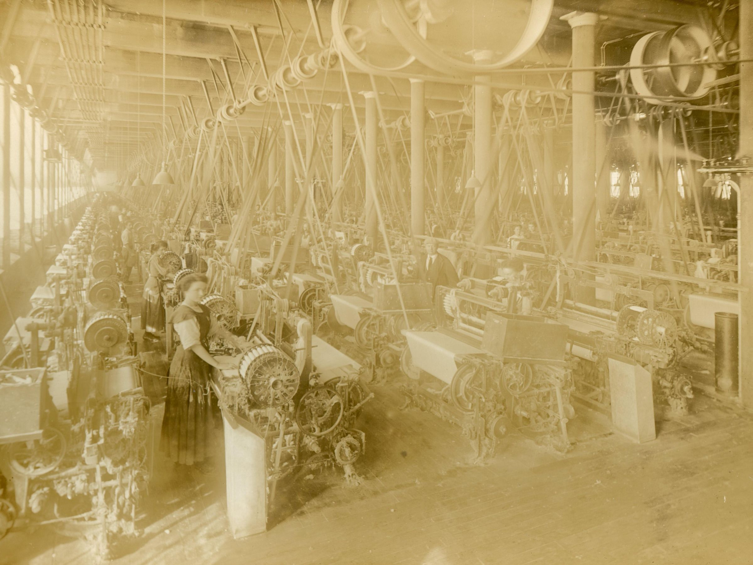 Photograph of workers in a weaving room in the Laconia Division of the Pepperell Manufacturing Company.
