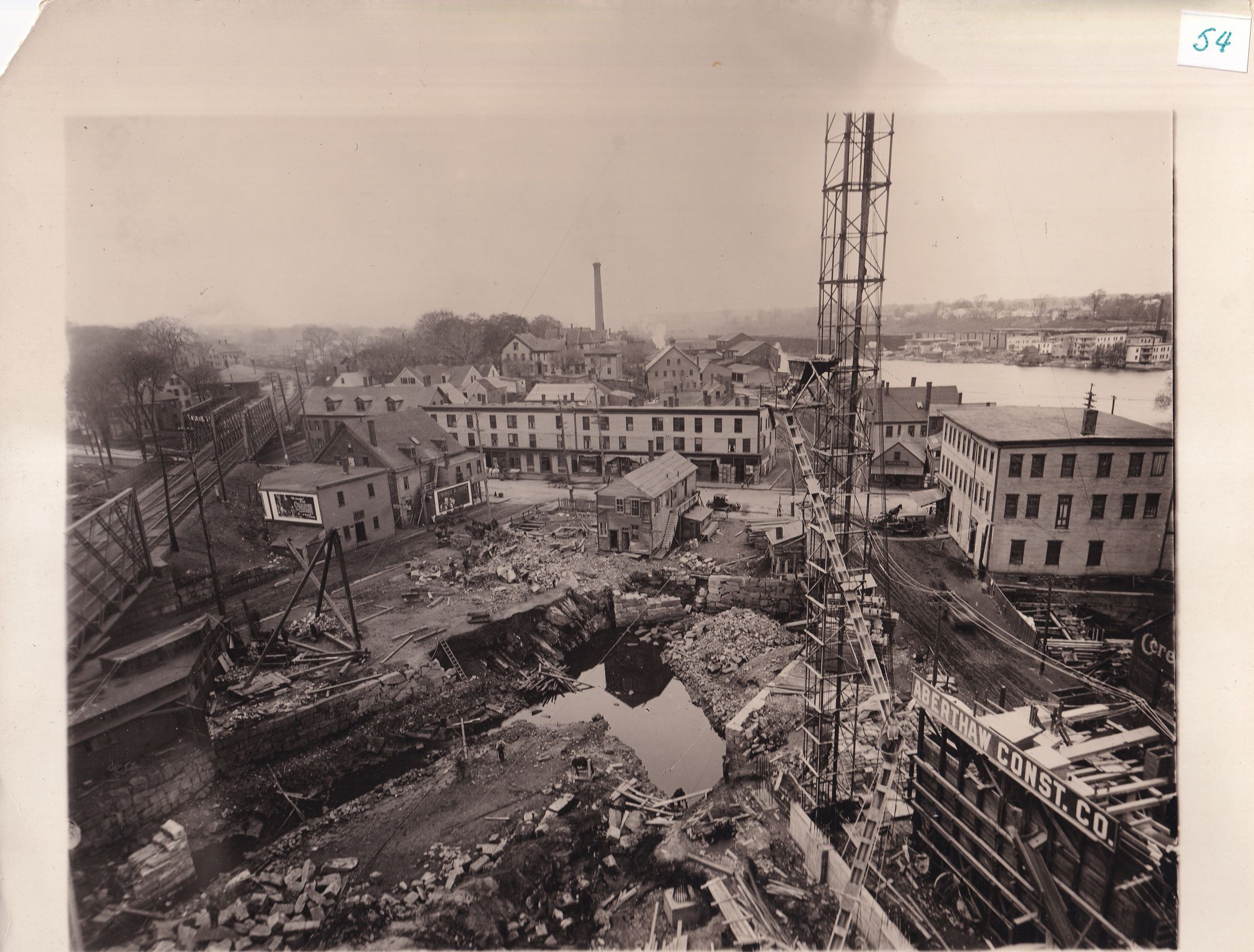 Aerial view of the foundation of the "New Shop" looking west over Elm Street, with the chimney of the Diamond Match factory and Hooper Hill in the background, the Saco River flowing from left to right. The railroad tracks are to the left (Western Division). Abenathy Construction Company, based in Boston, brought a new construction process to this area wherein steel-reinforced concrete was used. J. Vaughan Dennett did this pioneering work.Made/Created