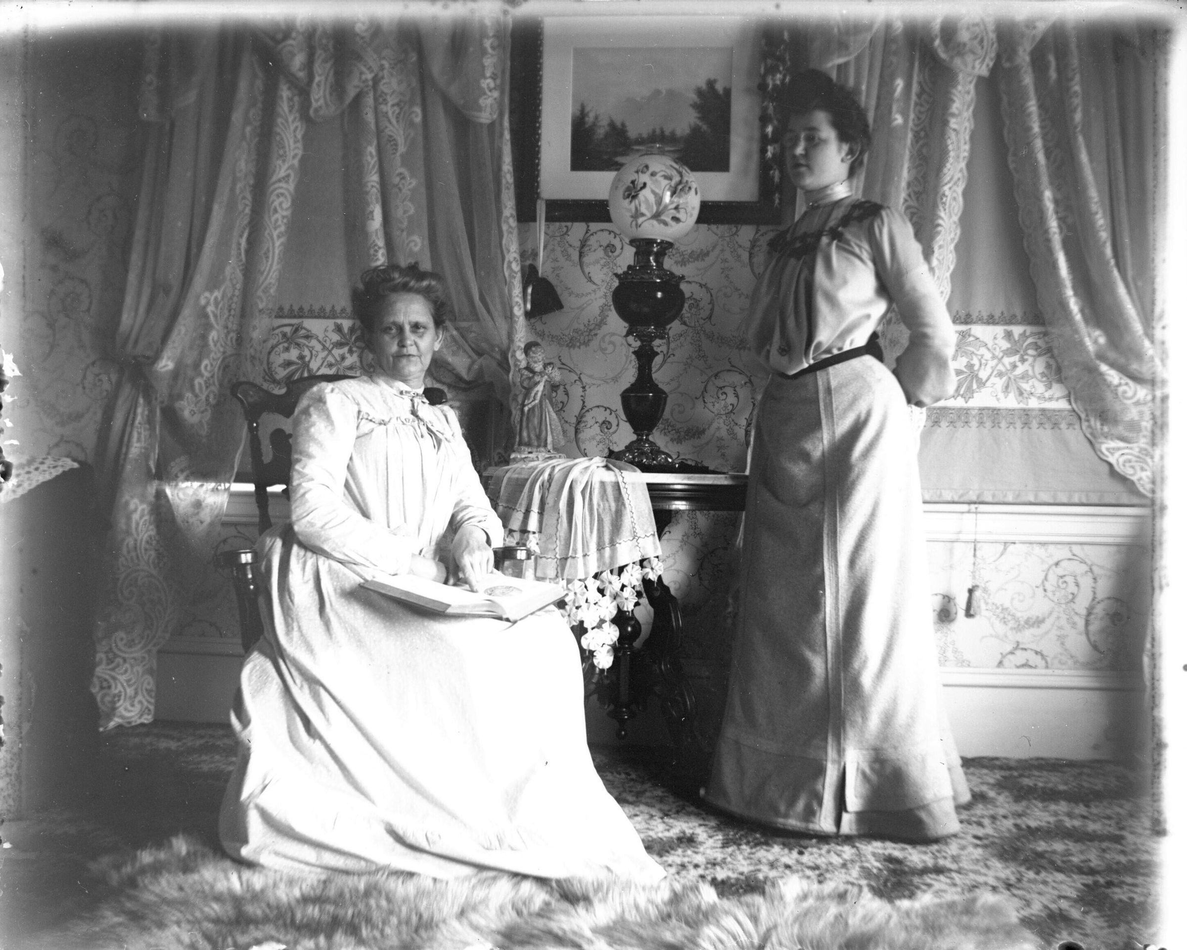 Glass plate negative photo of Sarah E. Lane Hobbs and Eunice Amanda Hobbs Staples at the 31 Hill Street house in Saco, ME. Circa 1903.