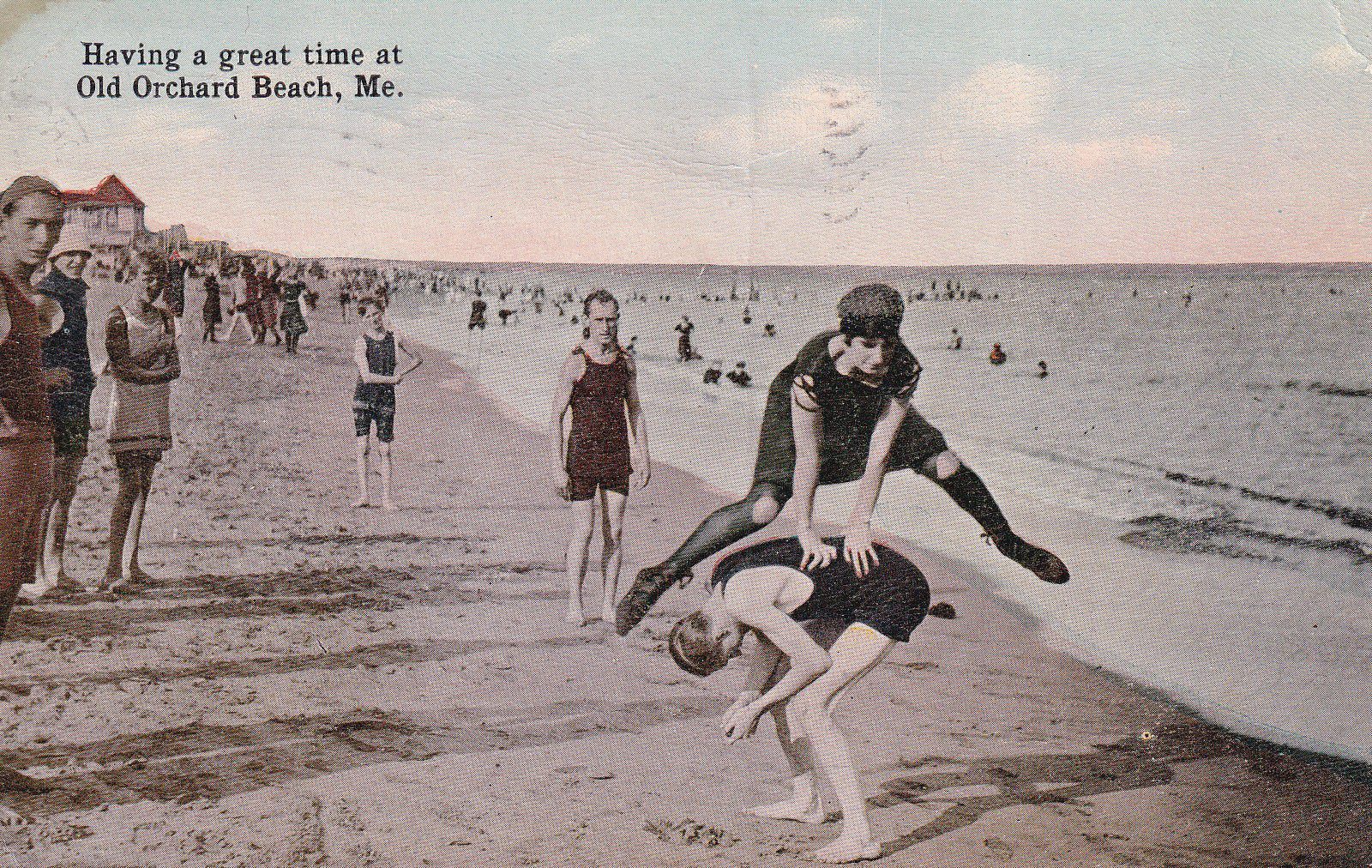 A postcard bearing a colorized image of two children playing leapfrog on the beach while onlookers observe.