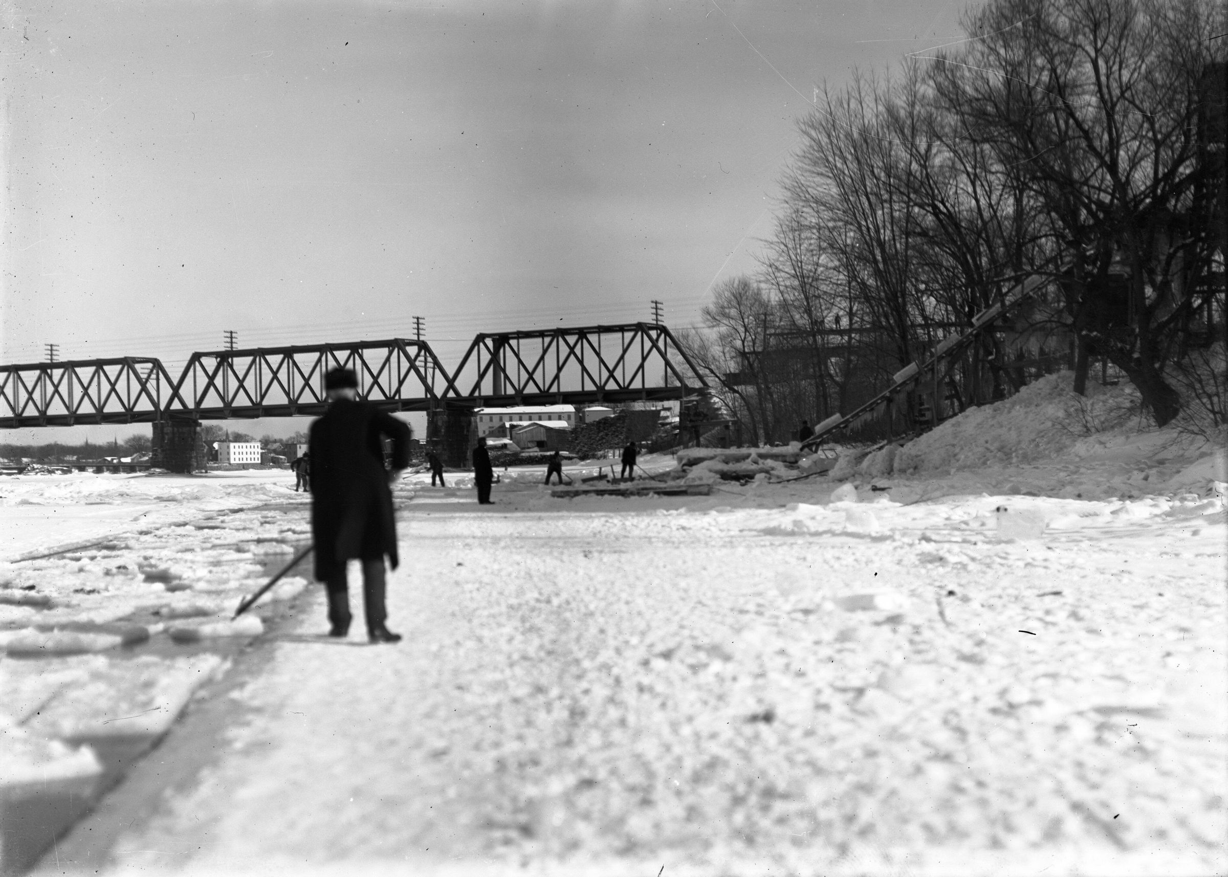 Glass plate negative photo of a group of men ice harvesting along the Saco River.