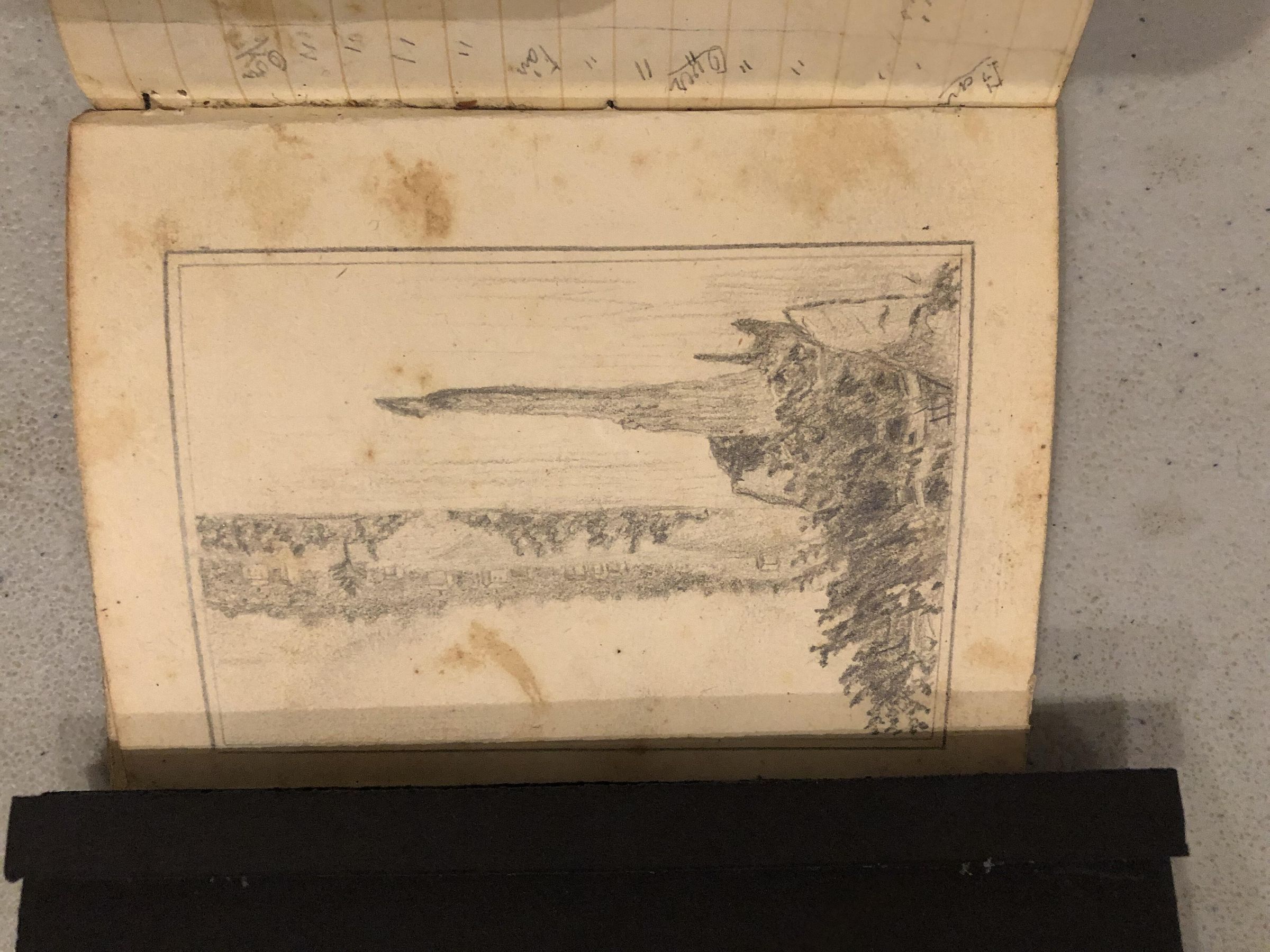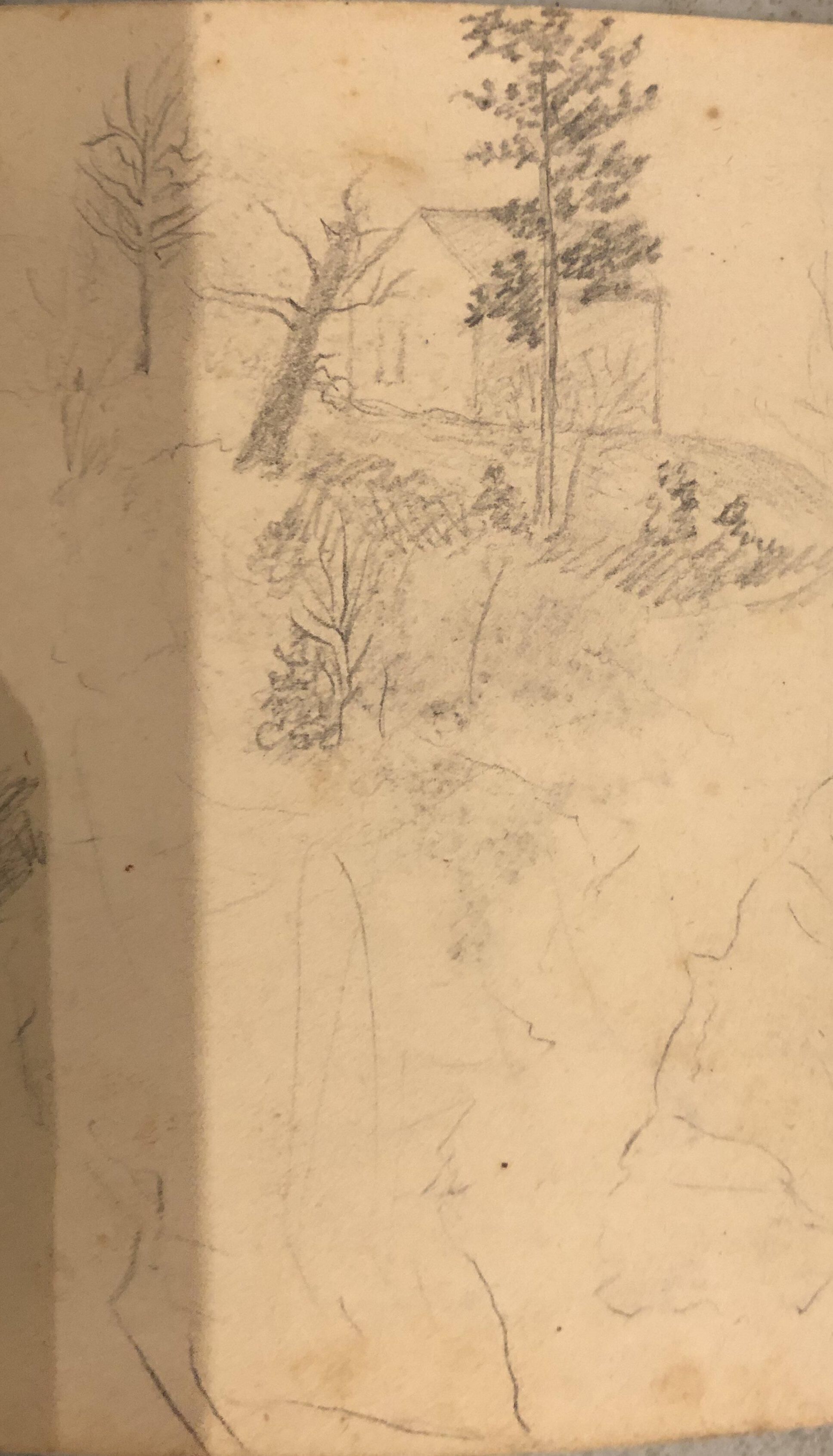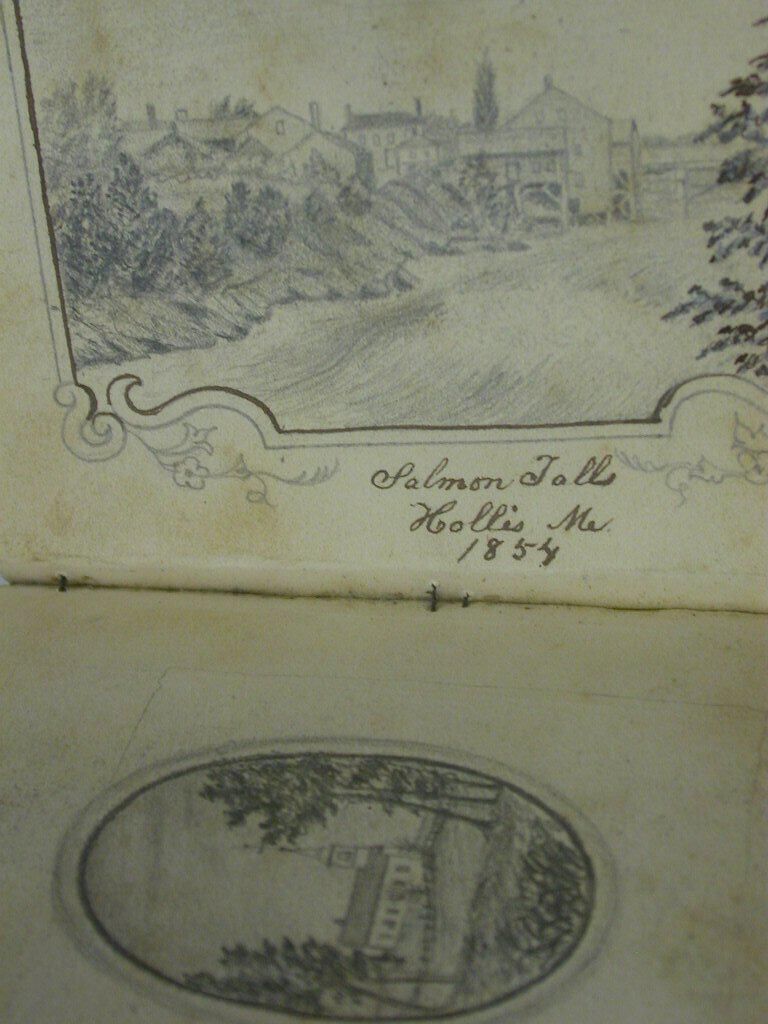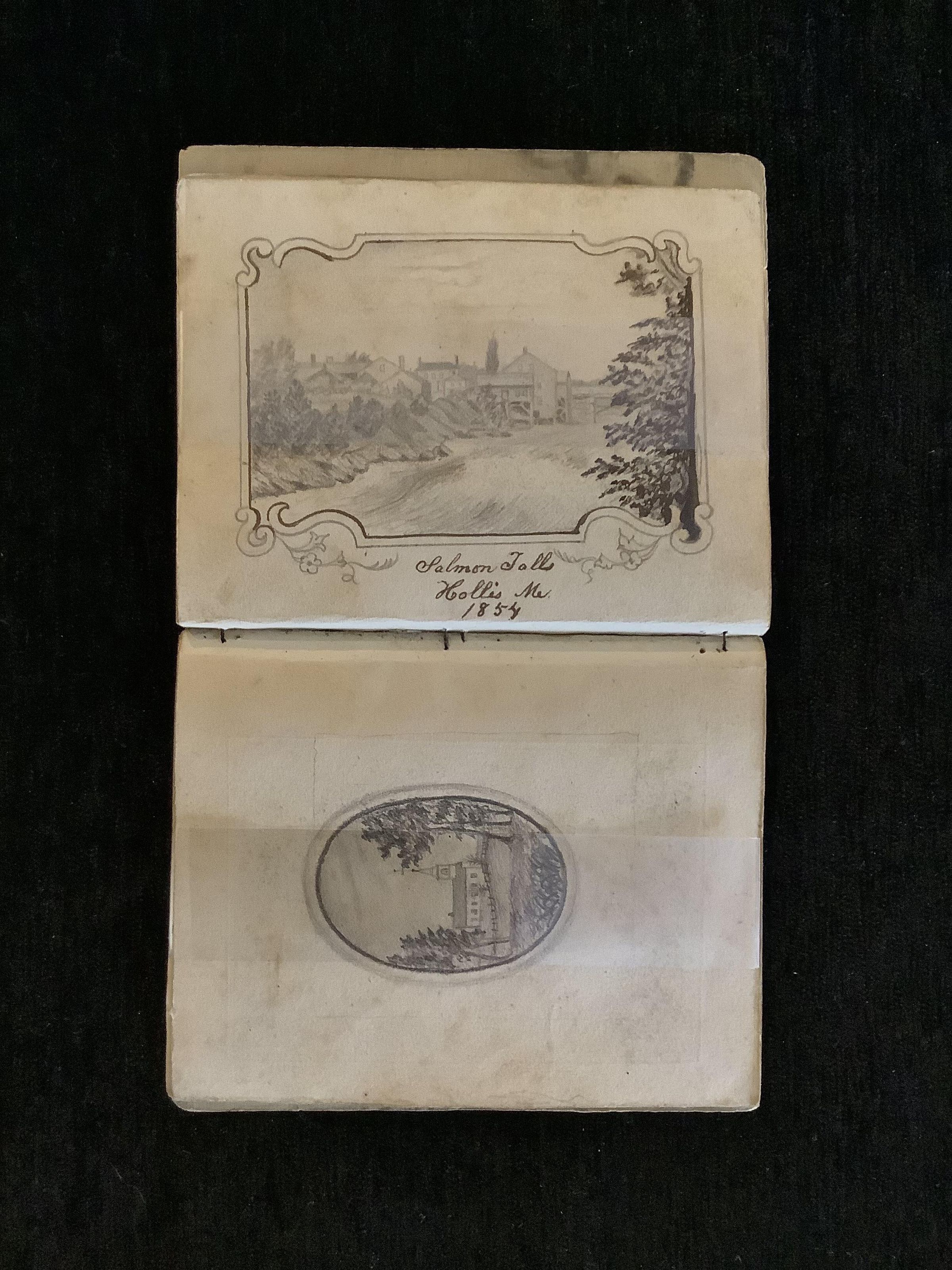 Diary and sketchbook dated 1854 owned by Gibeon Bradbury. It contians notes of daily activity for January and February. The balance of the book is filled with small sketches, most of which are of landscapes and buildings, with one floral sketch at the end. One sketch is labeled "Salmon Falls / Hollis Me / 1854". Cardboard cover with a cloth binding.Artwork Details