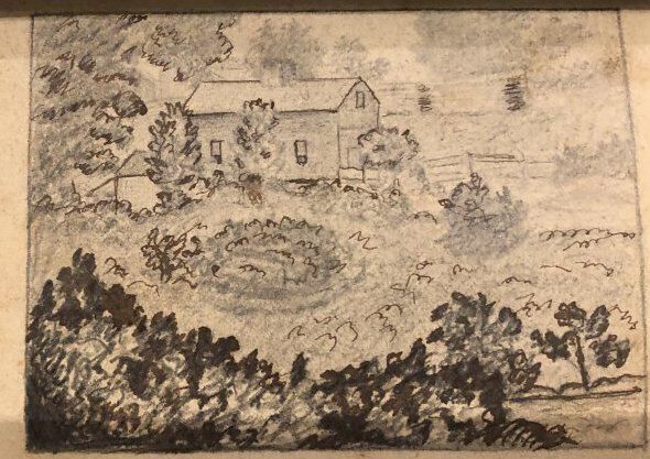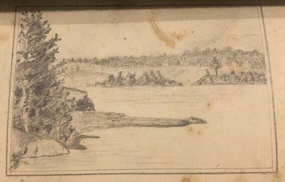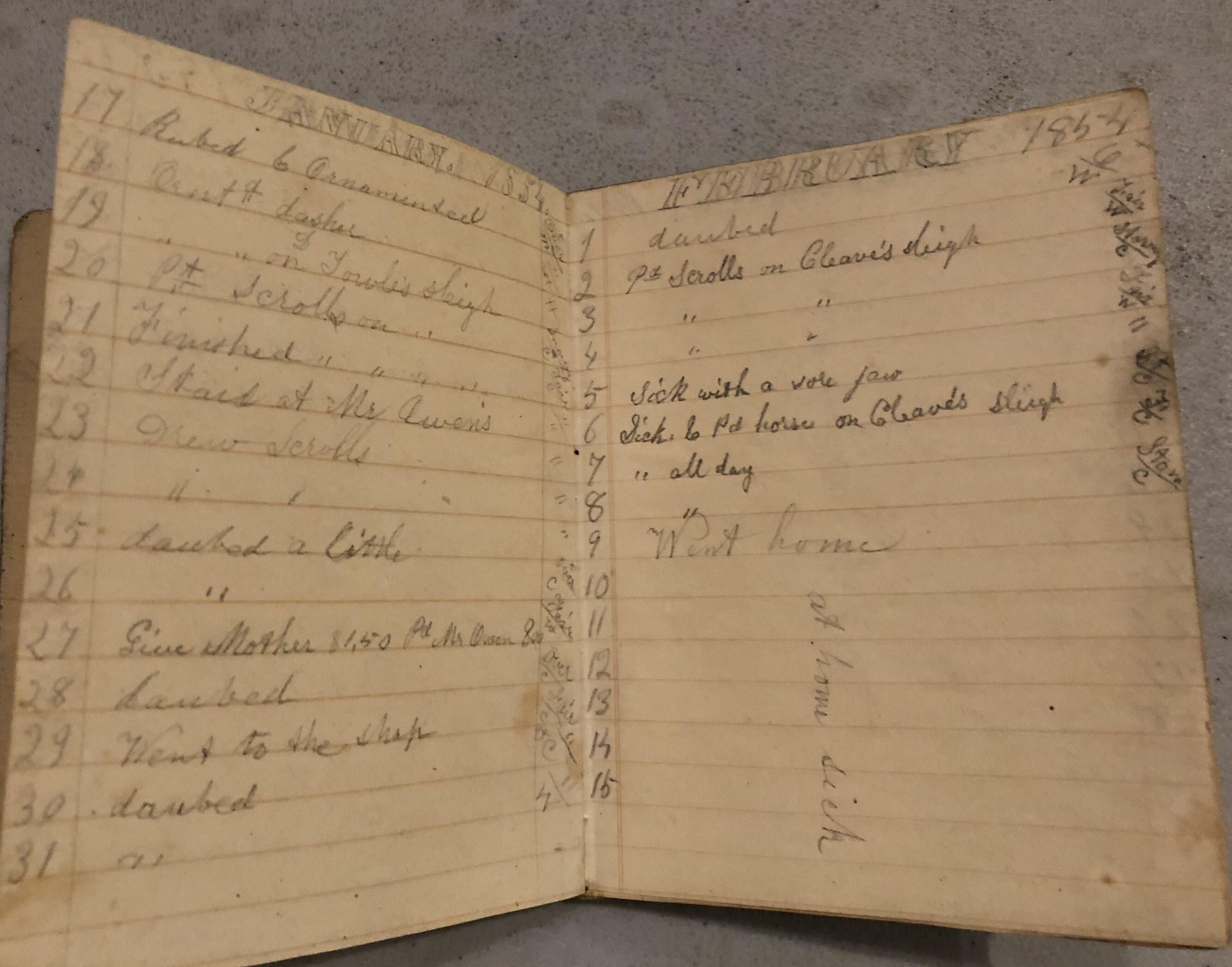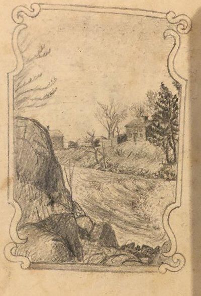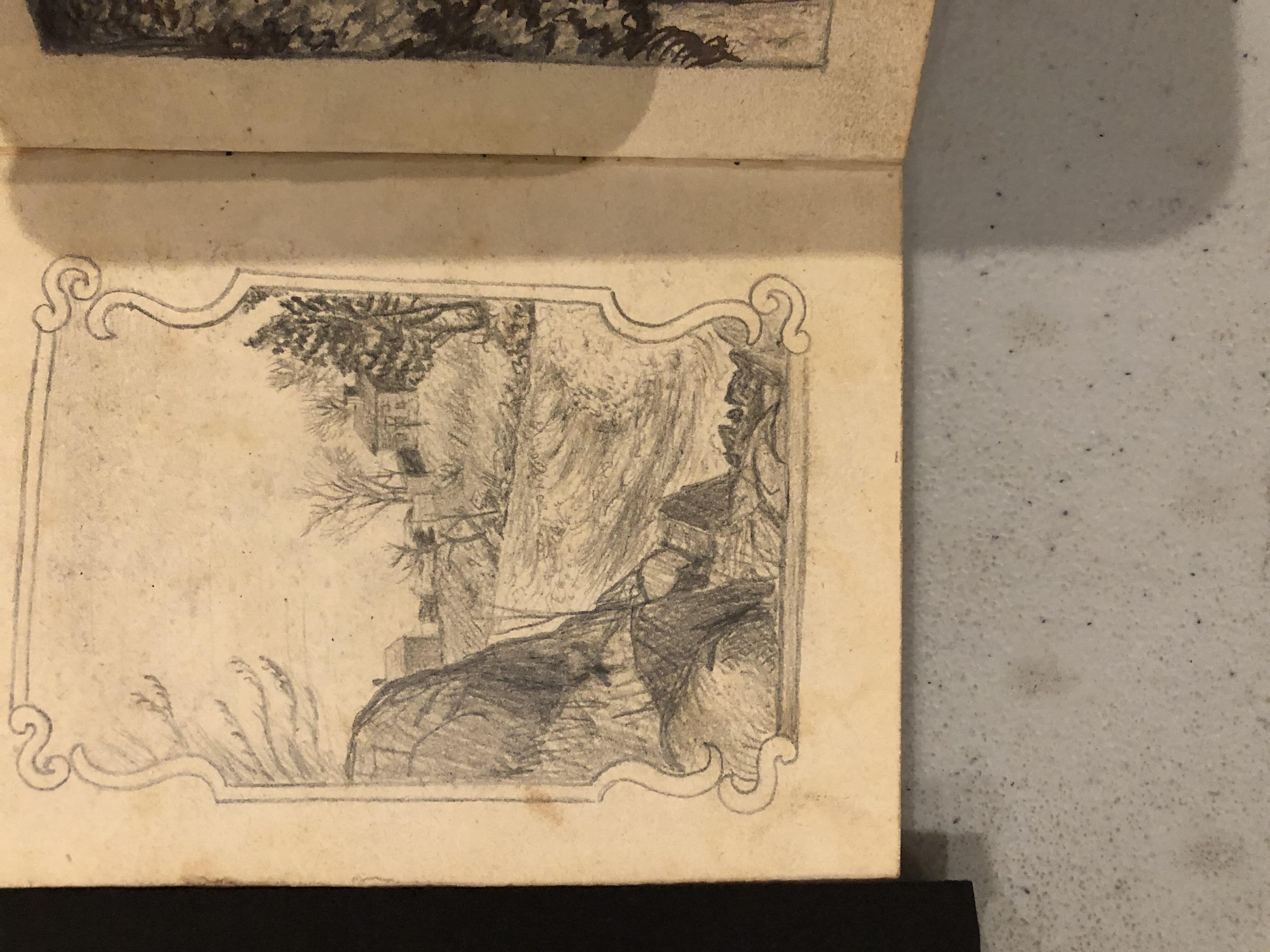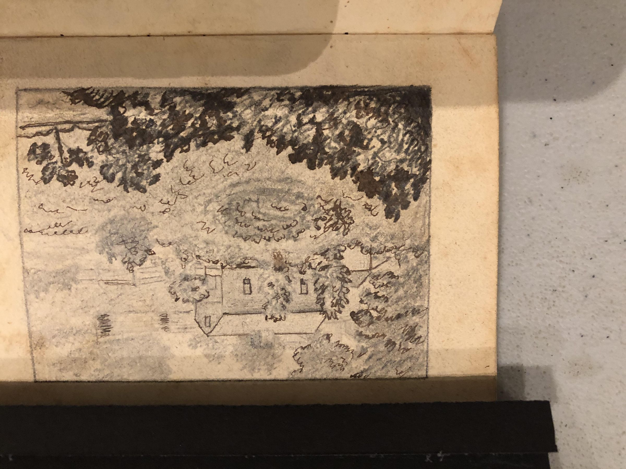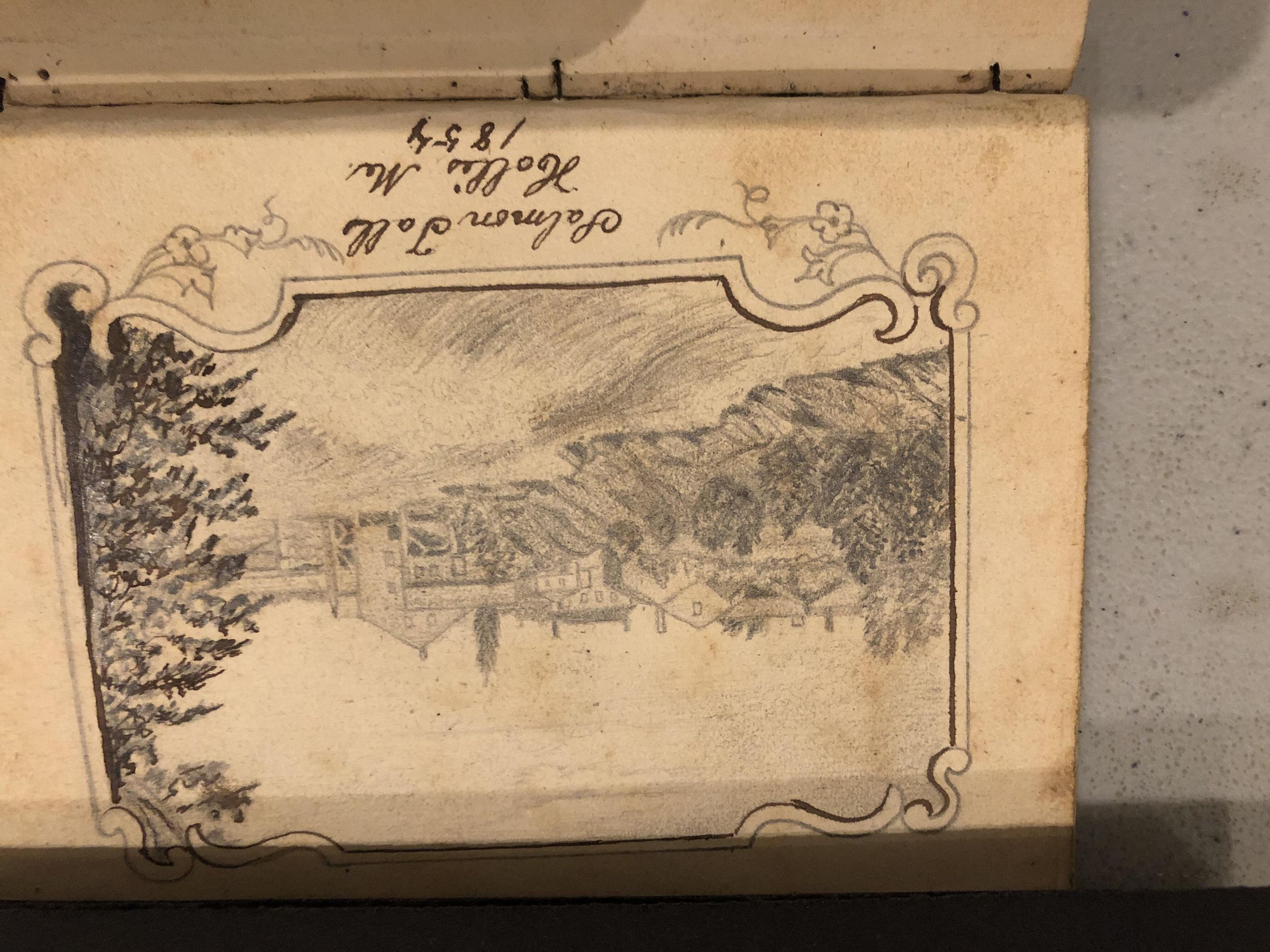 Diary and sketchbook dated 1854 owned by Gibeon Bradbury. It contians notes of daily activity for January and February. The balance of the book is filled with small sketches, most of which are of landscapes and buildings, with one floral sketch at the end. One sketch is labeled "Salmon Falls / Hollis Me / 1854". Cardboard cover with a cloth binding.Artwork Details
