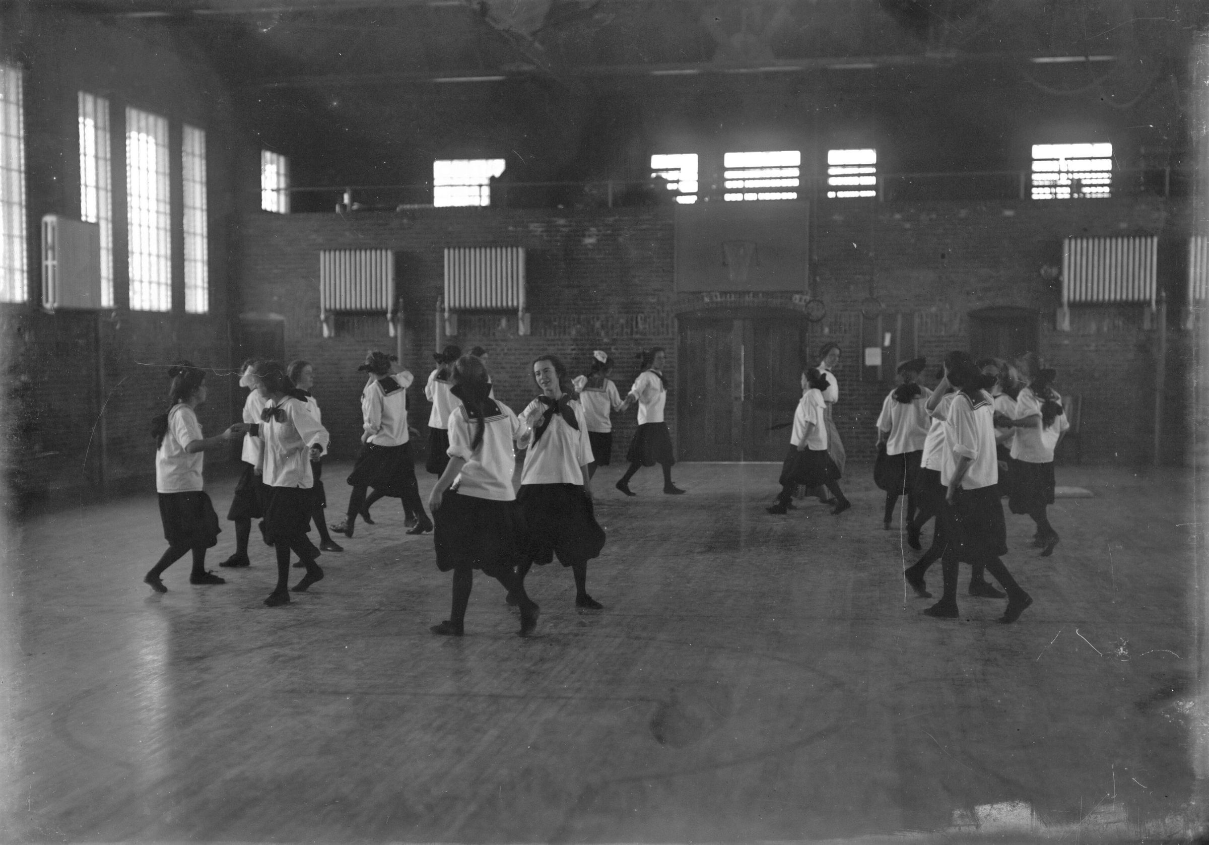 Glass plate negative photo of a group of girls in dancing class at Thornton Academy. This is in the original George Addison Emery Gymnasium which was built in 1913. Today the building houses the school library.