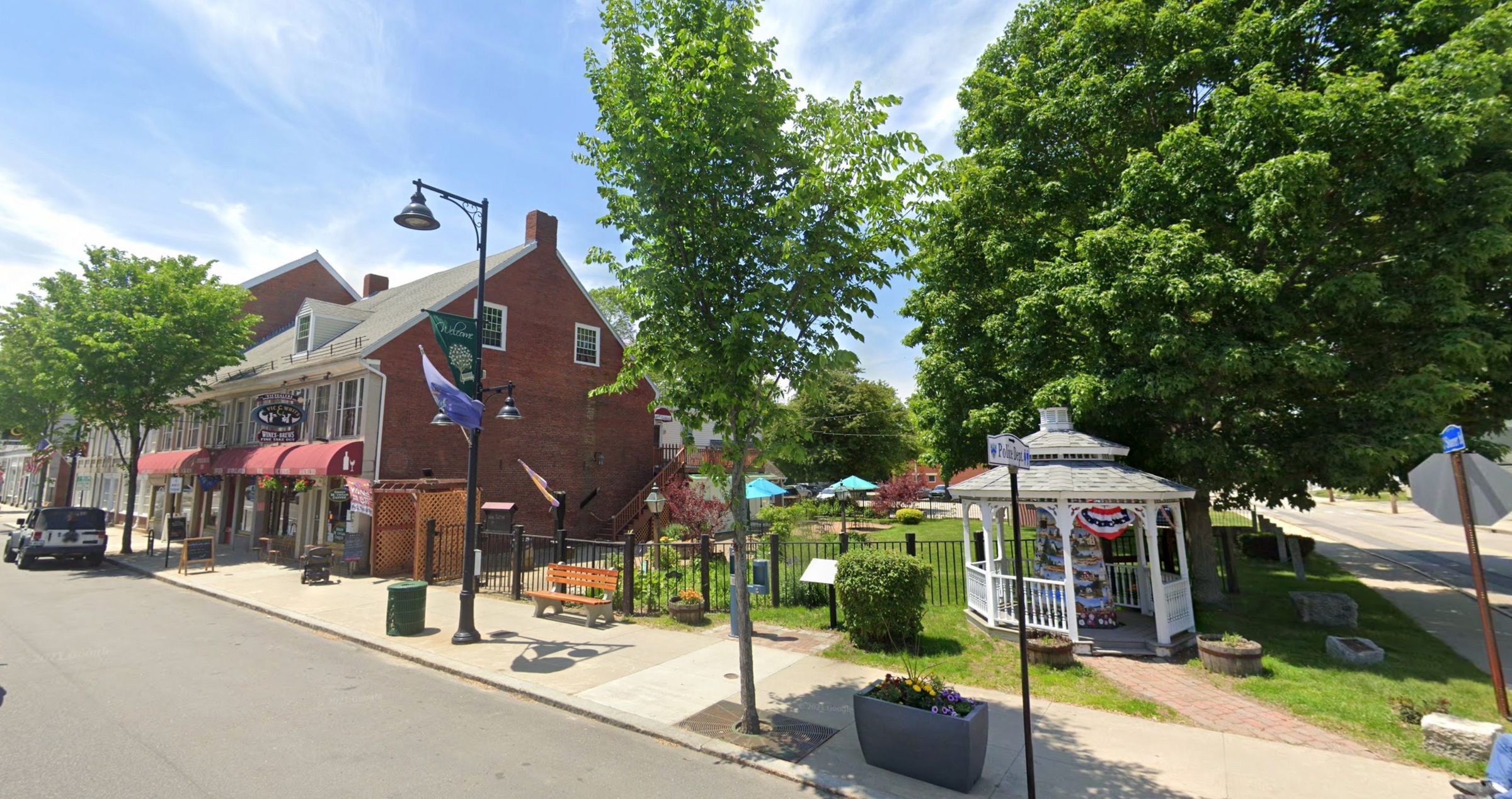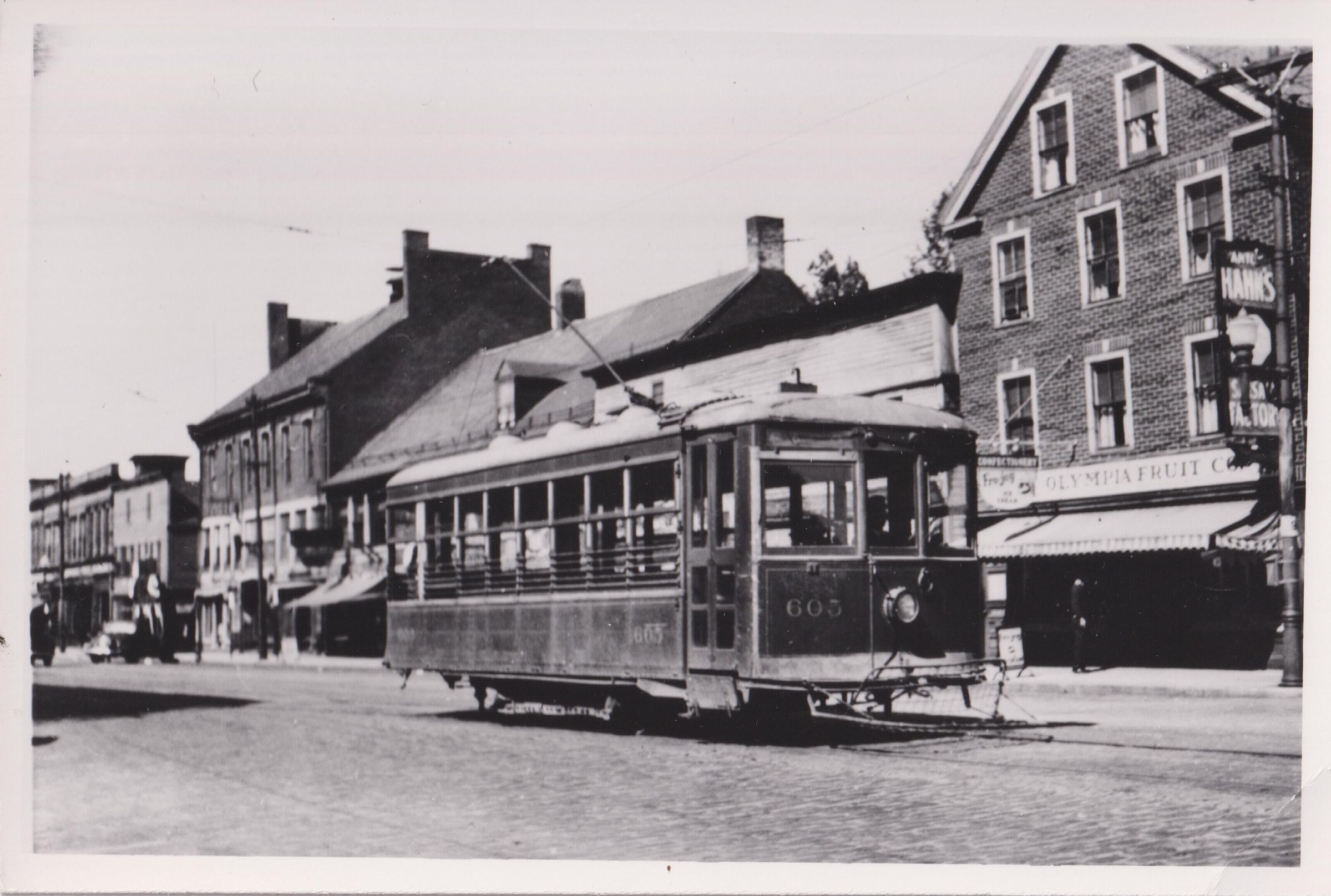 Photograph of Biddeford & Saco Railroad Car #605 on the corner of Main Street and Storer Street in Saco, Maine, circa 1939. The Anagnostis family's Olympia Fruit Co. store can be seen on the right.