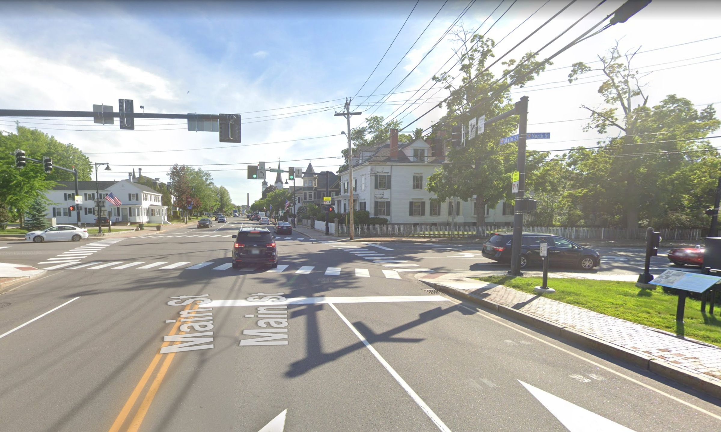 Black and white photo of the intersection of North Street and Main Street. The York Manufacturing Company Agent's House (1889) can be seen on the right, with the triangular section of Eastman Park in the foreground.