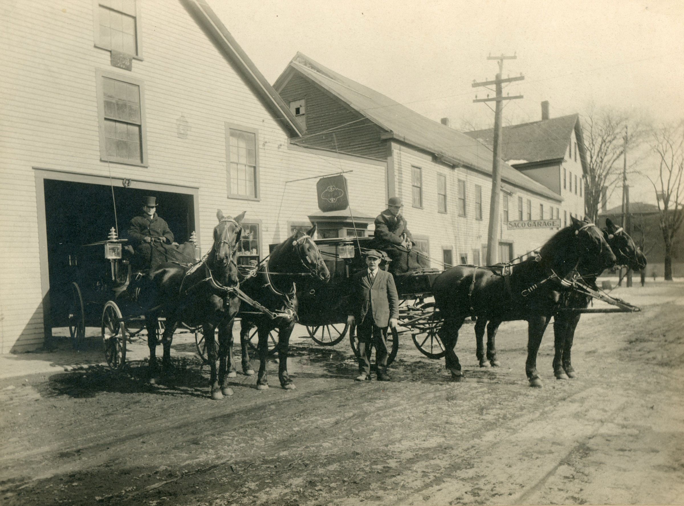 A photograph of the Dennett Brothers Livery Stable on Thornton Avenue in Saco, ME. The Livery Stable was connected to the Saco Garage. Circa 1910.