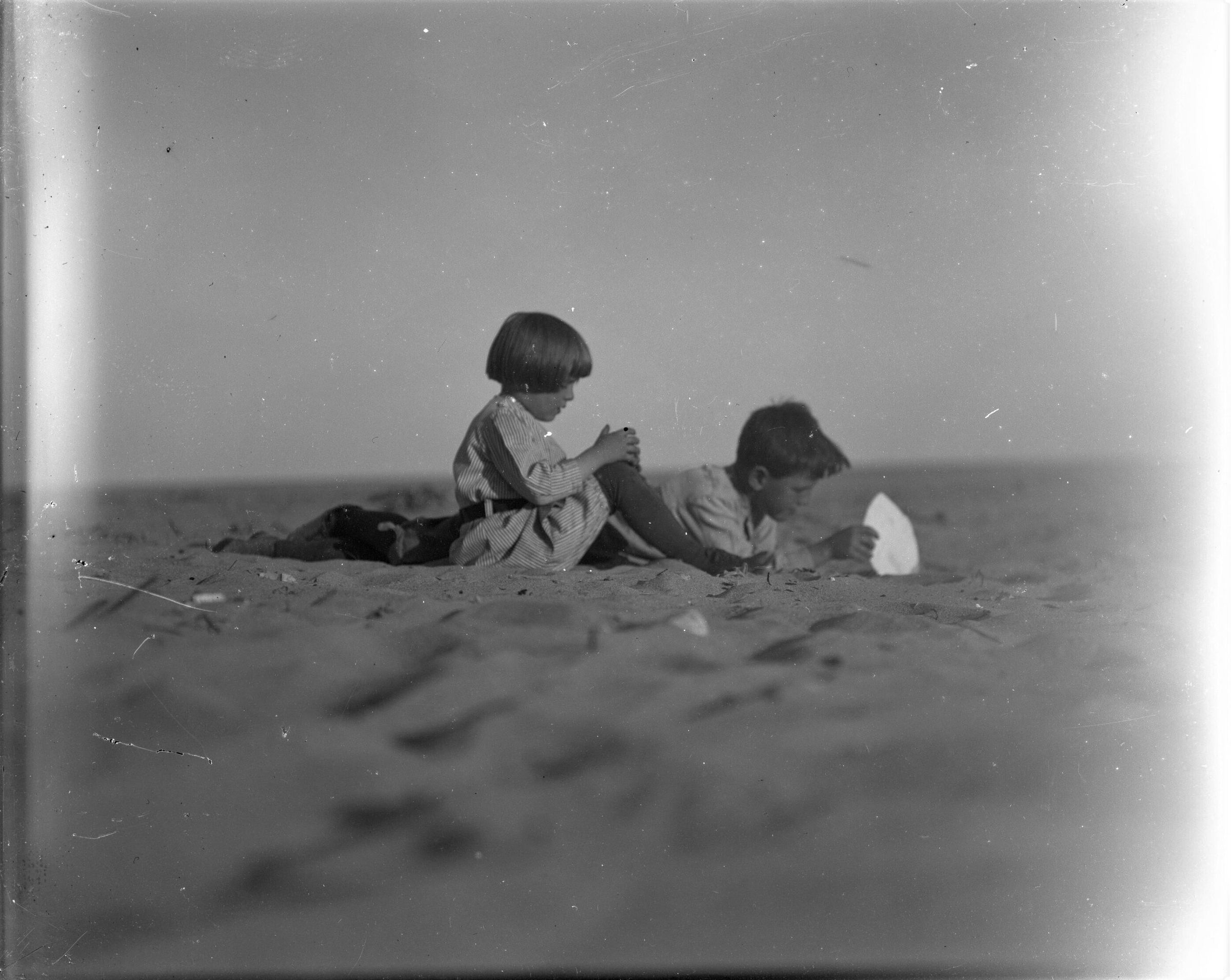 Glass plate negative photo of brothers Charles A. Bradbury (1903 - ) on the right and Herbert W. Bradbury (1911-1916) on the left. Looks to be on a beach.Made/Created