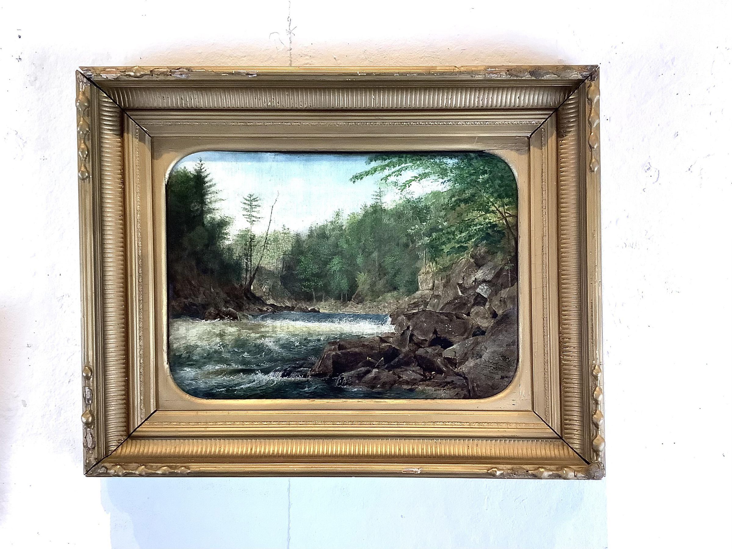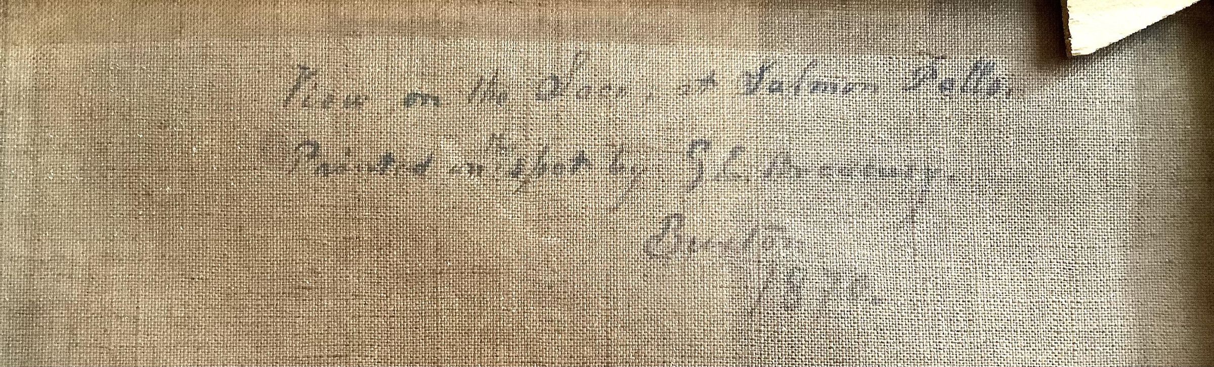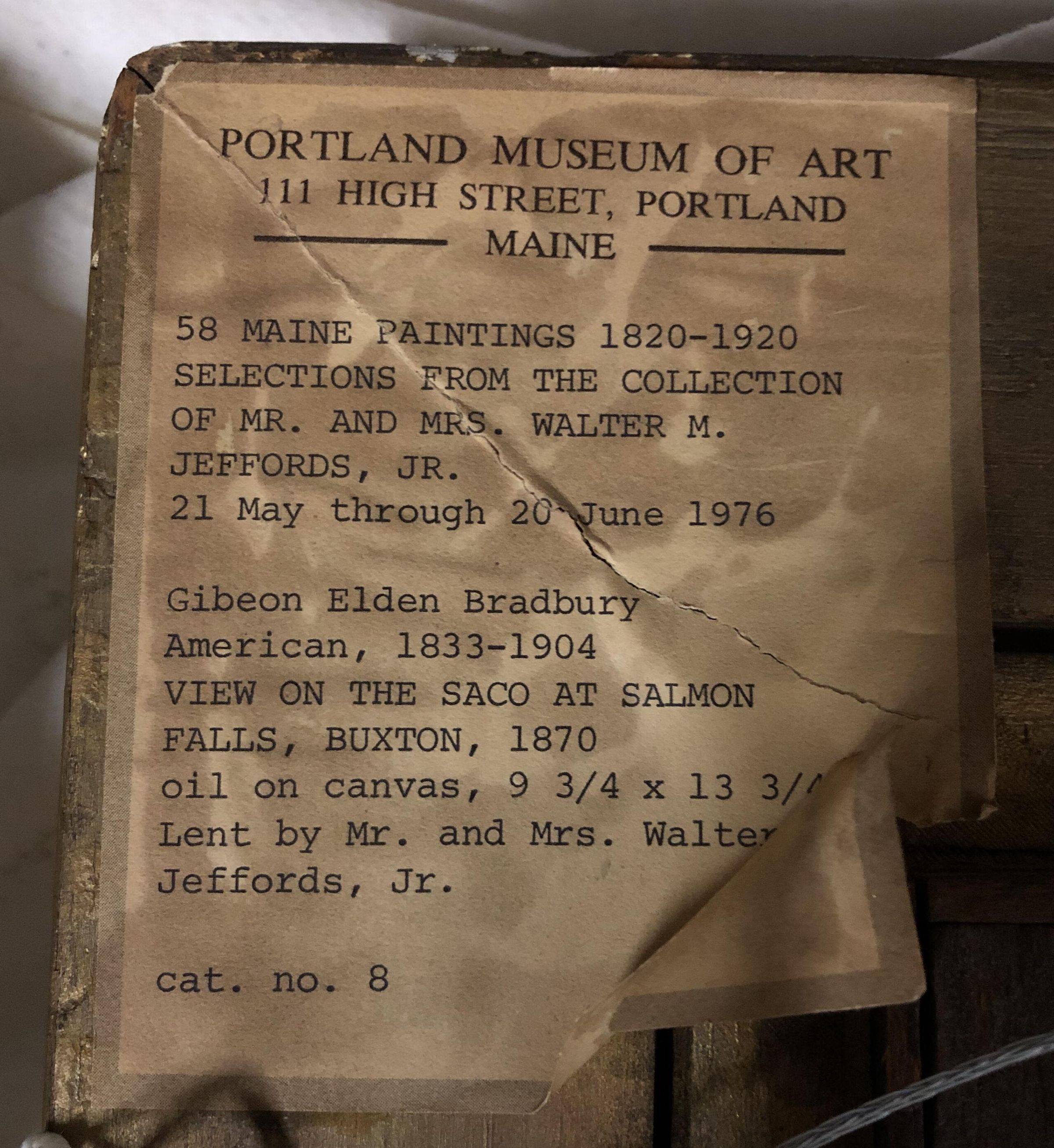 Oil on canvas painting of the Saco at Salmon Falls. A large rock outcropping is in the right foreground. The river is capped with white. Soft green trees are on the left bank of the river and in the background. In a molded gilt frame. Handwritten on the back of the canvas in black paint: "View on the Saco, at Salmon Falls / Painted on the spot by G. E. Bradbury. / Buxton / 1870."Made/Created