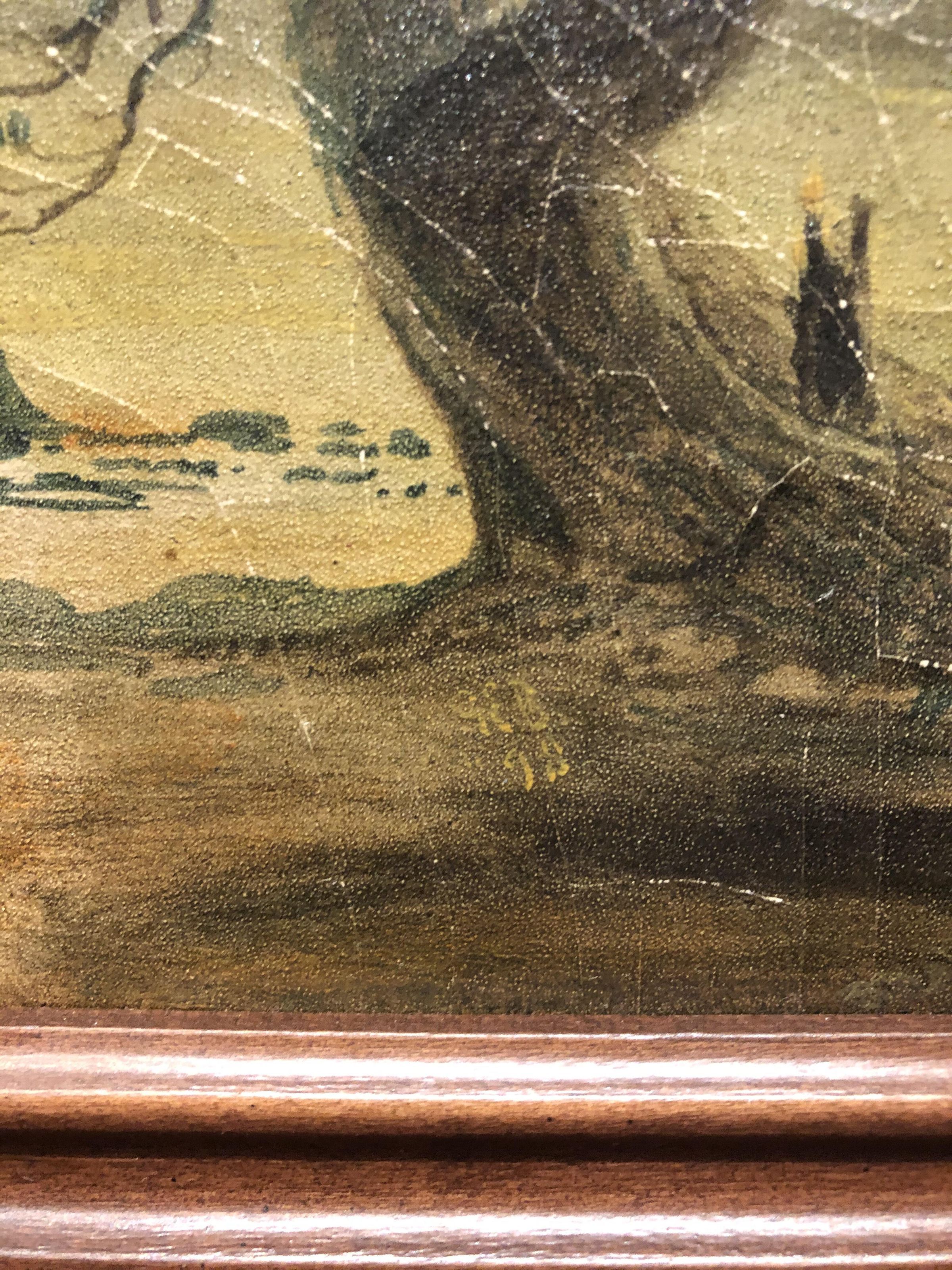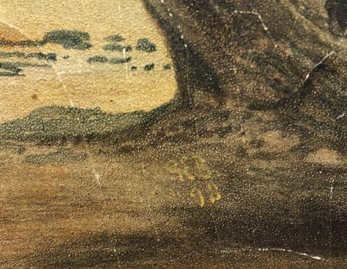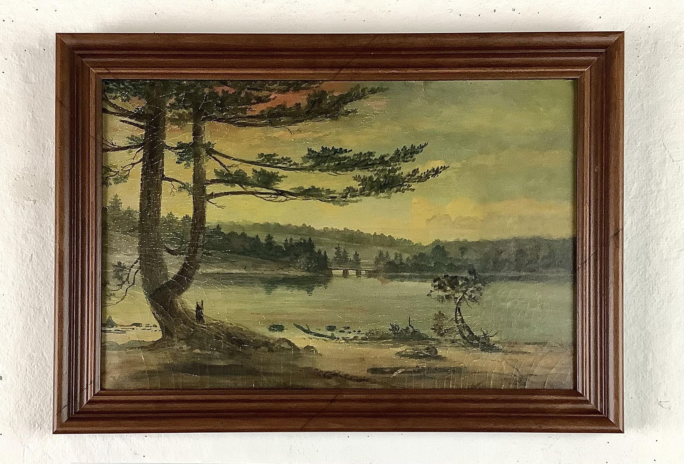 Gouache on academy board of view of Cook's Brook on the Saco River. The sun is setting and the painting has a yellow-orange to blue palette. A white pine tree is silhouetted in the foreground with a river and forested shores in the background.Artwork Details