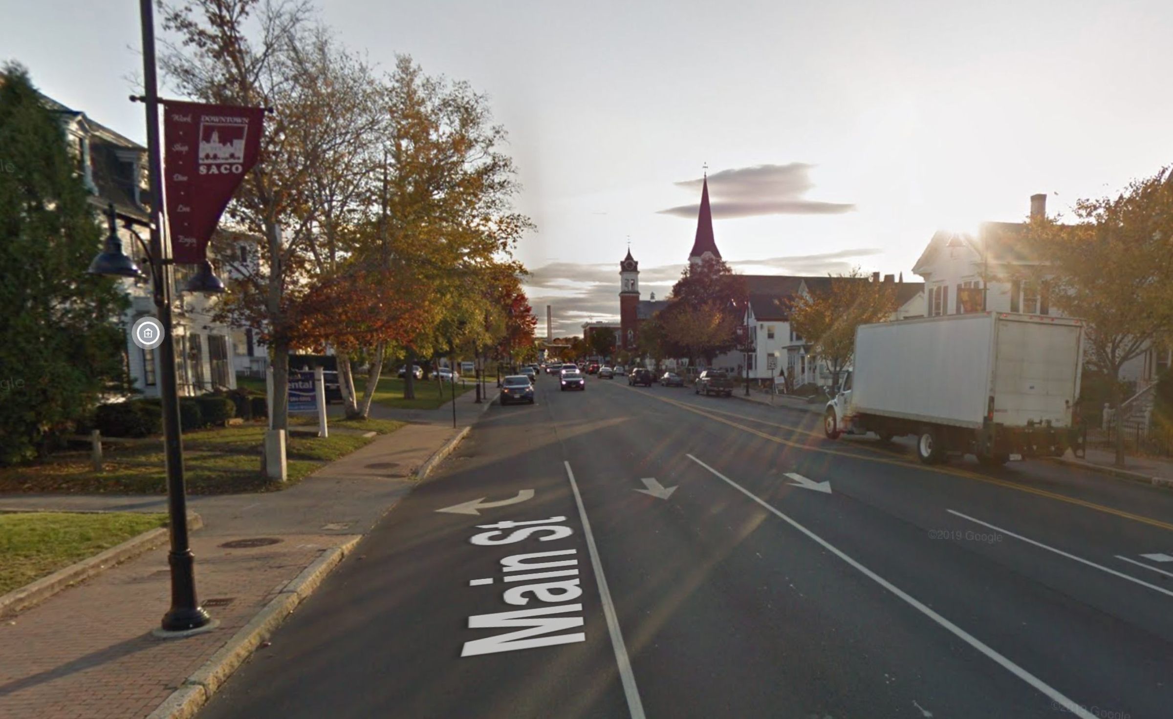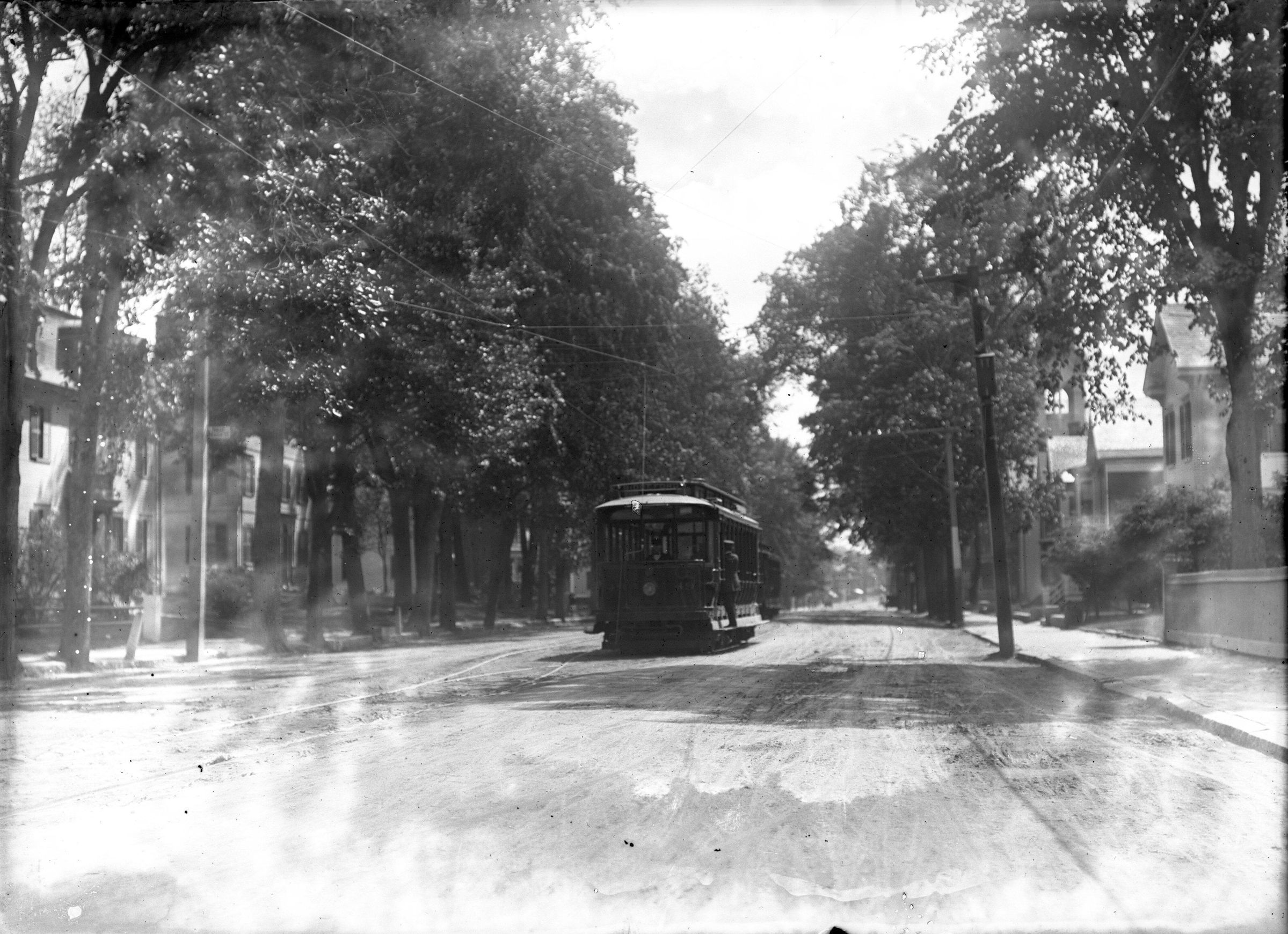 Glass plate negative photo of a trolley on Main Street, Saco.