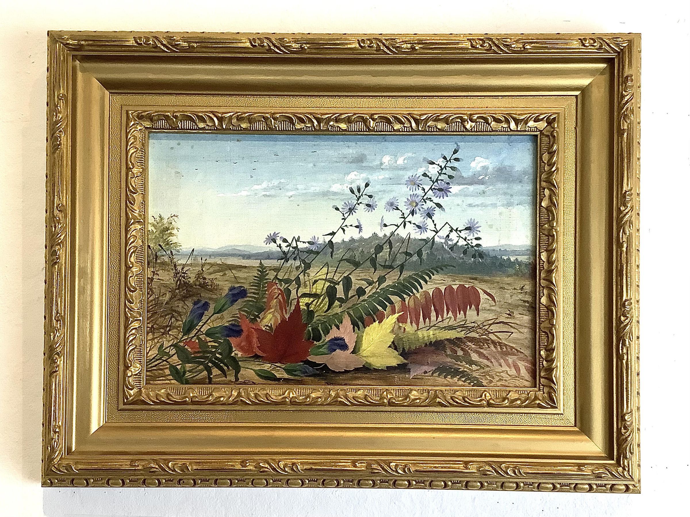 Oil on canvas painting of fall wildflowers and leaves in the foreground, including asters, fern, and maple leaves. They occupy the entire foreground with a landscape partially visible in the distance beyond the foliage.Made/Created