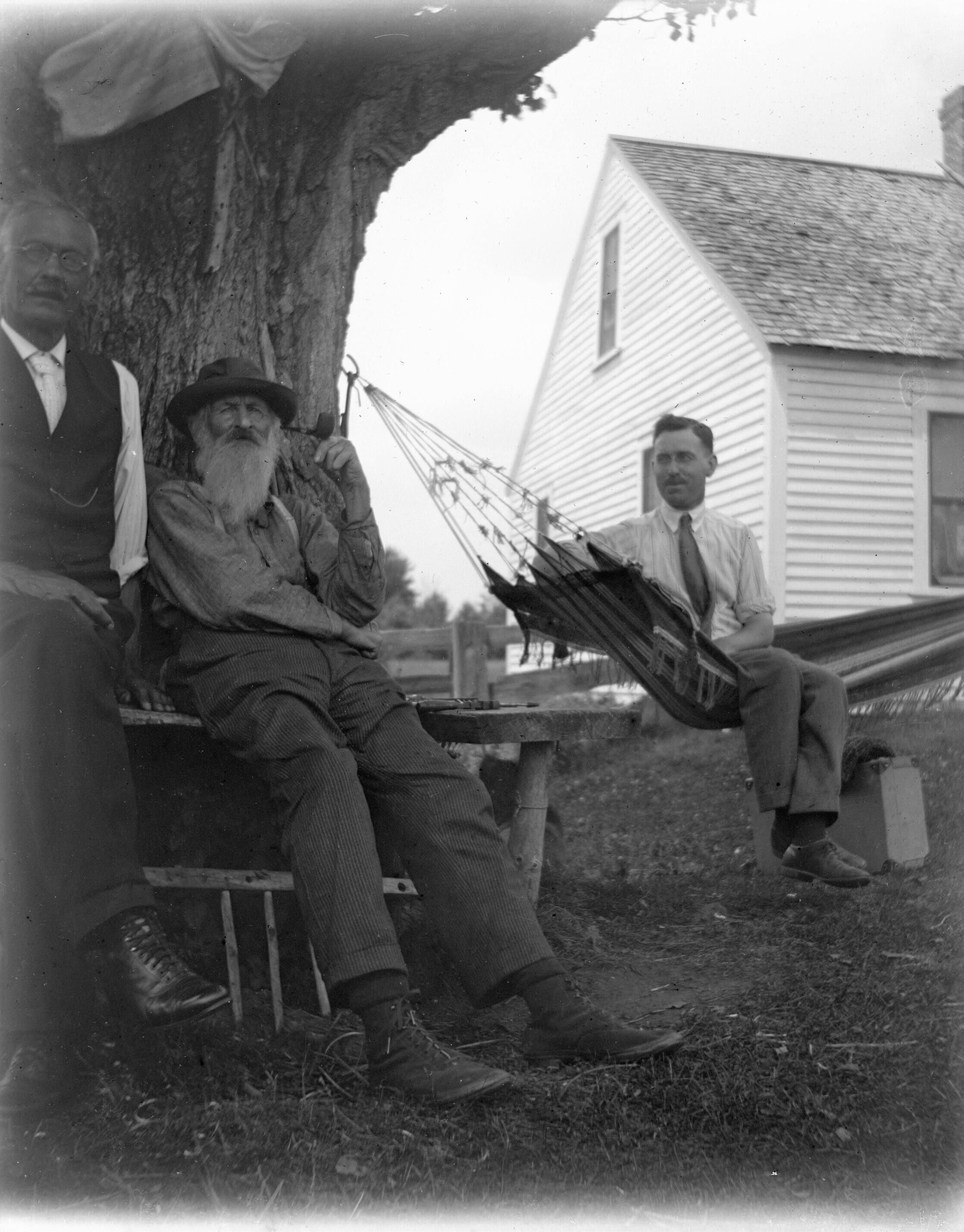 Glass plate negative photo of three men sitting outside the Staples home in South Paris, ME. From left to right: Stephen C. Lane (1859 - 1932), Timothy Woodward (1835 - 1924), and Dr. Ivan Staples (1883 - 1943). Taken sometime around 1926 based on their apparent age.
