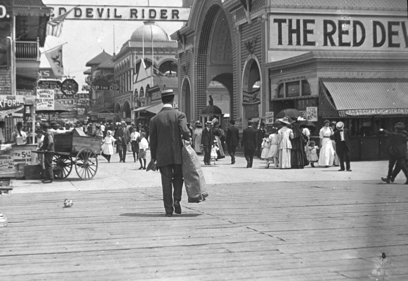 Glass lantern slide of the boardwalk at Luna Park in Coney Island, NY. Luna Park opened in 1903. Signs for the "Red Devil Rider" attraction can be seen. Also "Emanuel's Brick Ice Cream." The slide has a "Essex Camera Club, Newark, New Jersey" label.