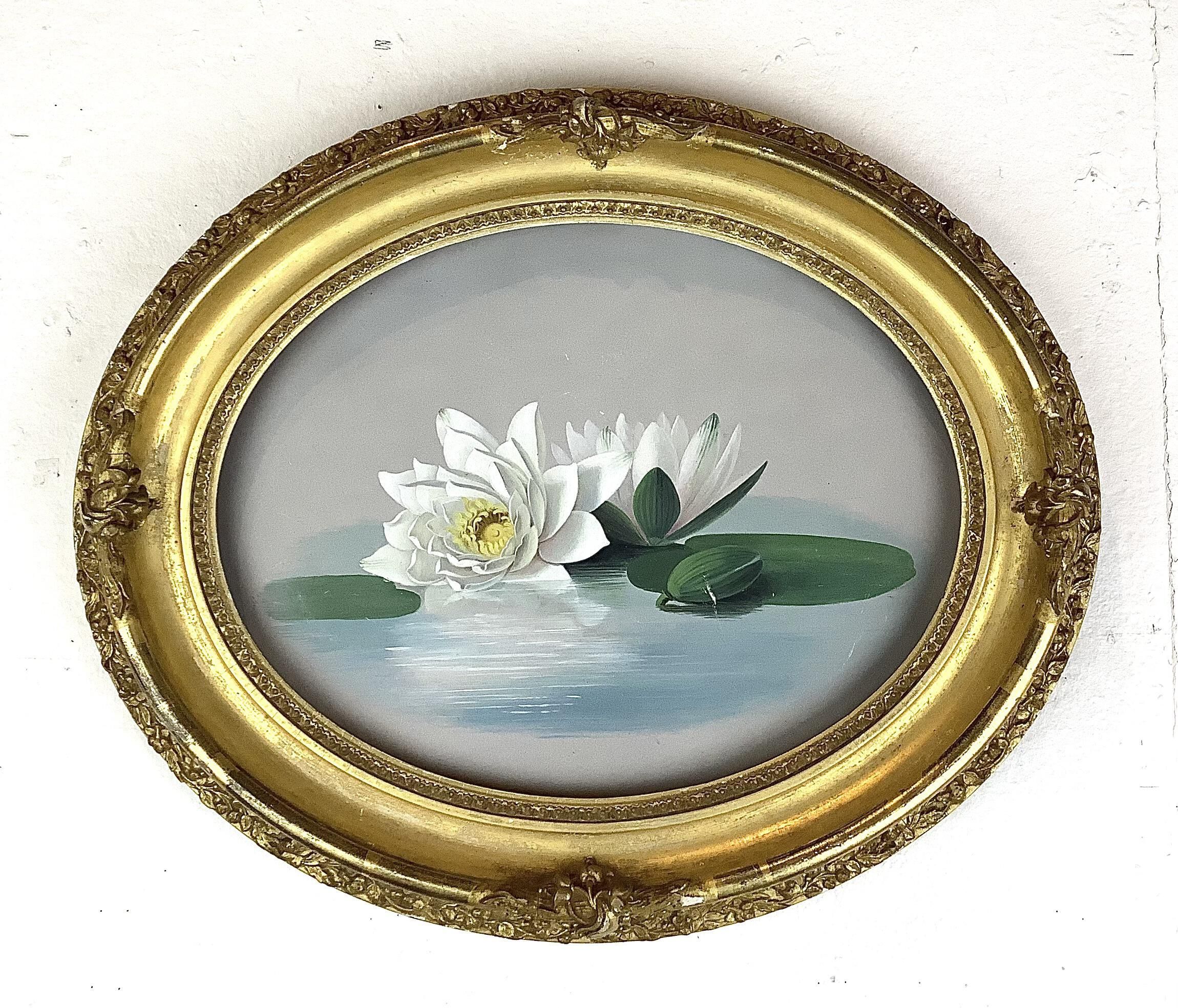 Gouache on board painting of waterlilies. Two white waterlilies--one open, one closed--float in blue water which contains their reflection. Pale blue background. In a gilt wood and plaster photograph frame that is not original; the painting is nailed to the back of the frame behind the rabbet. Inscribed on verso: "Bradbury" (erased) / Bradury (in another hand) / '66 Buxton"Made/Created