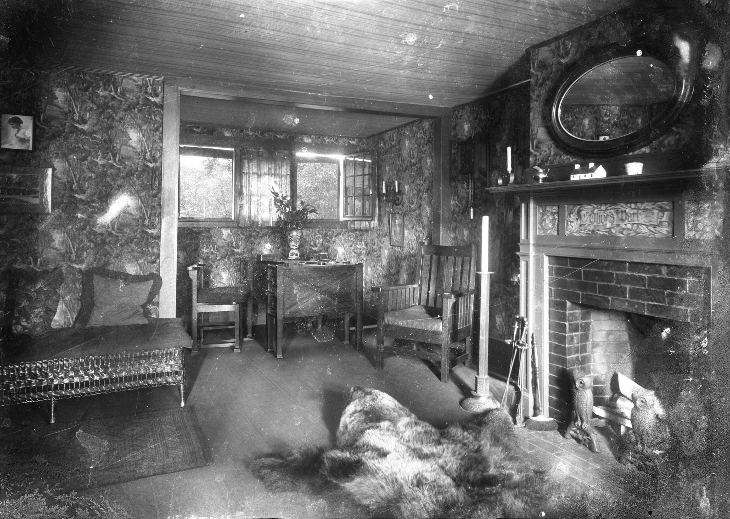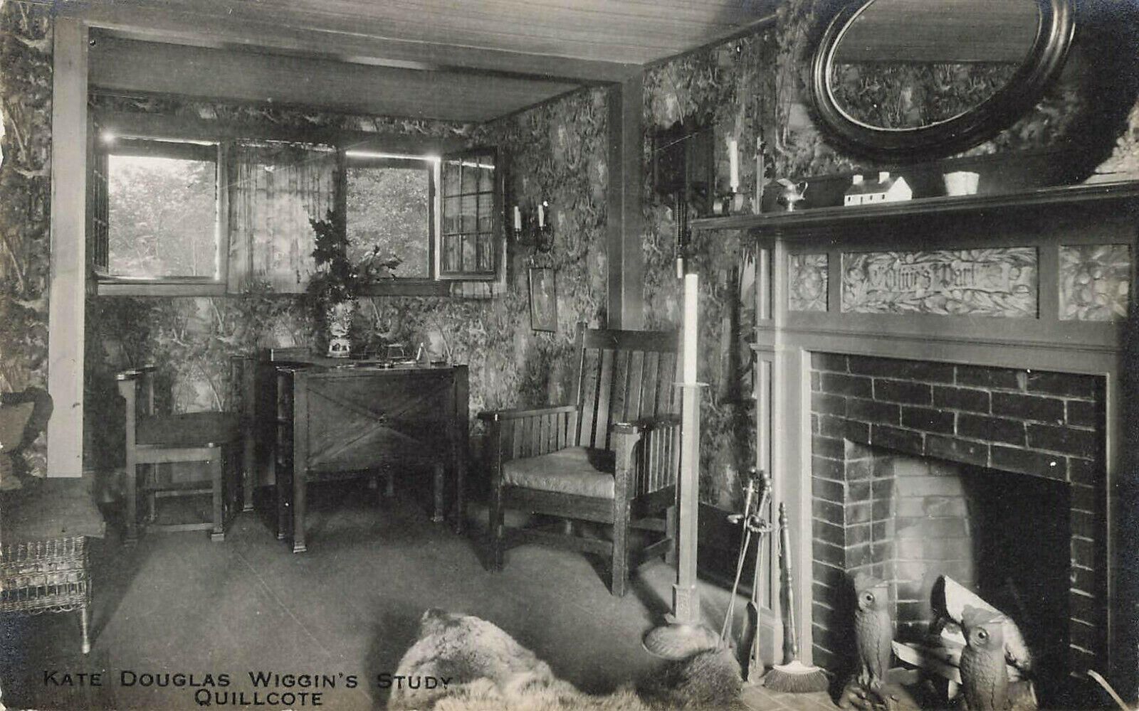 Glass plate negative photo of the interior of the Quillcote house, author Kate Douglas Wiggin's residence in Hollis, Maine. This image of "The Study" has appeared on postcards. Many of these postcards of Quillcote are still widely available today and sold by antique ephemera dealers.Made/Created