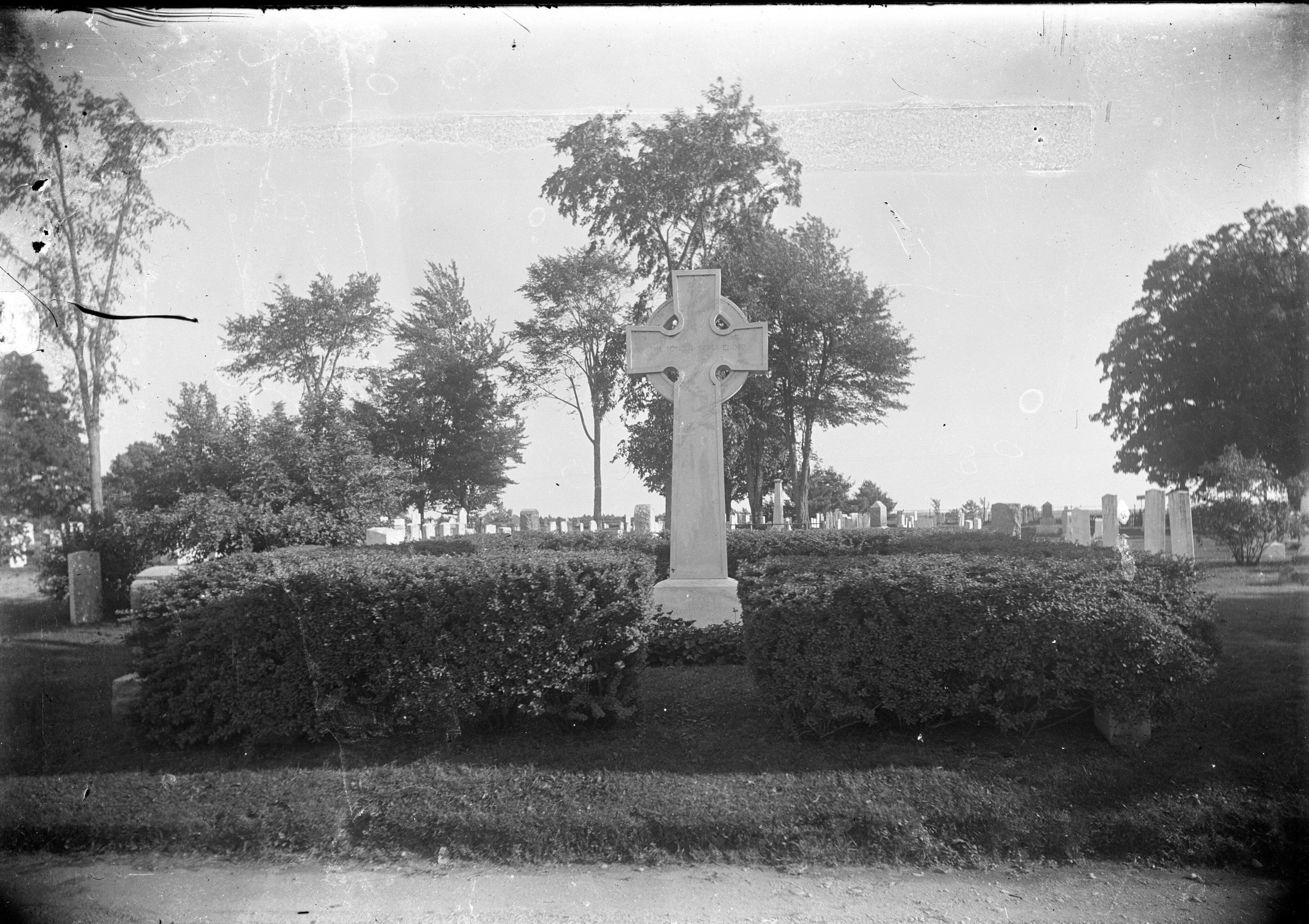 Glass plate negative photo of the author Kate Douglas Wiggin's (1856 - 1923) memorial in South Buxton/Tory Hill Cemetery in Buxton, ME. Kate Douglas Wiggin died of pneumonia in London while attending a Dickens Fellowship convention. She asked that her ashes be brought home to Maine and scattered along the Saco River.Made/Created