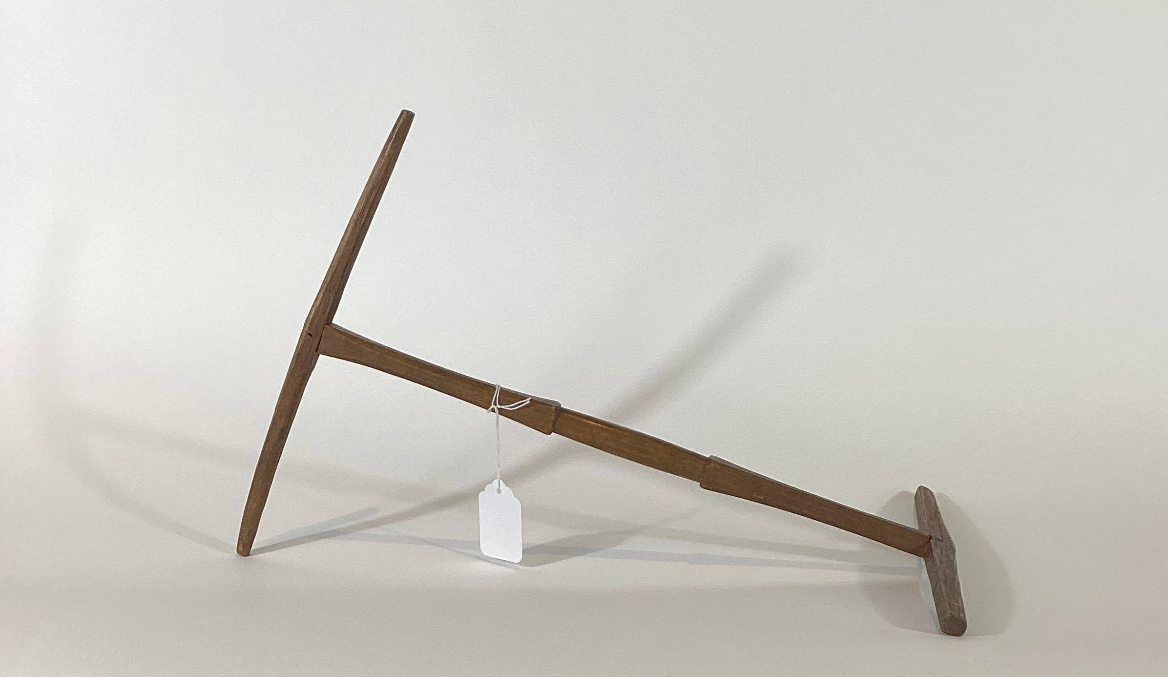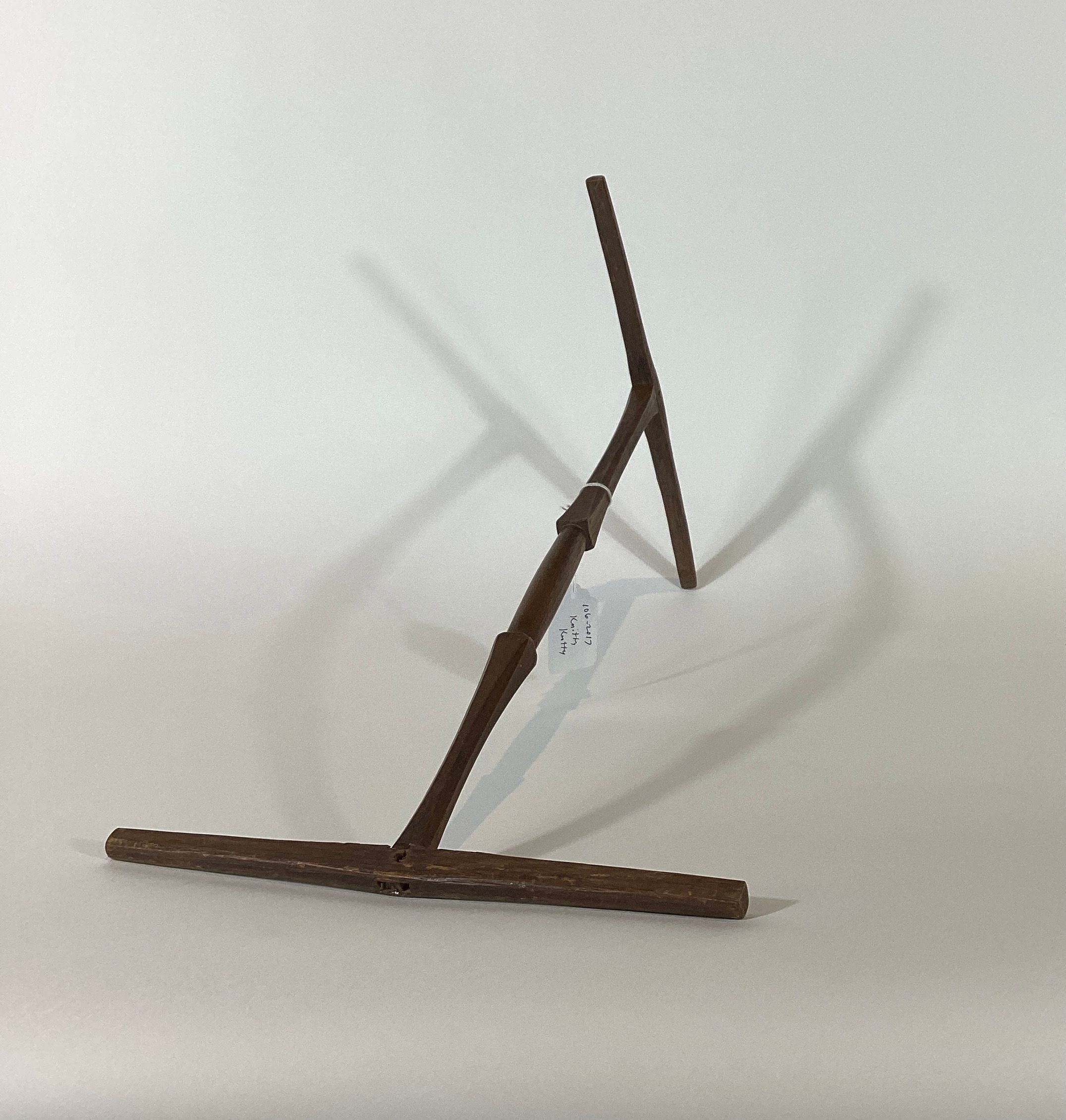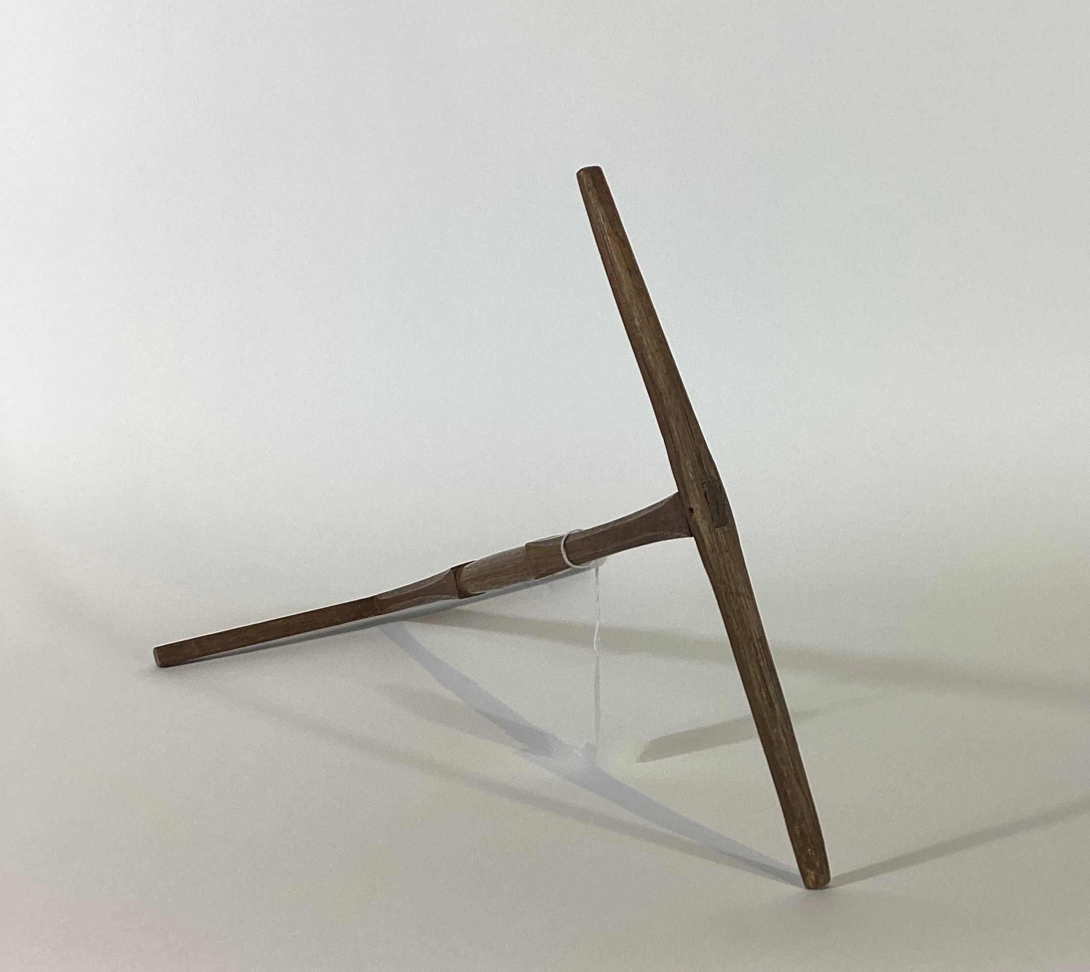 Niddy noddy composed of three pieces of wood joined together at right angles to each other.