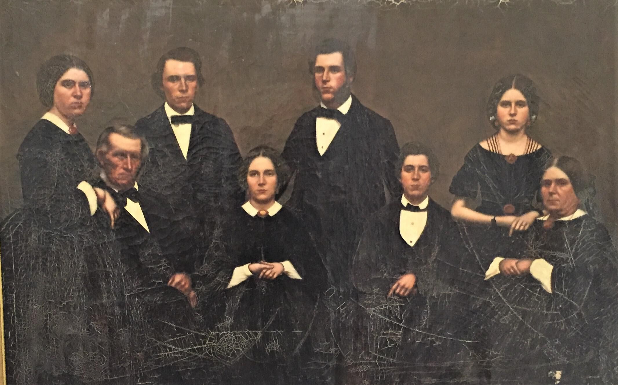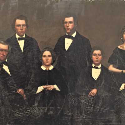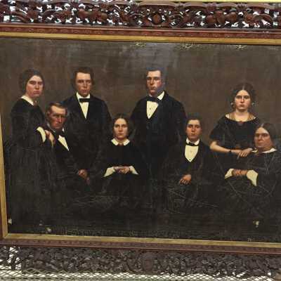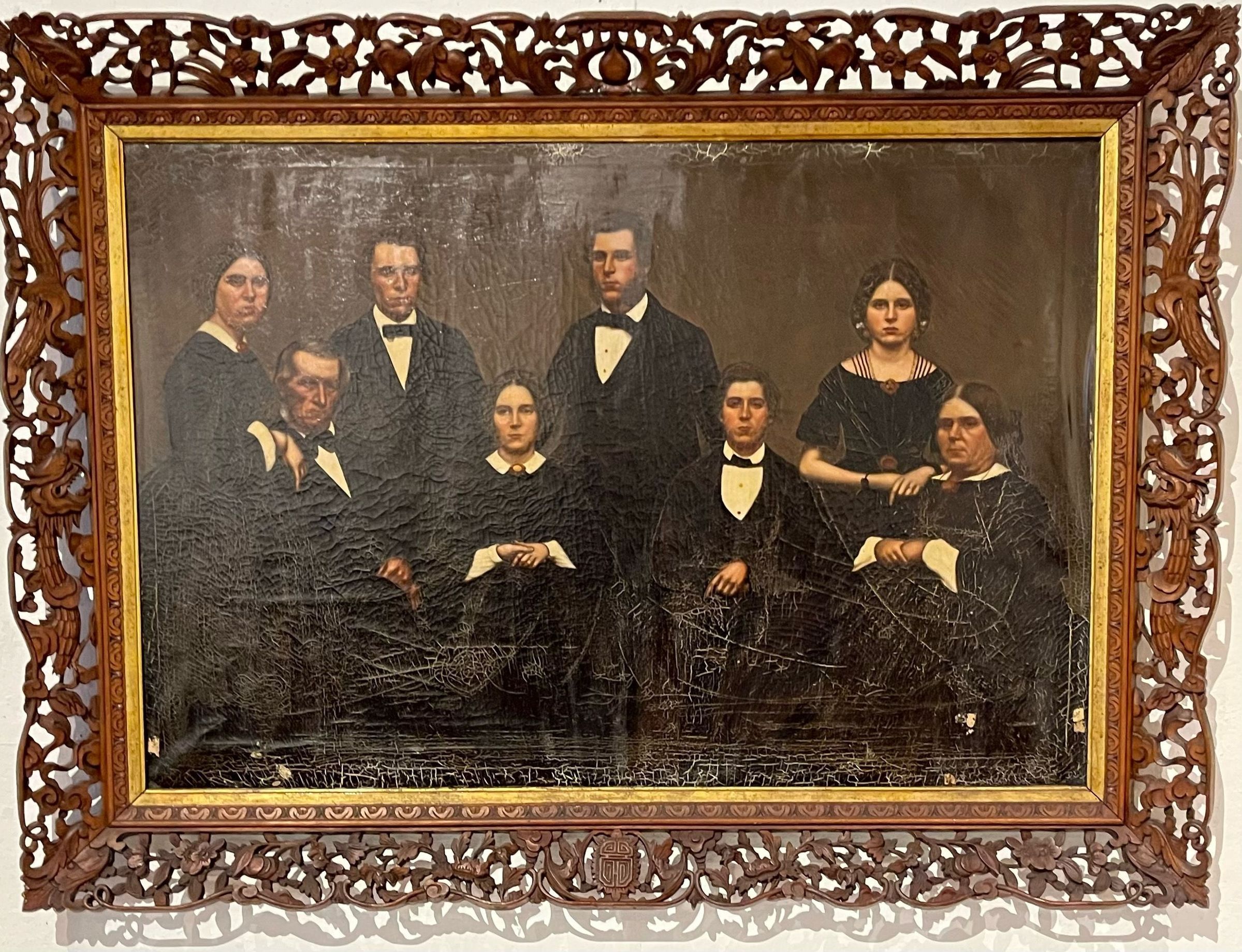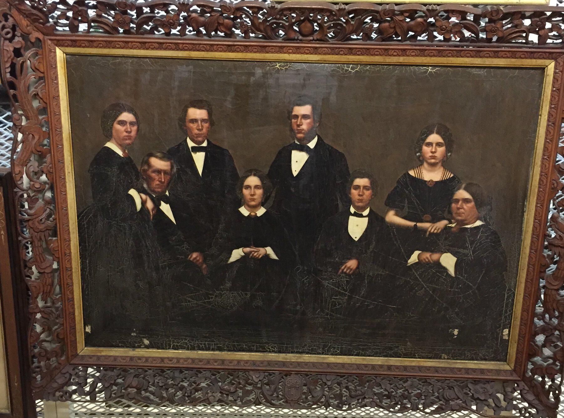 Large oil painting in teakwood frame of the Staples family of Old Orchard Beach. The painting was done by an artist in Hong Kong, circa 1861, and was based on tintype(s) or daguerreotype(s) of the family. From left to right: Mary Elizabeth Staples (Marston) (1832-1892), Ebenezer Cole Staples (1800-1895), Henry "Harry" William Staples (1838-1916), Josephine Staples (1840-1937), Franklin Gilpatric Staples (1836-1924), Charles Fayette Staples (1842-1923), Helena Addie Staples (1845-1909), Eliza (Buker) Staples (1804-1887).