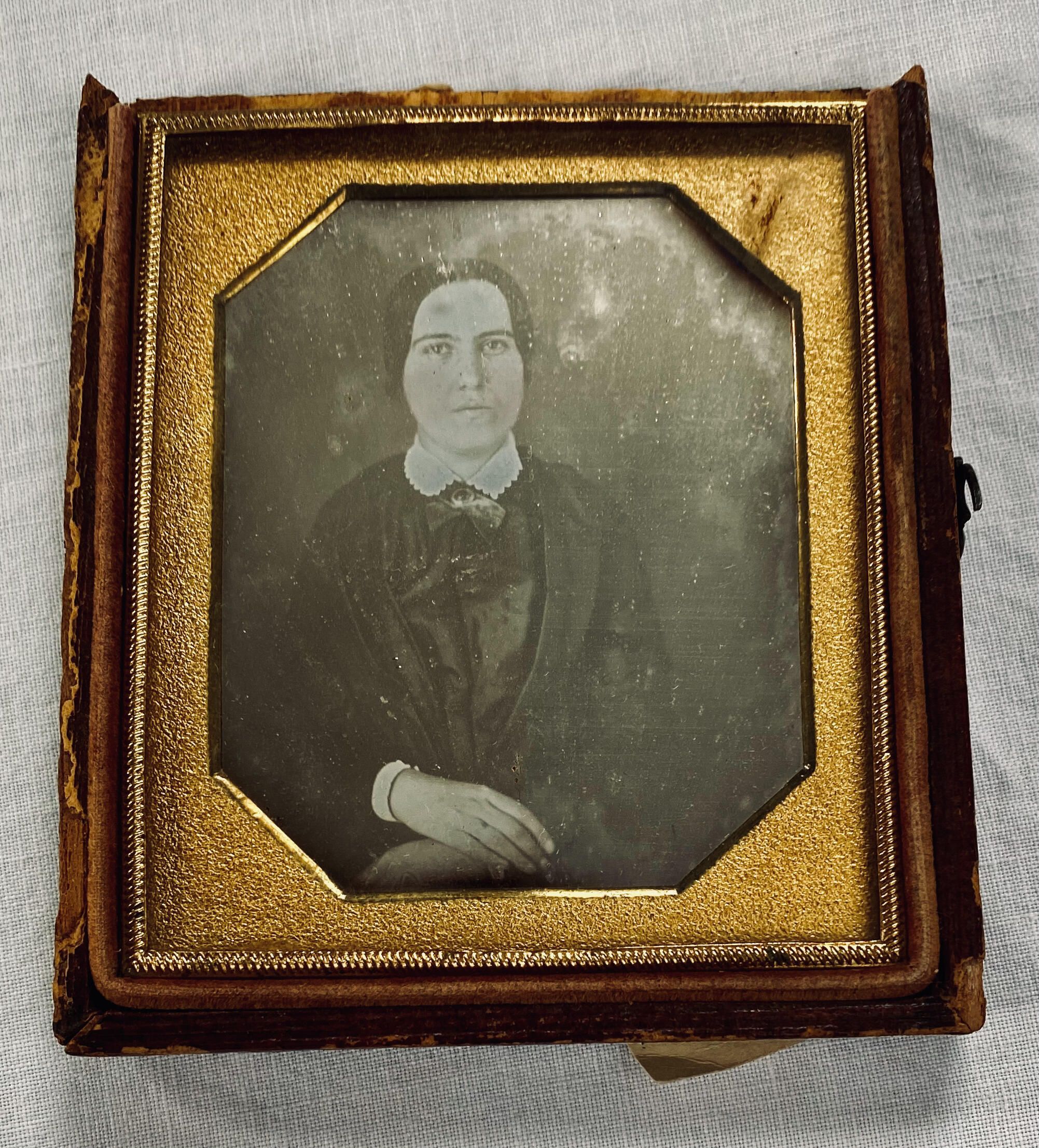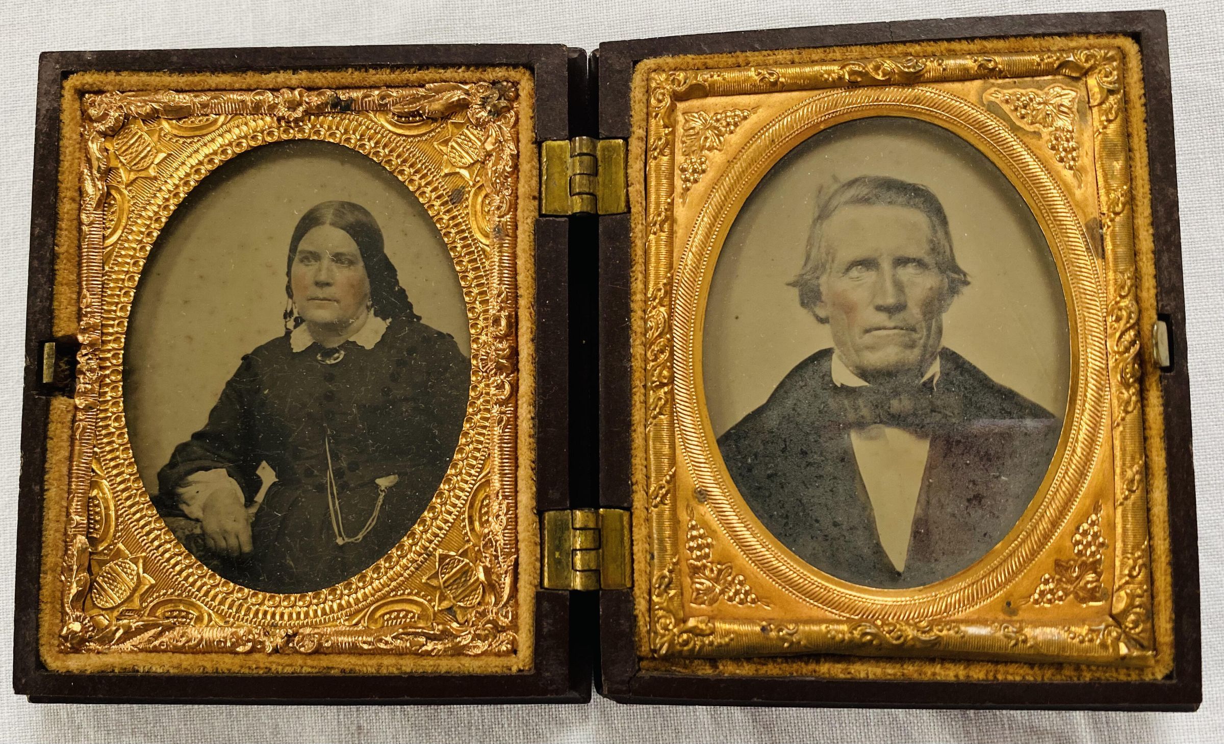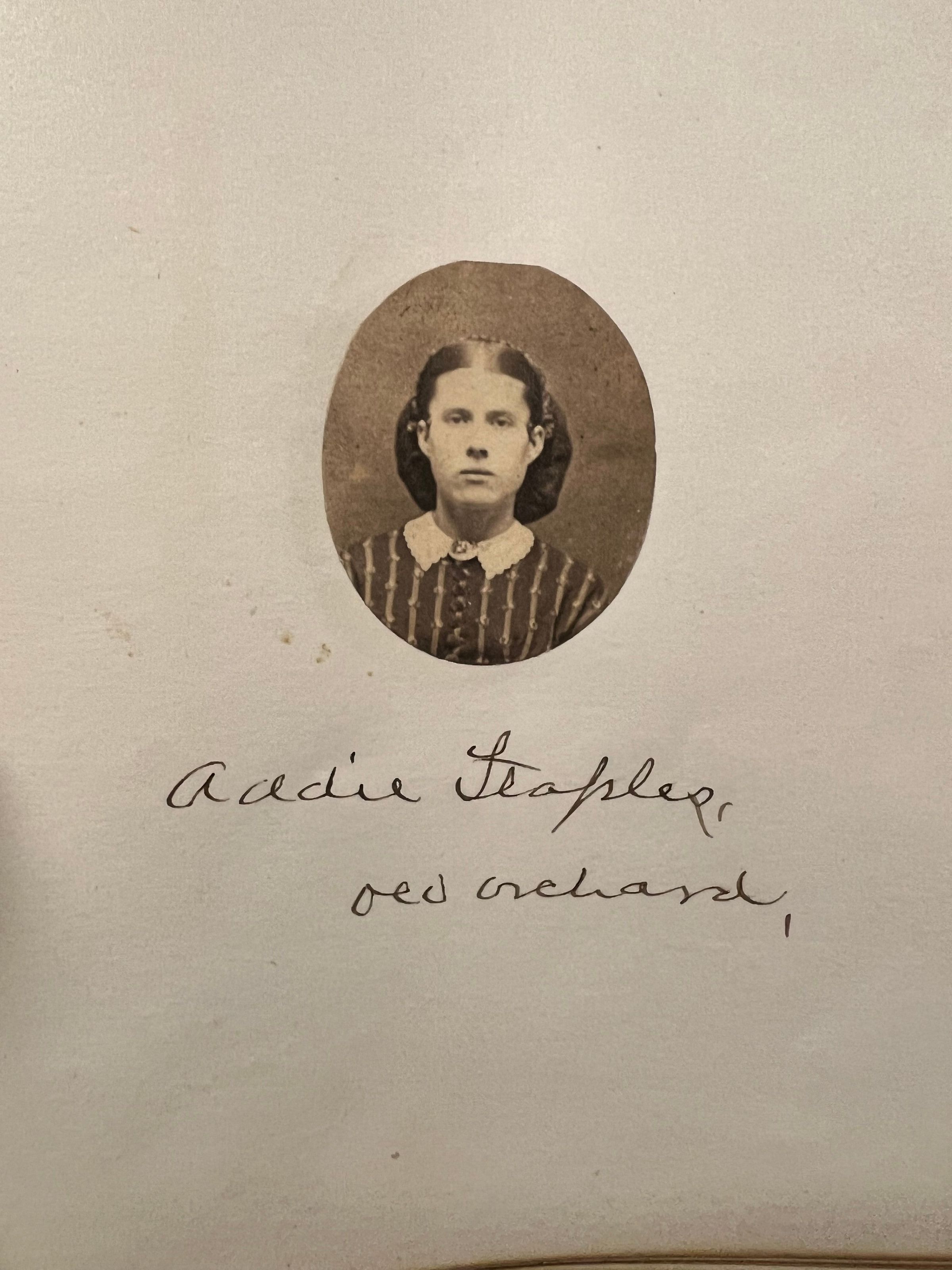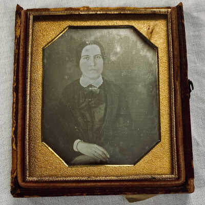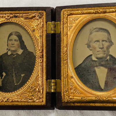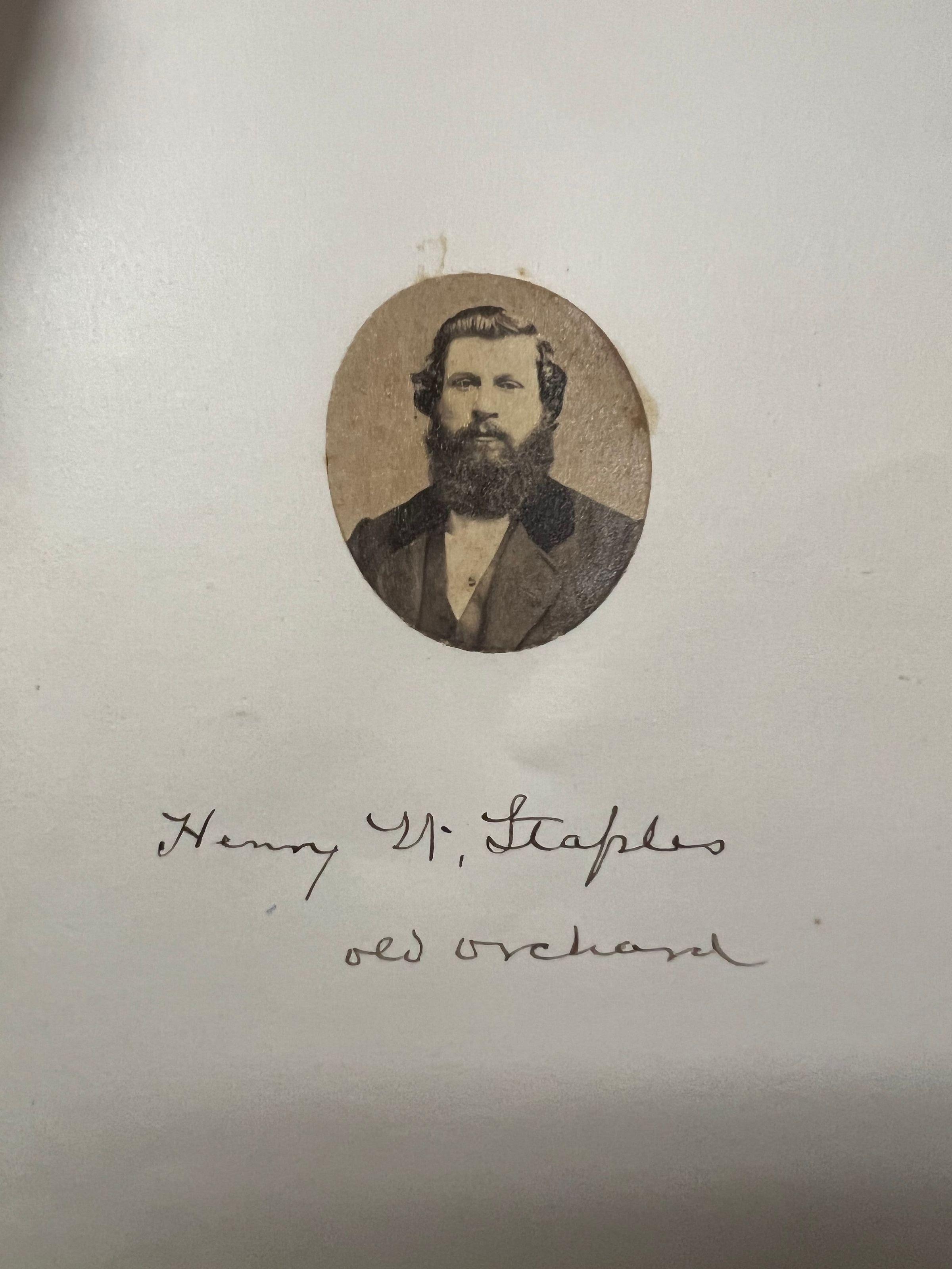 Large oil painting in teakwood frame of the Staples family of Old Orchard Beach. The painting was done by an artist in Hong Kong, circa 1861, and was based on tintype(s) or daguerreotype(s) of the family. From left to right: Mary Elizabeth Staples (Marston) (1832-1892), Ebenezer Cole Staples (1800-1895), Henry "Harry" William Staples (1838-1916), Josephine Staples (1840-1937), Franklin Gilpatric Staples (1836-1924), Charles Fayette Staples (1842-1923), Helena Addie Staples (1845-1909), Eliza (Buker) Staples (1804-1887).