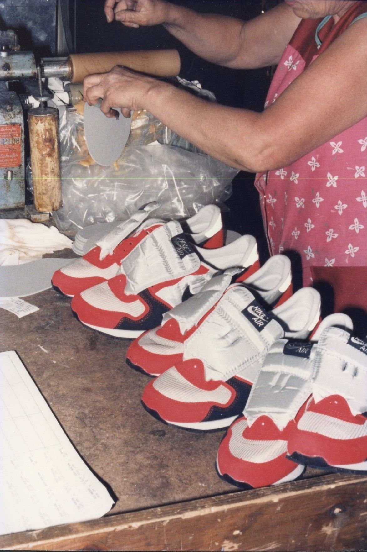 Color print photograph of Saco Nike Factory taken in July (or later), 1985. The Nike Factory located in Saco, Maine on Factory Island closed in November of 1985, about 8 years after it opened in 1978. The stated reason for closing was due to the increased labor cost and fringe benefits. After closing multiple American factories Nike focused on importing from Asia. 500 employees worked at the Saco Nike Factory, before shutting down.