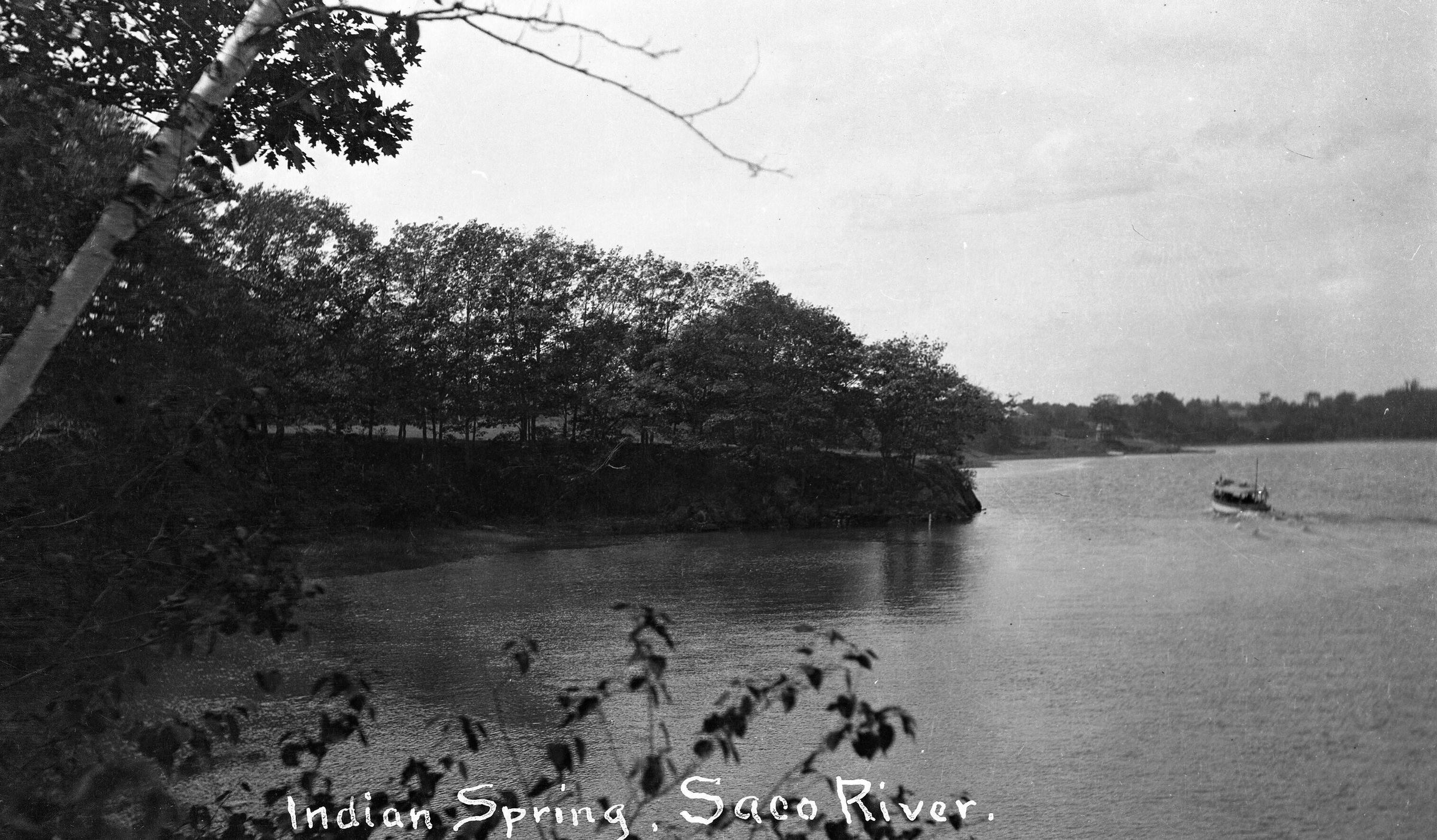 Negative print photo of Indian Spring at the Saco River. An outcropping adjacent to the "Town Landing" pier behind St. Francis College and High School (current UNE campus) at Biddeford Pool was known locally as "Indian Spring."Made/Created