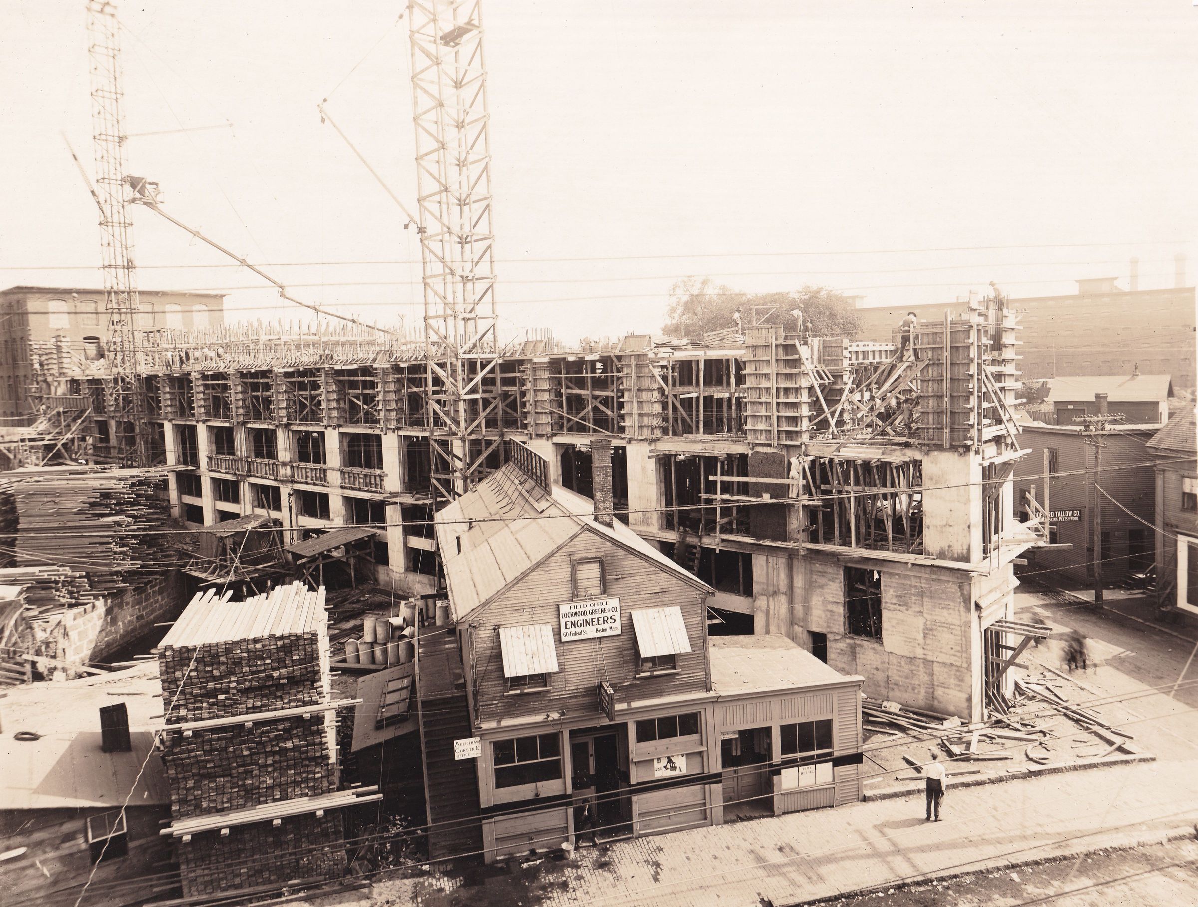 Construction of the "New Shop" for Saco-Lowell. Looking toward Saco and showing the older shops to which the new five-story building was connected. They were attached in such a way that the interiors were continuous. To the right, up Smith Street, was the Pepperell Manufacturing Company's cotton storehouse on Pearl Street. The sign on the old building being used as a construction shed reads: FIELD OFFICE / LOCKWOOD GREEN & CO / ENGINEERS / 60 FEDERAL STREET / BOSTON.Made/Created