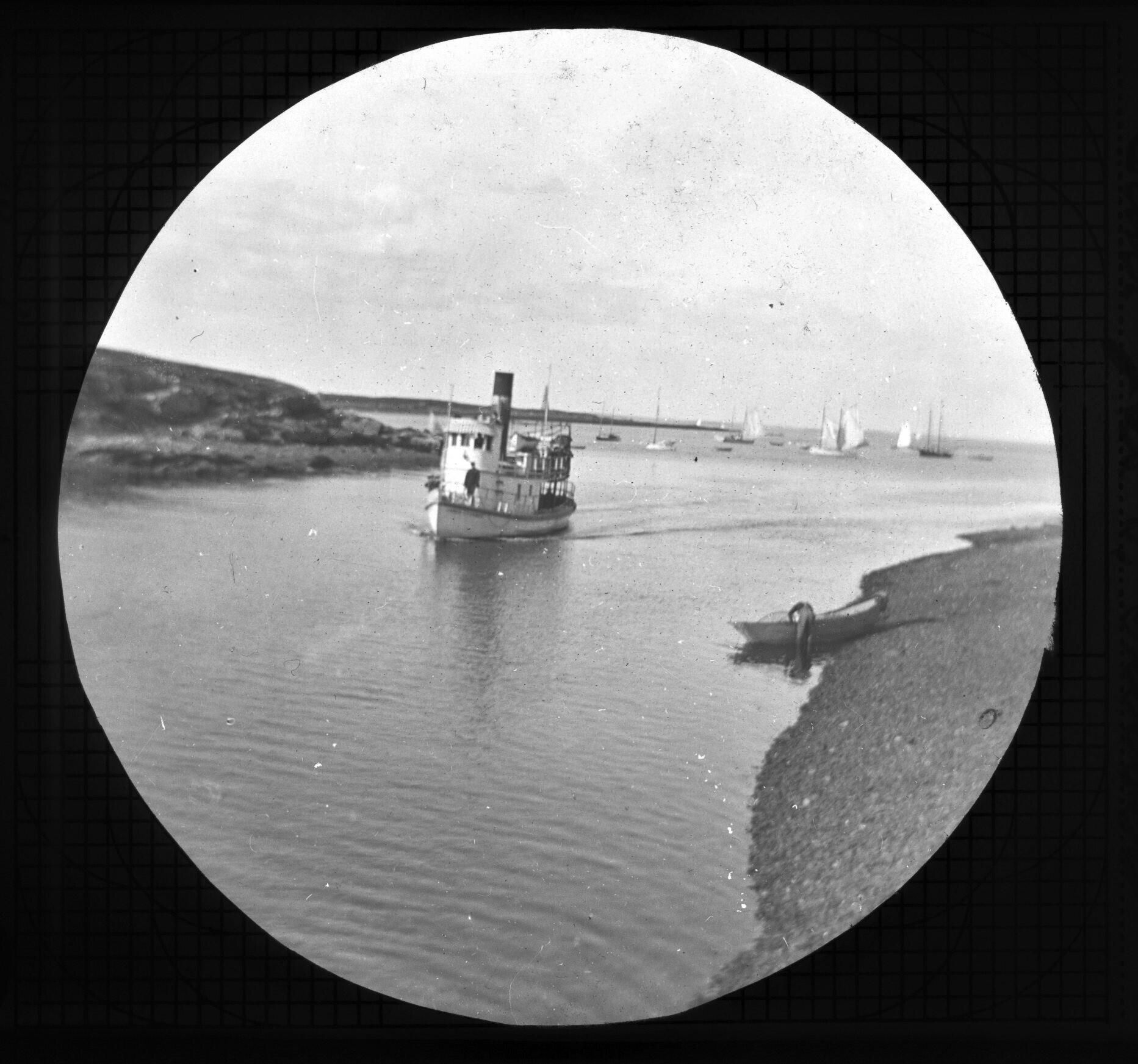 Glass lantern slide photograph of the steamer The James T. Furber. "Steamer James T. Furber at Biddeford Pool" is written on the label on the plate. The boat was named after James T. Furber of Portland, General Manager of the Boston & Maine Railroad.