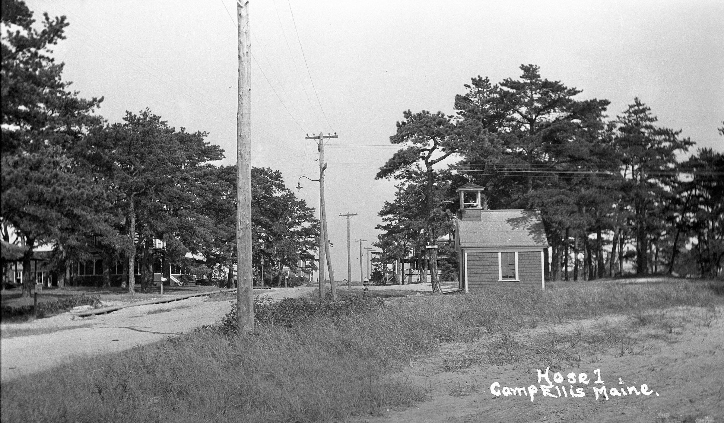 Negative print photo of fire hose station hut "Hose 1" at Camp Ellis, ME.