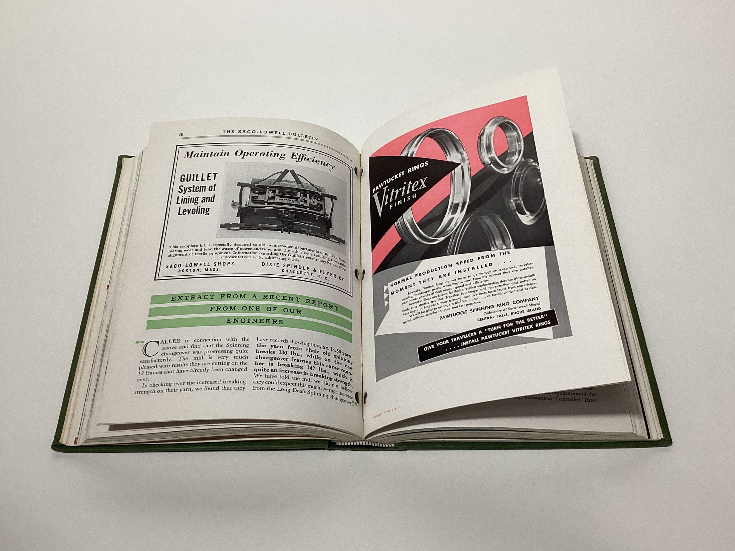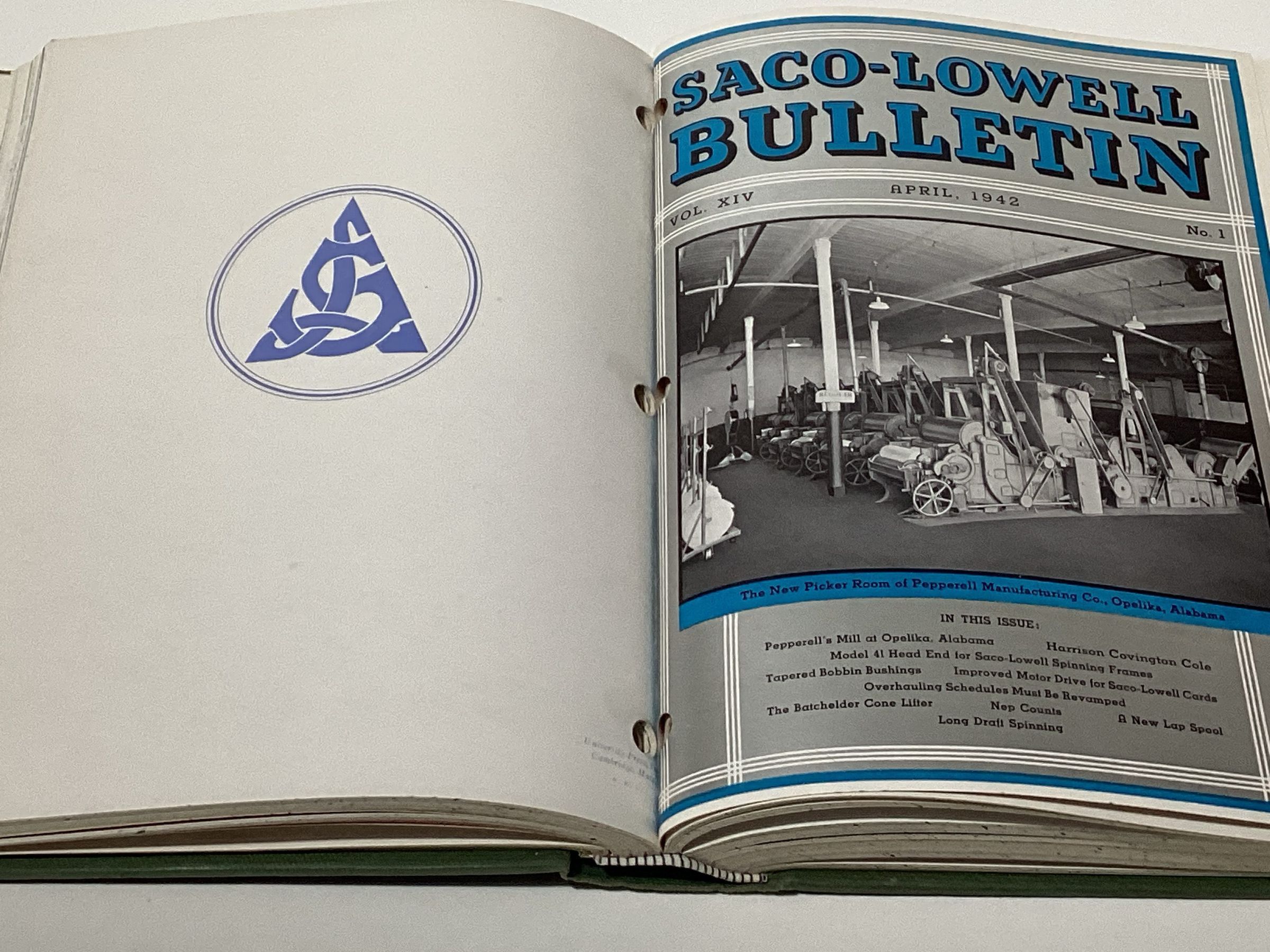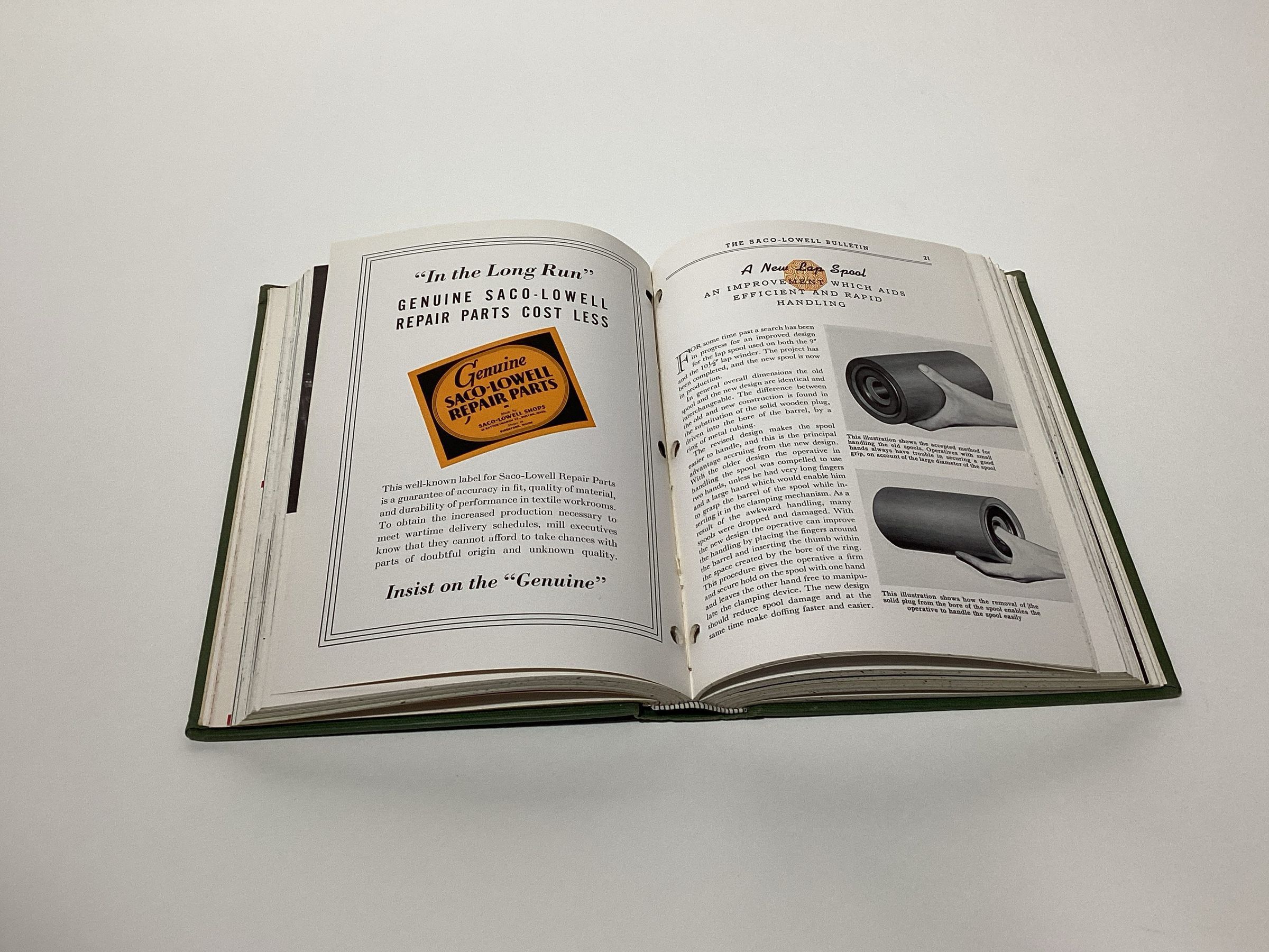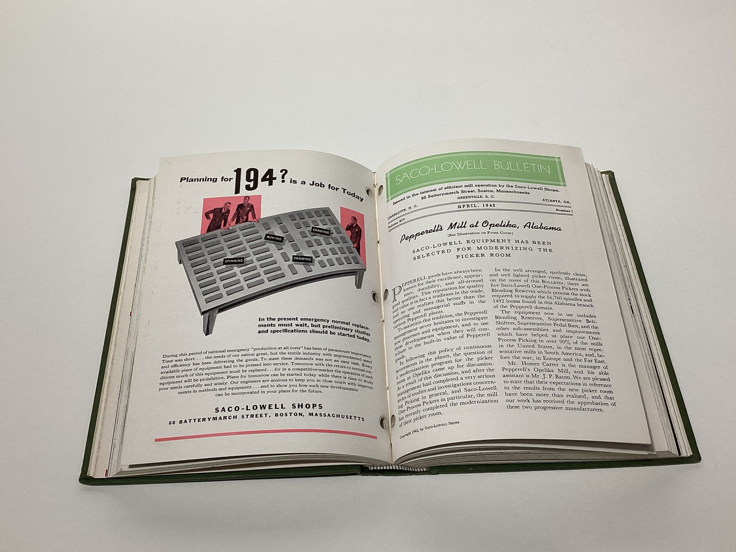 Bound edition of Saco-Lowell Shop Bulletins published from 1941 to 1944. The Bulletin was a periodical published for workers of the Saco-Lowell Shops. News of the New England Saco-Lowell shops were covered in these periodicals.