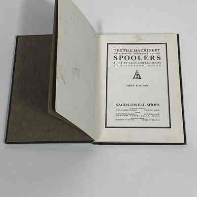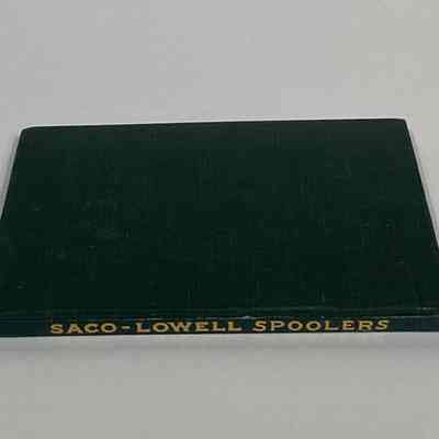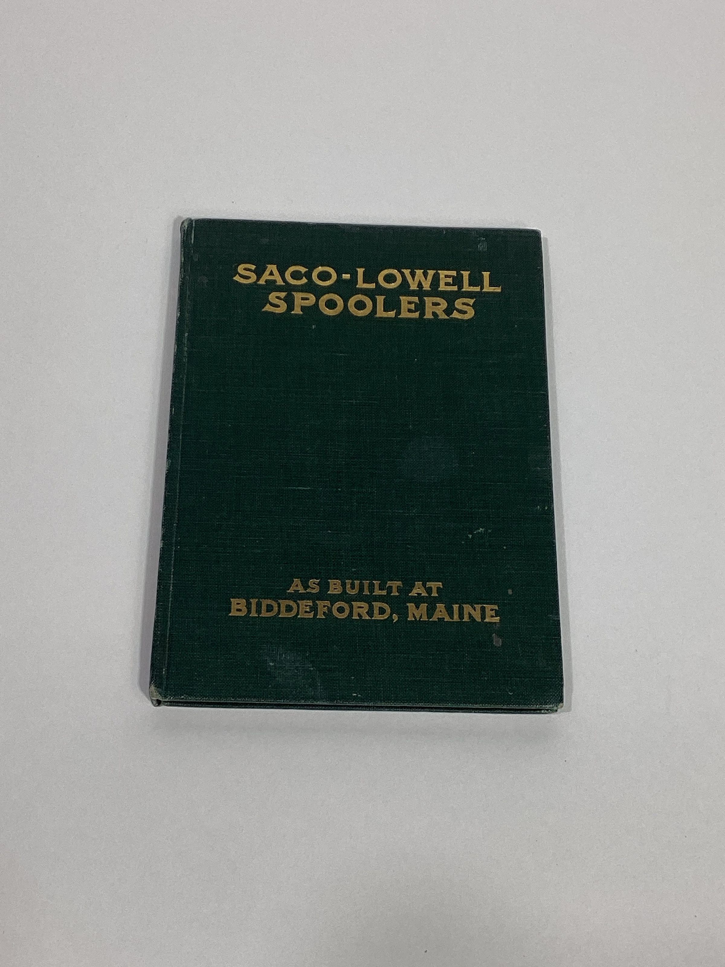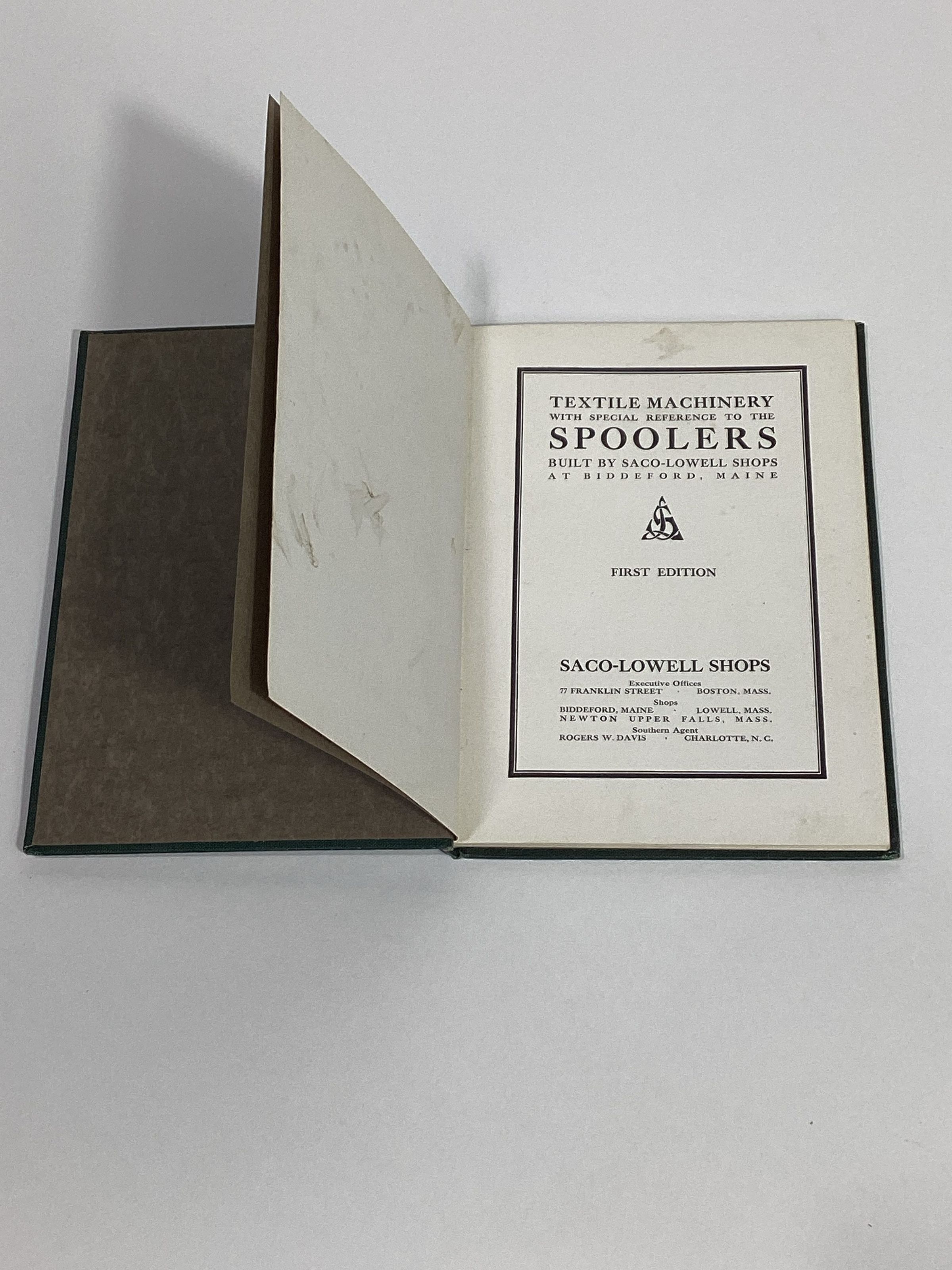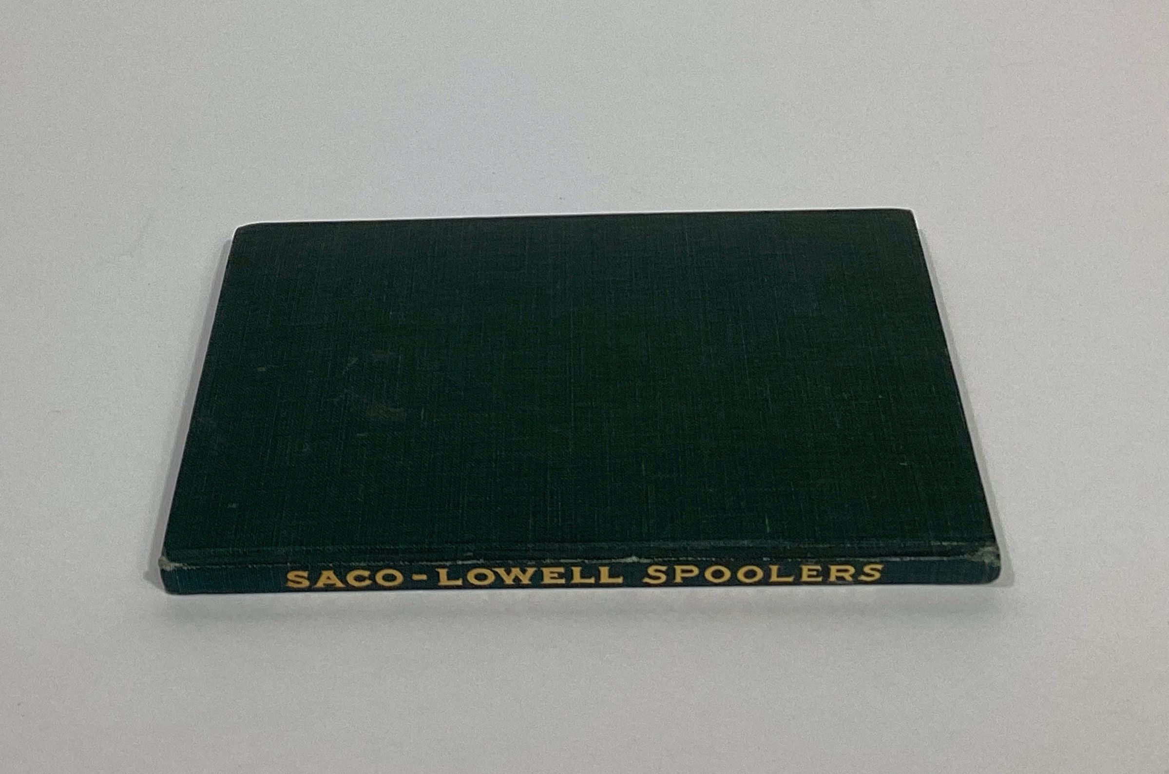 Small book with a green cloth cover with gold lettering on cover and spine. It includes definitions, spindle information, production tables, and other specifications of spooler machinery made by the Saco-Lowell Company.