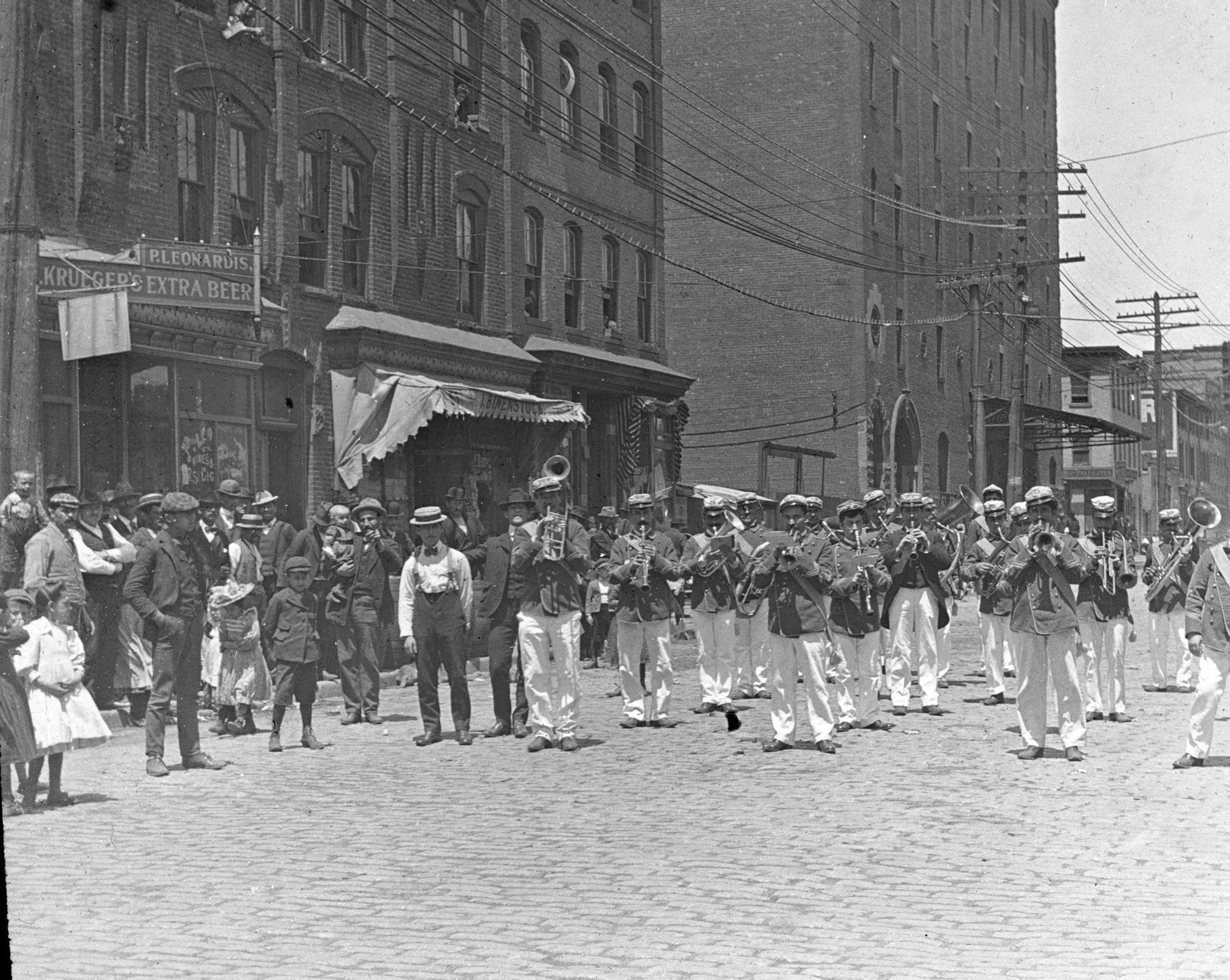 Glass lantern slide of a marching band parading down a street, probably somewhere in Newark, NJ.