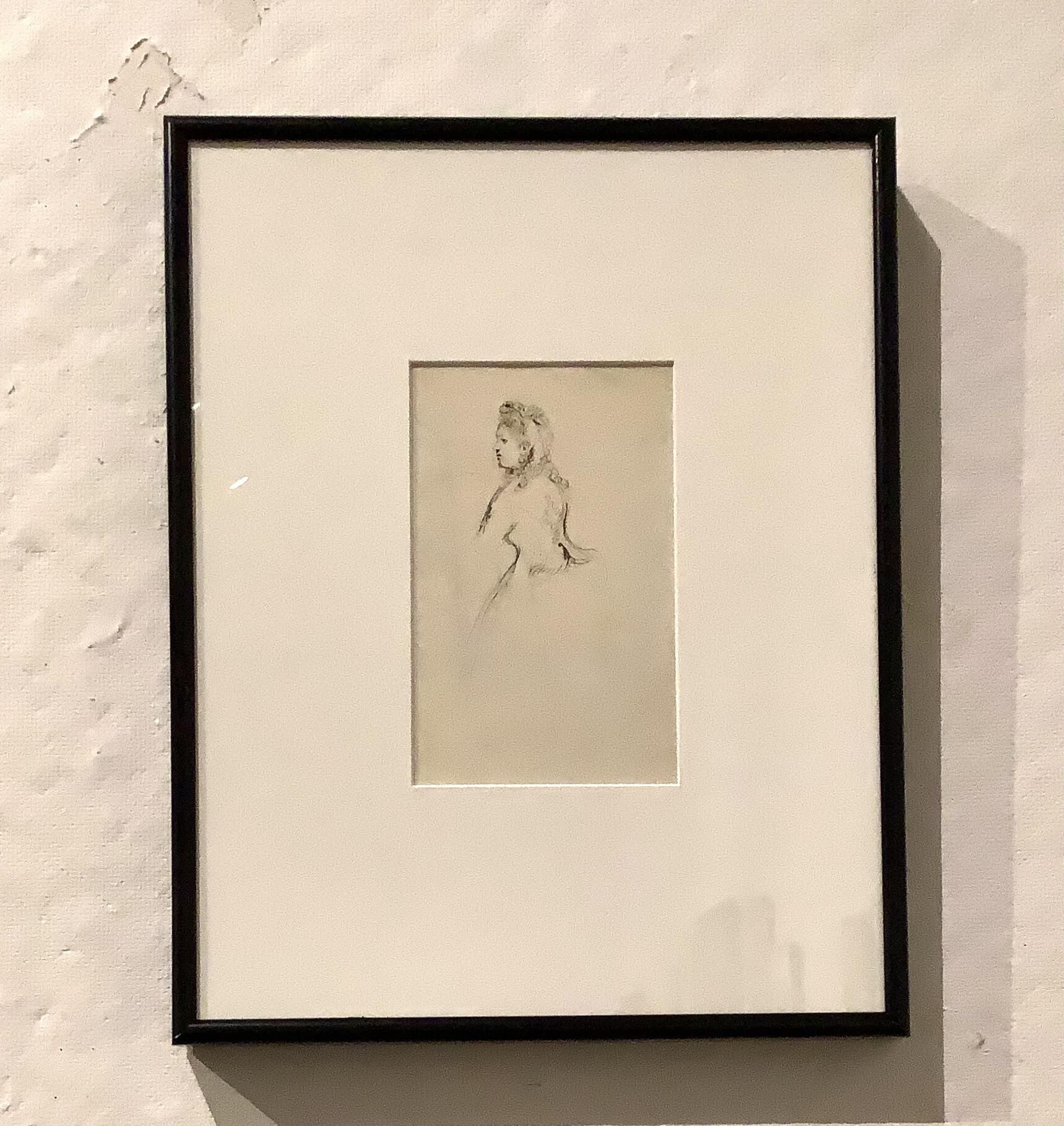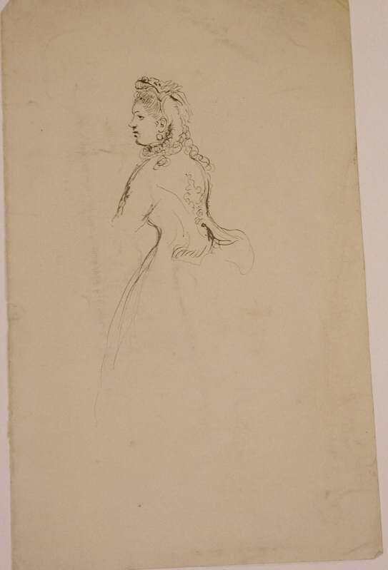 Pen and ink drawing of a woman viewed from the back. She is looking over her left shoulder. She appears to wear her hair in long curls. The details of the bodice of her dress and the upper part of the bustle are drawn in, as is the front of her skirt, but the remainder is unfinished.Made/Created