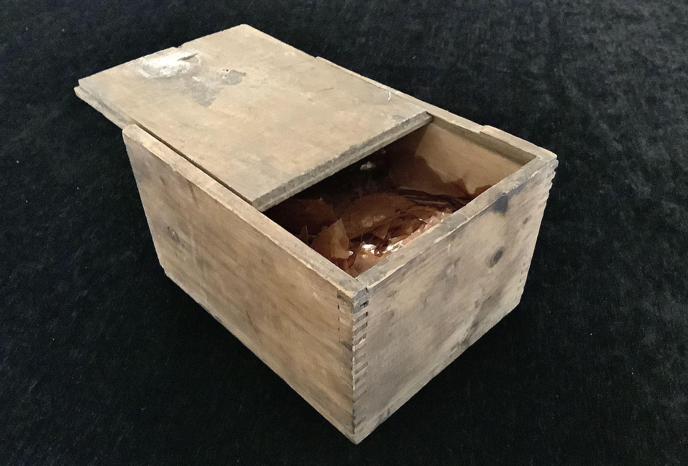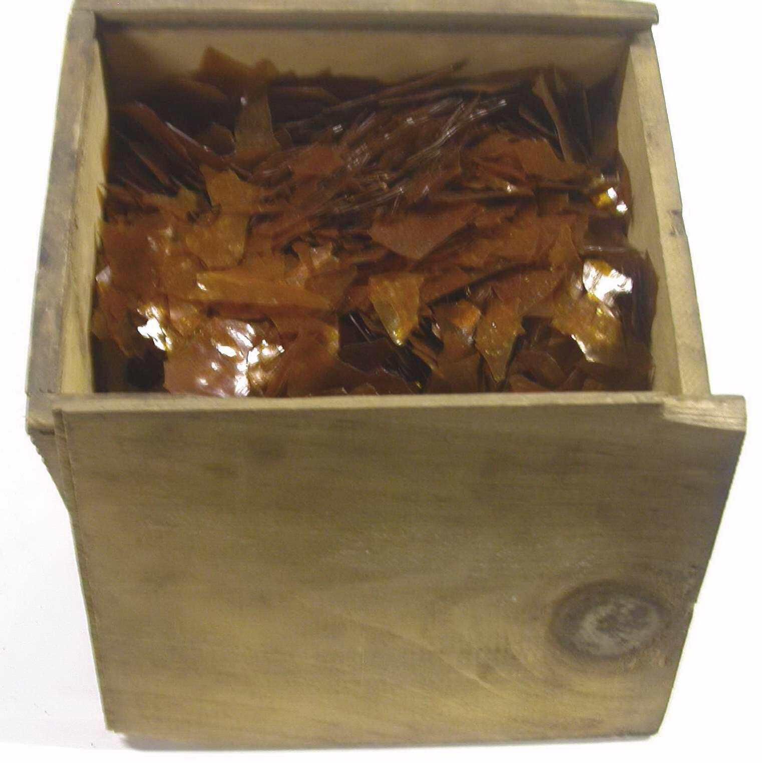 Wooden box with a sliding lid filled with orange-colored shellac flakes.