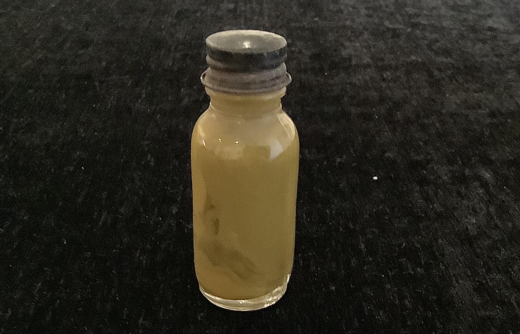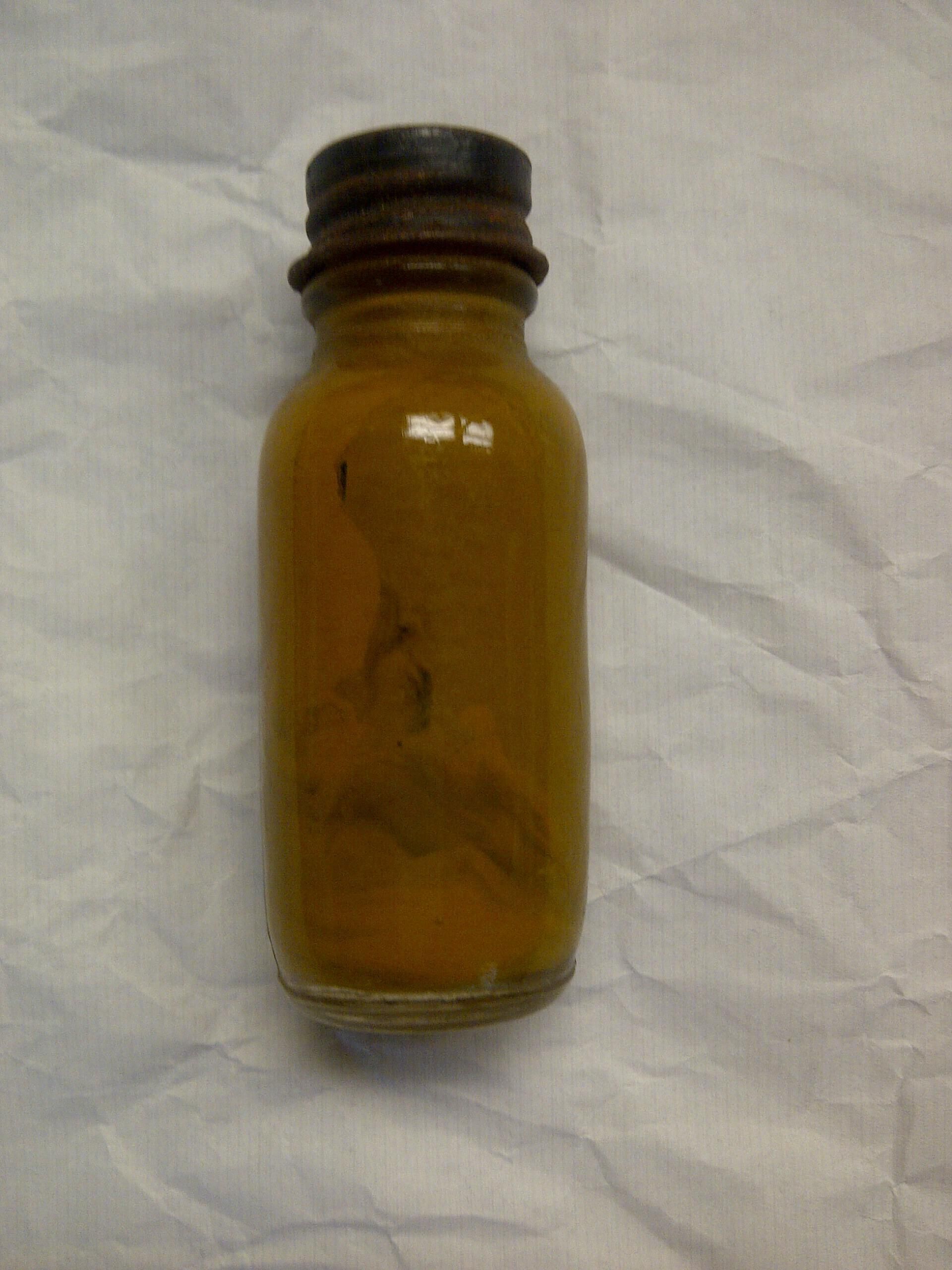 Small round clear colorless glass bottle with a black metal screw cap that contains a ground orange pigment.