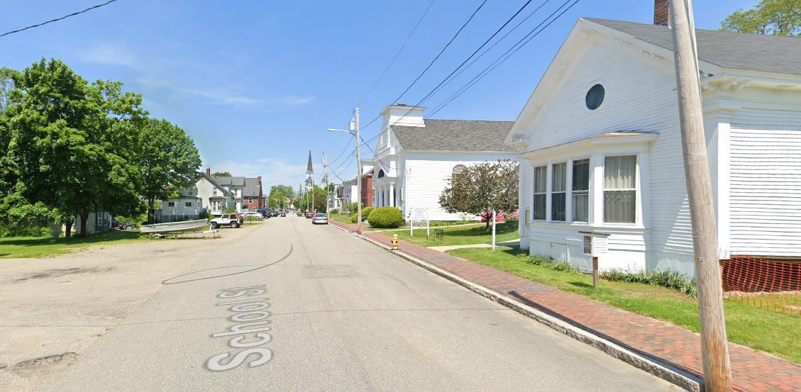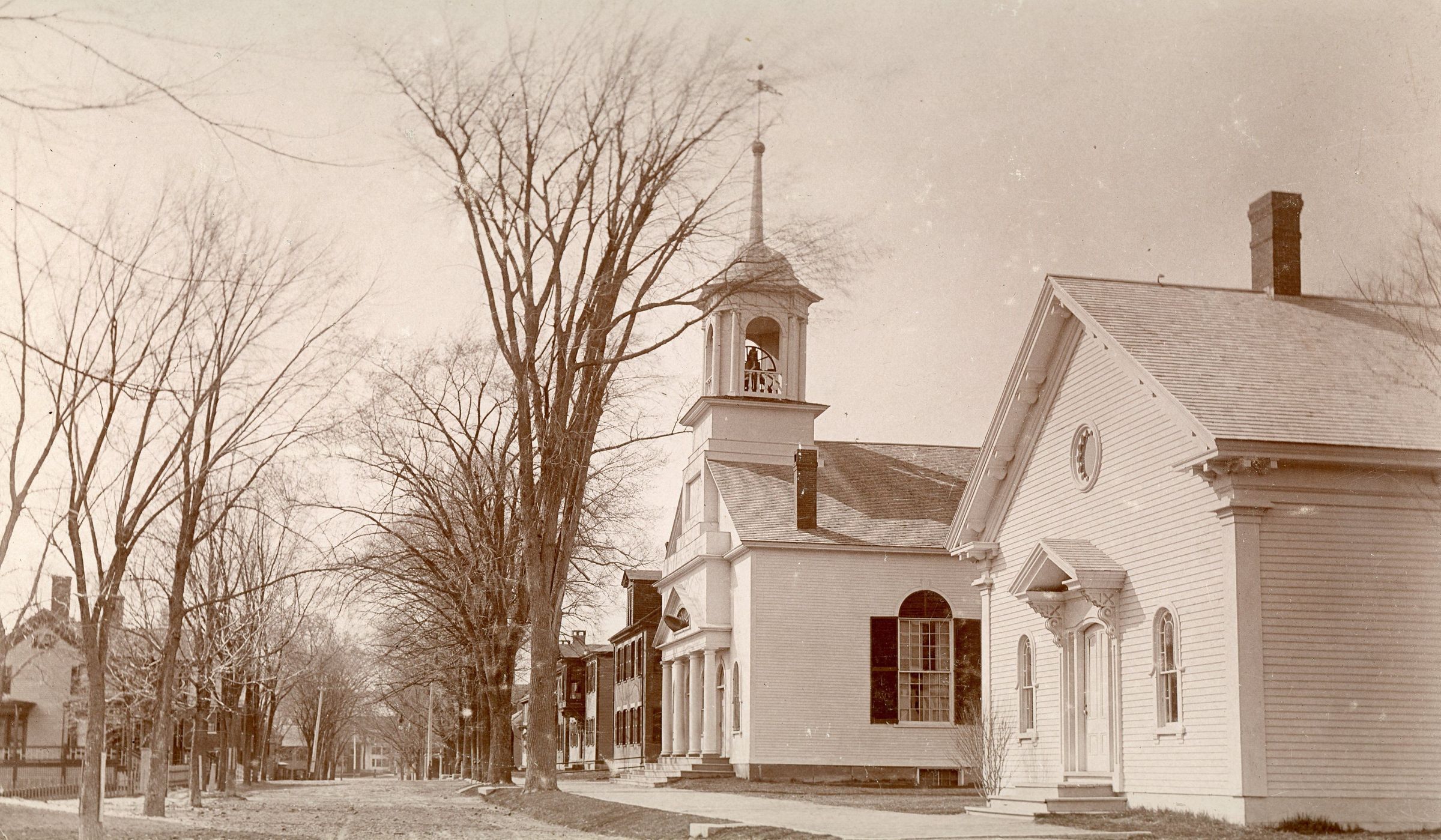 A photograph print of the Unitarian Church and Vestry (house on the right) on School Street. Pepperell Cemetery was located just behind the church and vestry. "1895" and "1896" is written on the back of the photo.