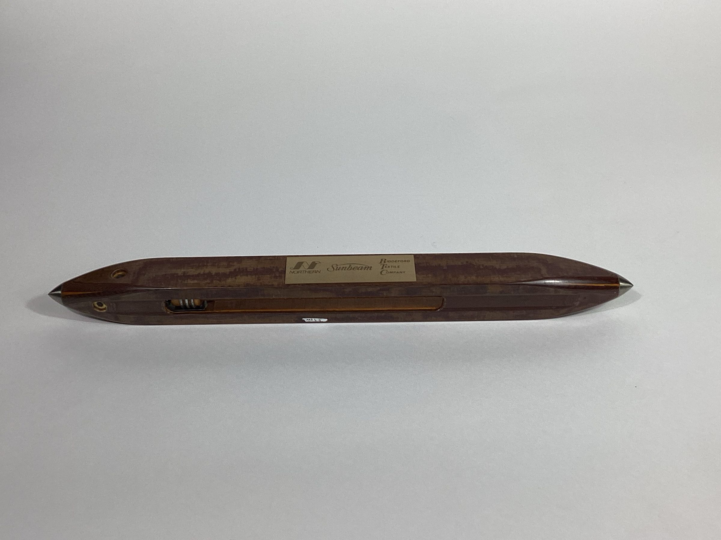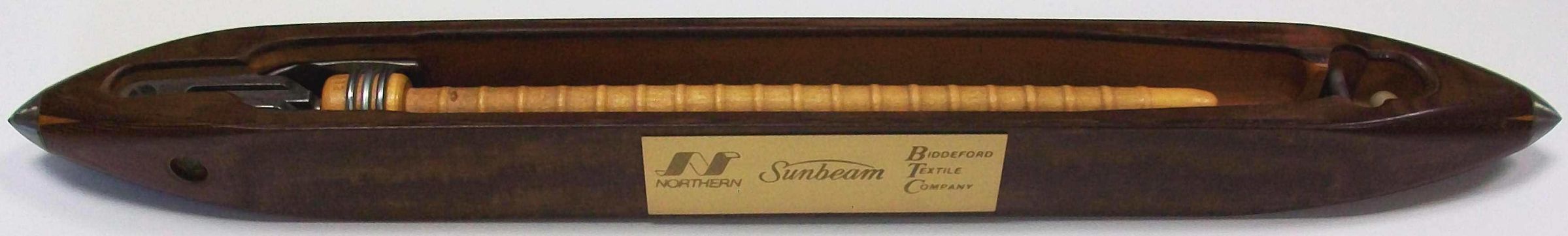 Power loom shuttle. Attached to the side is a brass plaque that reads: "Northern / Sunbeam / Biddeford Textile Company".